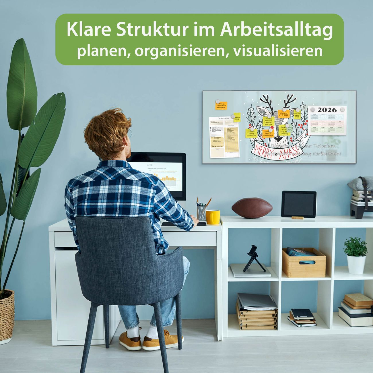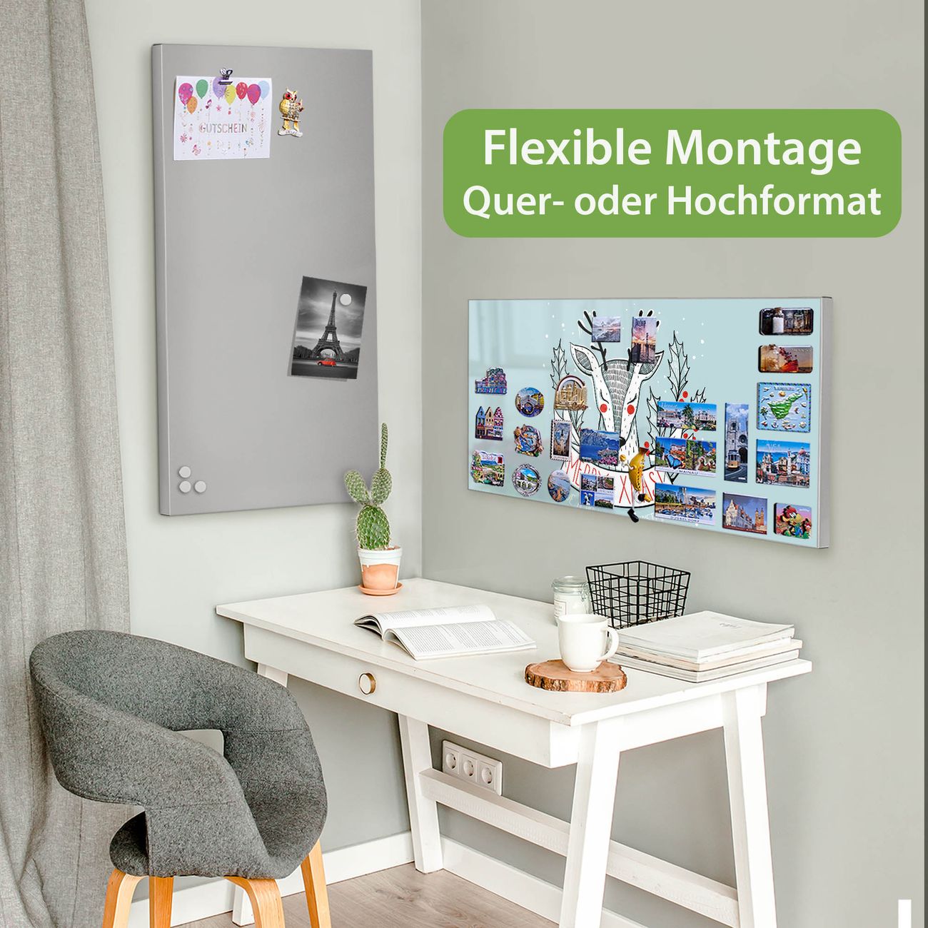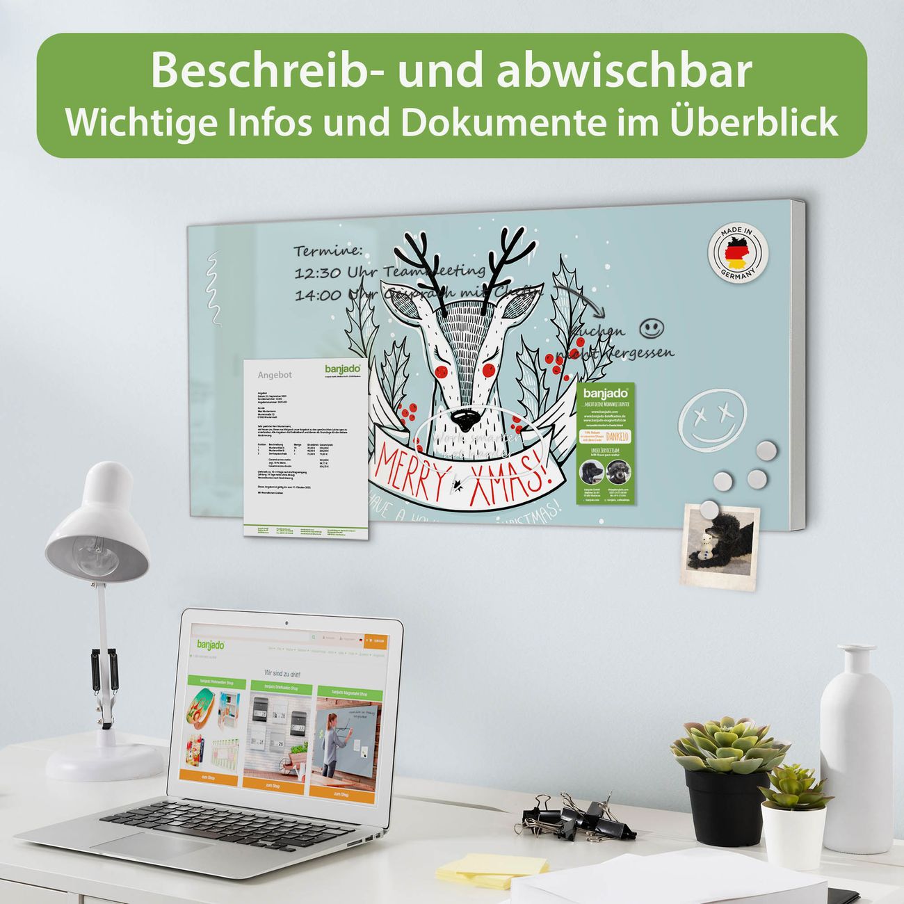 FUNKTION: Die banjado Magnettafel 78x37 cm im Design Motiv Rentier vereint Funktionalität und modernes Wohndesign auf stilvolle Weise. Diese hochwertige Magnetwand aus Metall hilft Ihnen dabei, Notizen, Fotos, Termine, Einkaufslisten oder Rezepte übersichtlich zu organisieren. Als praktisches Memoboard sorgt sie für Struktur im Alltag und setzt gleichzeitig einen dekorativen Akzent an Ihrer Wand. DESIGN: Die Metalltafel besteht aus robustem, lackiertem Stahl und ist mit allen handelsüblichen Magneten nutzbar. Besonders praktisch ist die beschreibbare Oberfläche. Sie können die Magnettafel ganz einfach mit Kreidestiften beschriften und die Inhalte bei Bedarf mit einem feuchten Tuch wieder entfernen. So eignet sich das Memoboard ideal für Wochenpläne, Menüpläne, To Do Listen oder kreative Botschaften. DETAILS: Mit ihrem großzügigen Querformat von 78x37 cm bietet die Magnettafel ausreichend Platz für Ihre Organisation. Das Motiv Motiv Rentier bringt eine warme, natürliche Optik in Küche, Flur, Büro oder Homeoffice und wirkt auch ohne Magnete oder Beschriftung wie ein modernes Wandbild. NUTZEN: Auf der Rückseite befinden sich vorgefertigte Löcher für eine schnelle und unkomplizierte Wandmontage. Jede banjado Magnettafel wird in Deutschland gefertigt und steht für Qualität, Langlebigkeit und liebevolle Verarbeitung. Dieses beschreibbare Memoboard ist die perfekte Kombination aus Metalltafel, Designobjekt und praktischer Magnetwand für Ihren Alltag. BANJADO: Wir sind ein kleines Team aus dem Herzen von Sachsen. Wir fertigen alle Artikel von Hand für Sie an, Sie erhalten keine preiswerte Importware. Auf Wunsch können Sie auch Ihr eigenes Foto auf die Magnettafel aufbringen, schreiben Sie uns an. Herzlichst, Ihr banjado-Team