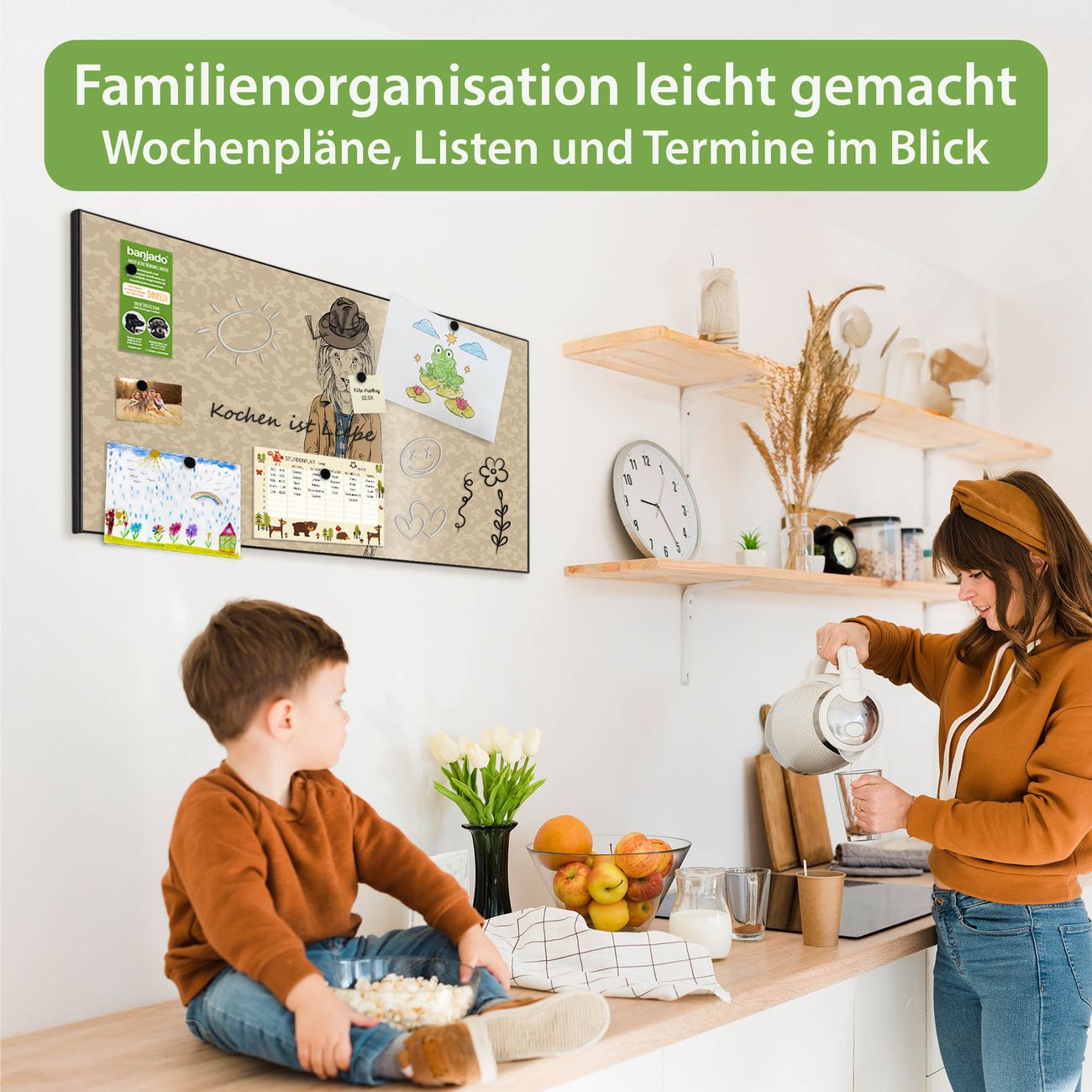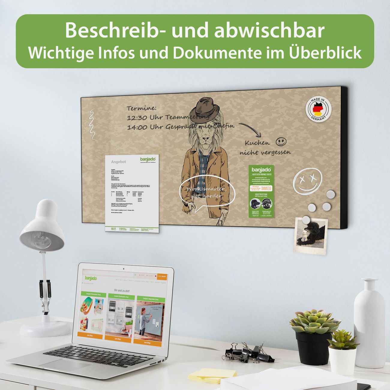 FUNKTION: Die banjado Magnettafel 78x37 cm im Design Motiv Retro Style vereint Funktionalität und modernes Wohndesign auf stilvolle Weise. Diese hochwertige Magnetwand aus Metall hilft Ihnen dabei, Notizen, Fotos, Termine, Einkaufslisten oder Rezepte übersichtlich zu organisieren. Als praktisches Memoboard sorgt sie für Struktur im Alltag und setzt gleichzeitig einen dekorativen Akzent an Ihrer Wand. DESIGN: Die Metalltafel besteht aus robustem, lackiertem Stahl und ist mit allen handelsüblichen Magneten nutzbar. Besonders praktisch ist die beschreibbare Oberfläche. Sie können die Magnettafel ganz einfach mit Kreidestiften beschriften und die Inhalte bei Bedarf mit einem feuchten Tuch wieder entfernen. So eignet sich das Memoboard ideal für Wochenpläne, Menüpläne, To Do Listen oder kreative Botschaften. DETAILS: Mit ihrem großzügigen Querformat von 78x37 cm bietet die Magnettafel ausreichend Platz für Ihre Organisation. Das Motiv Motiv Retro Style bringt eine warme, natürliche Optik in Küche, Flur, Büro oder Homeoffice und wirkt auch ohne Magnete oder Beschriftung wie ein modernes Wandbild. NUTZEN: Auf der Rückseite befinden sich vorgefertigte Löcher für eine schnelle und unkomplizierte Wandmontage. Jede banjado Magnettafel wird in Deutschland gefertigt und steht für Qualität, Langlebigkeit und liebevolle Verarbeitung. Dieses beschreibbare Memoboard ist die perfekte Kombination aus Metalltafel, Designobjekt und praktischer Magnetwand für Ihren Alltag. BANJADO: Wir sind ein kleines Team aus dem Herzen von Sachsen. Wir fertigen alle Artikel von Hand für Sie an, Sie erhalten keine preiswerte Importware. Auf Wunsch können Sie auch Ihr eigenes Foto auf die Magnettafel aufbringen, schreiben Sie uns an. Herzlichst, Ihr banjado-Team