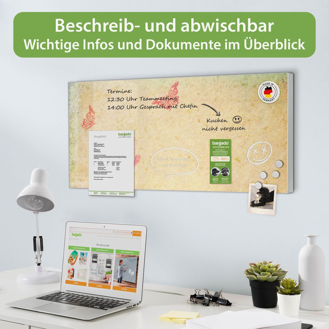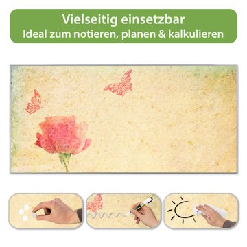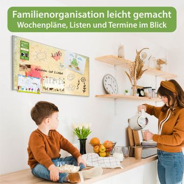 FUNKTION: Die banjado Magnettafel 78x37 cm im Design Motiv Romantik vereint Funktionalität und modernes Wohndesign auf stilvolle Weise. Diese hochwertige Magnetwand aus Metall hilft Ihnen dabei, Notizen, Fotos, Termine, Einkaufslisten oder Rezepte übersichtlich zu organisieren. Als praktisches Memoboard sorgt sie für Struktur im Alltag und setzt gleichzeitig einen dekorativen Akzent an Ihrer Wand. DESIGN: Die Metalltafel besteht aus robustem, lackiertem Stahl und ist mit allen handelsüblichen Magneten nutzbar. Besonders praktisch ist die beschreibbare Oberfläche. Sie können die Magnettafel ganz einfach mit Kreidestiften beschriften und die Inhalte bei Bedarf mit einem feuchten Tuch wieder entfernen. So eignet sich das Memoboard ideal für Wochenpläne, Menüpläne, To Do Listen oder kreative Botschaften. DETAILS: Mit ihrem großzügigen Querformat von 78x37 cm bietet die Magnettafel ausreichend Platz für Ihre Organisation. Das Motiv Motiv Romantik bringt eine warme, natürliche Optik in Küche, Flur, Büro oder Homeoffice und wirkt auch ohne Magnete oder Beschriftung wie ein modernes Wandbild. NUTZEN: Auf der Rückseite befinden sich vorgefertigte Löcher für eine schnelle und unkomplizierte Wandmontage. Jede banjado Magnettafel wird in Deutschland gefertigt und steht für Qualität, Langlebigkeit und liebevolle Verarbeitung. Dieses beschreibbare Memoboard ist die perfekte Kombination aus Metalltafel, Designobjekt und praktischer Magnetwand für Ihren Alltag. BANJADO: Wir sind ein kleines Team aus dem Herzen von Sachsen. Wir fertigen alle Artikel von Hand für Sie an, Sie erhalten keine preiswerte Importware. Auf Wunsch können Sie auch Ihr eigenes Foto auf die Magnettafel aufbringen, schreiben Sie uns an. Herzlichst, Ihr banjado-Team