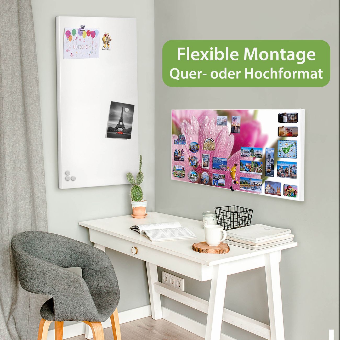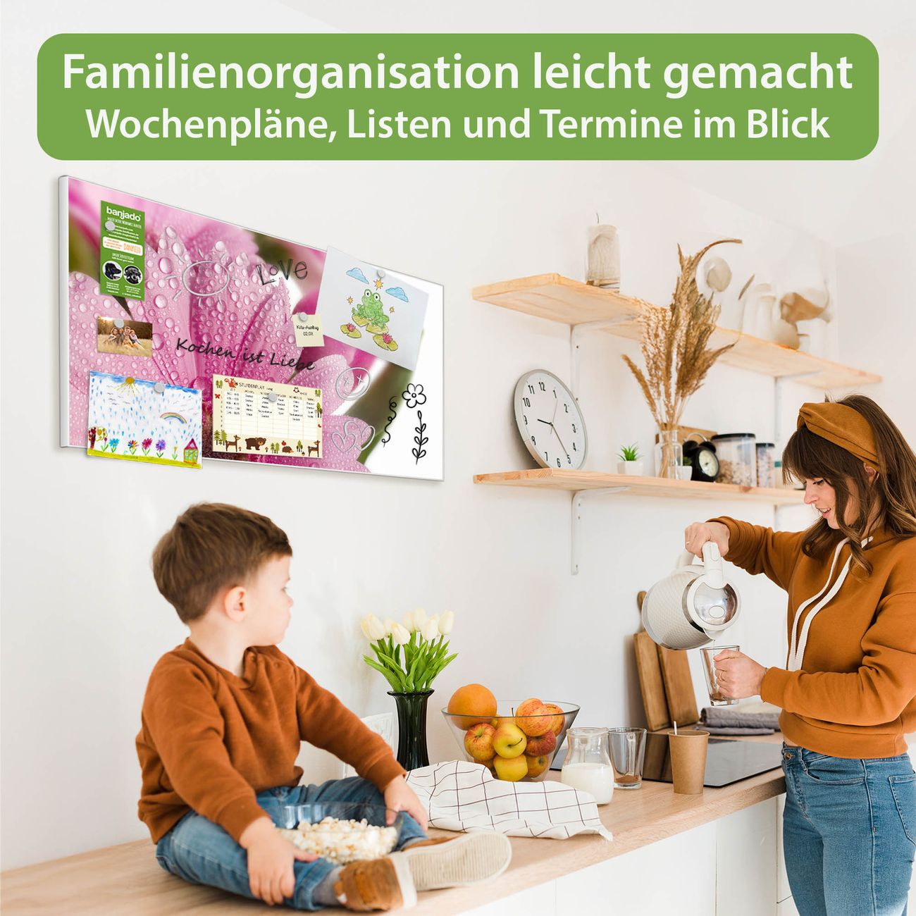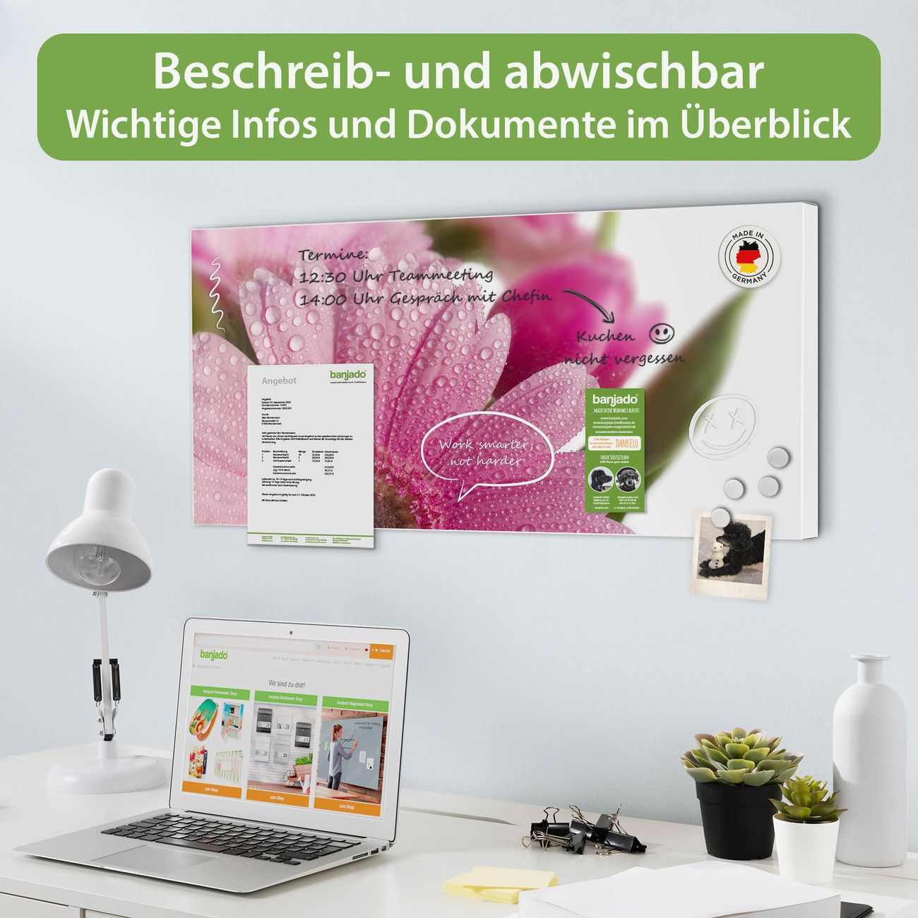 FUNKTION: Die banjado Magnettafel 78x37 cm im Design Motiv Rosa Gerbera vereint Funktionalität und modernes Wohndesign auf stilvolle Weise. Diese hochwertige Magnetwand aus Metall hilft Ihnen dabei, Notizen, Fotos, Termine, Einkaufslisten oder Rezepte übersichtlich zu organisieren. Als praktisches Memoboard sorgt sie für Struktur im Alltag und setzt gleichzeitig einen dekorativen Akzent an Ihrer Wand. DESIGN: Die Metalltafel besteht aus robustem, lackiertem Stahl und ist mit allen handelsüblichen Magneten nutzbar. Besonders praktisch ist die beschreibbare Oberfläche. Sie können die Magnettafel ganz einfach mit Kreidestiften beschriften und die Inhalte bei Bedarf mit einem feuchten Tuch wieder entfernen. So eignet sich das Memoboard ideal für Wochenpläne, Menüpläne, To Do Listen oder kreative Botschaften. DETAILS: Mit ihrem großzügigen Querformat von 78x37 cm bietet die Magnettafel ausreichend Platz für Ihre Organisation. Das Motiv Motiv Rosa Gerbera bringt eine warme, natürliche Optik in Küche, Flur, Büro oder Homeoffice und wirkt auch ohne Magnete oder Beschriftung wie ein modernes Wandbild. NUTZEN: Auf der Rückseite befinden sich vorgefertigte Löcher für eine schnelle und unkomplizierte Wandmontage. Jede banjado Magnettafel wird in Deutschland gefertigt und steht für Qualität, Langlebigkeit und liebevolle Verarbeitung. Dieses beschreibbare Memoboard ist die perfekte Kombination aus Metalltafel, Designobjekt und praktischer Magnetwand für Ihren Alltag. BANJADO: Wir sind ein kleines Team aus dem Herzen von Sachsen. Wir fertigen alle Artikel von Hand für Sie an, Sie erhalten keine preiswerte Importware. Auf Wunsch können Sie auch Ihr eigenes Foto auf die Magnettafel aufbringen, schreiben Sie uns an. Herzlichst, Ihr banjado-Team