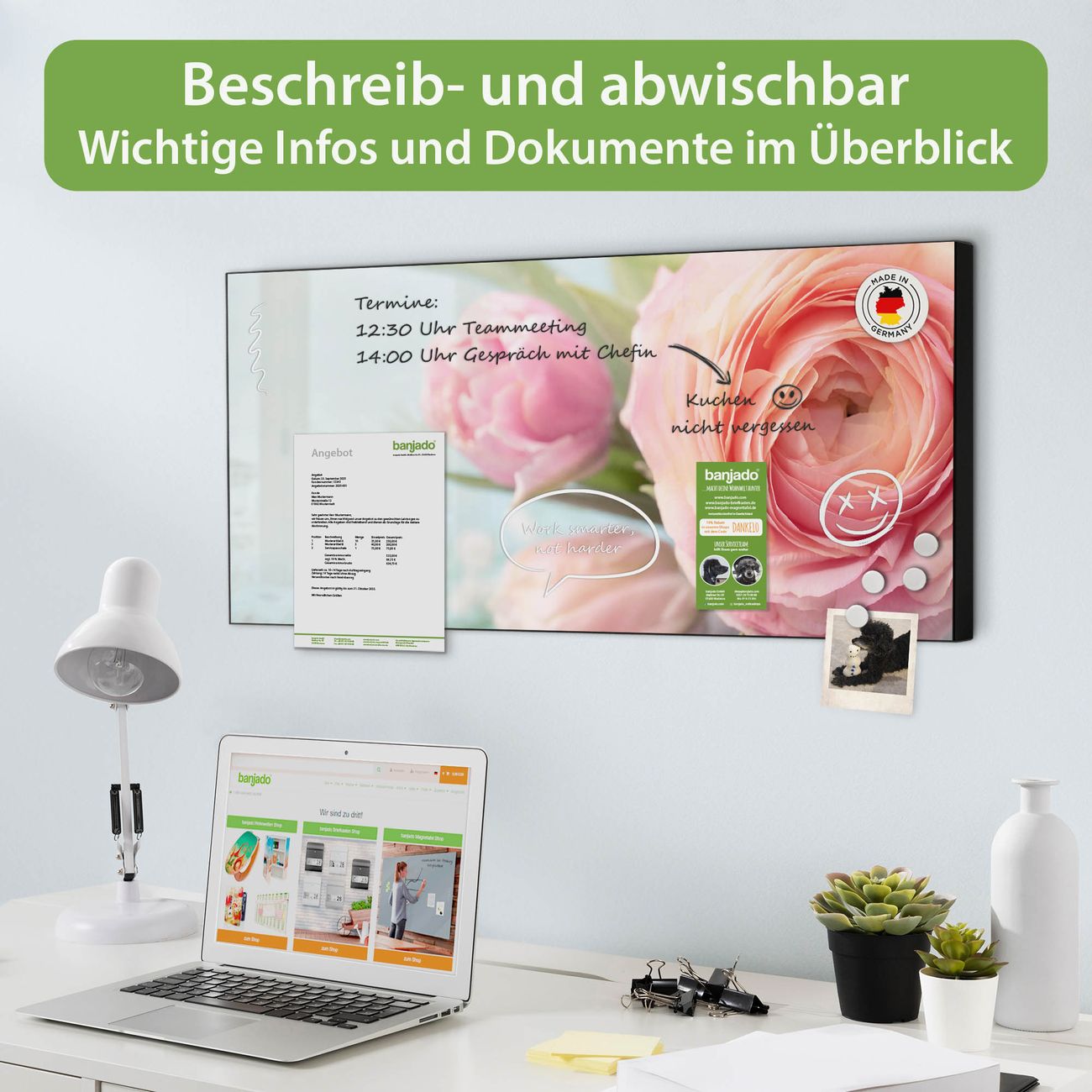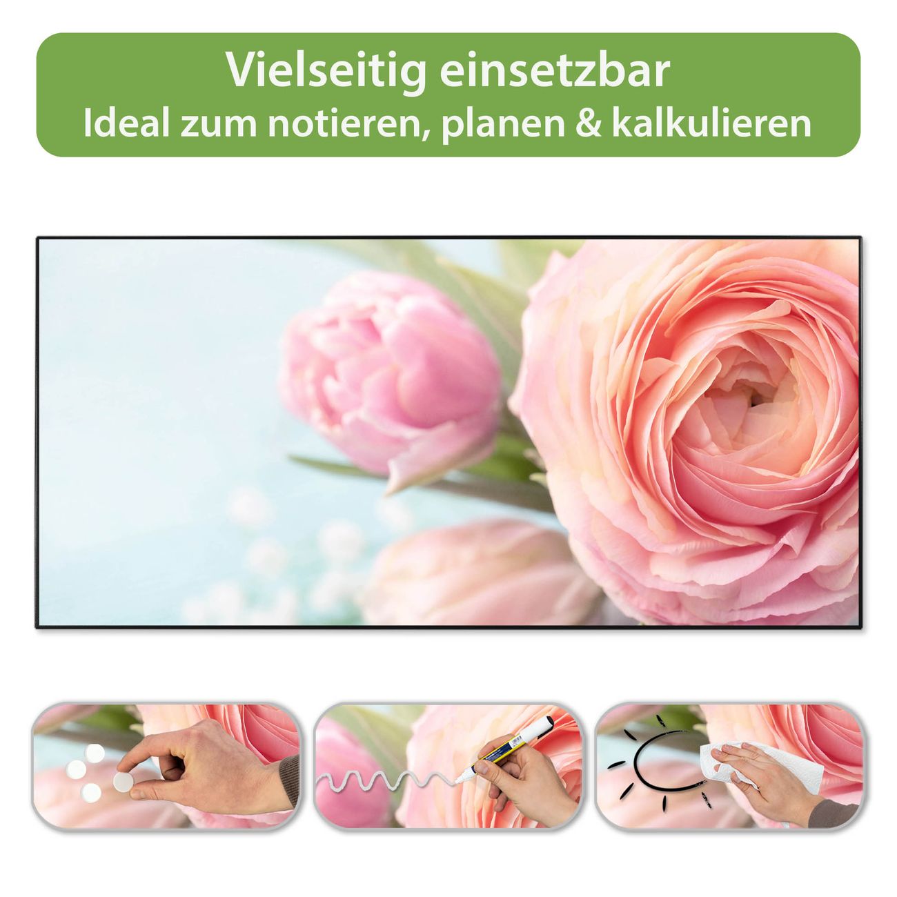 FUNKTION: Die banjado Magnettafel 78x37 cm im Design Motiv Rosa Tulpe vereint Funktionalität und modernes Wohndesign auf stilvolle Weise. Diese hochwertige Magnetwand aus Metall hilft Ihnen dabei, Notizen, Fotos, Termine, Einkaufslisten oder Rezepte übersichtlich zu organisieren. Als praktisches Memoboard sorgt sie für Struktur im Alltag und setzt gleichzeitig einen dekorativen Akzent an Ihrer Wand. DESIGN: Die Metalltafel besteht aus robustem, lackiertem Stahl und ist mit allen handelsüblichen Magneten nutzbar. Besonders praktisch ist die beschreibbare Oberfläche. Sie können die Magnettafel ganz einfach mit Kreidestiften beschriften und die Inhalte bei Bedarf mit einem feuchten Tuch wieder entfernen. So eignet sich das Memoboard ideal für Wochenpläne, Menüpläne, To Do Listen oder kreative Botschaften. DETAILS: Mit ihrem großzügigen Querformat von 78x37 cm bietet die Magnettafel ausreichend Platz für Ihre Organisation. Das Motiv Motiv Rosa Tulpe bringt eine warme, natürliche Optik in Küche, Flur, Büro oder Homeoffice und wirkt auch ohne Magnete oder Beschriftung wie ein modernes Wandbild. NUTZEN: Auf der Rückseite befinden sich vorgefertigte Löcher für eine schnelle und unkomplizierte Wandmontage. Jede banjado Magnettafel wird in Deutschland gefertigt und steht für Qualität, Langlebigkeit und liebevolle Verarbeitung. Dieses beschreibbare Memoboard ist die perfekte Kombination aus Metalltafel, Designobjekt und praktischer Magnetwand für Ihren Alltag. BANJADO: Wir sind ein kleines Team aus dem Herzen von Sachsen. Wir fertigen alle Artikel von Hand für Sie an, Sie erhalten keine preiswerte Importware. Auf Wunsch können Sie auch Ihr eigenes Foto auf die Magnettafel aufbringen, schreiben Sie uns an. Herzlichst, Ihr banjado-Team