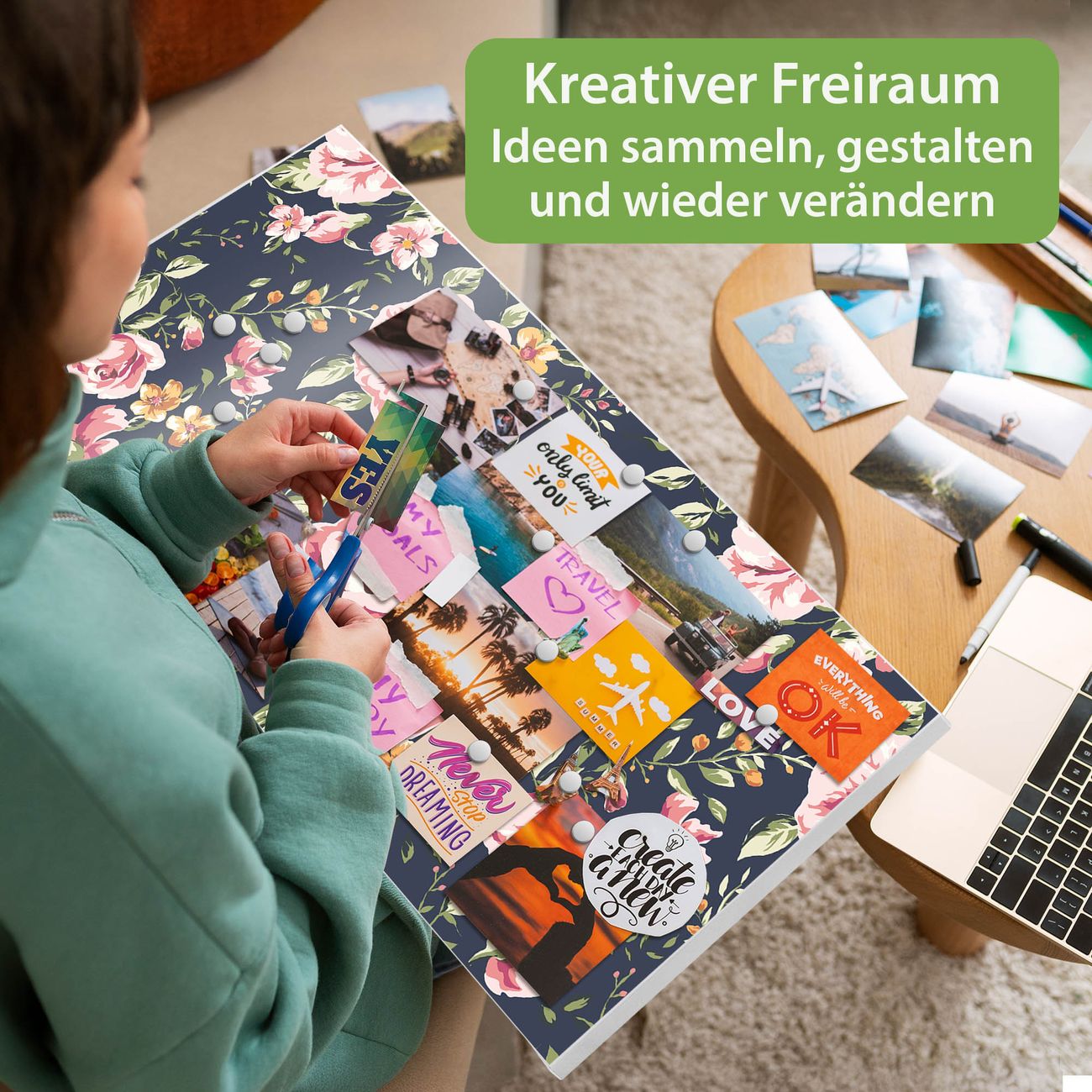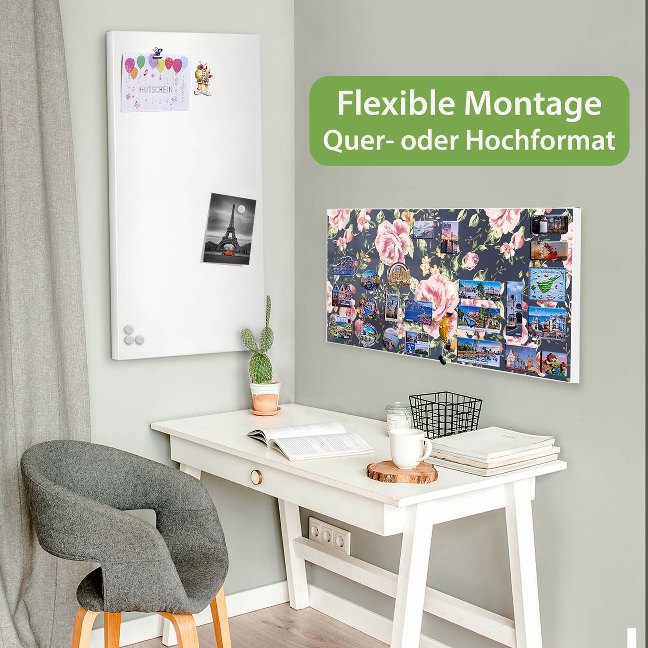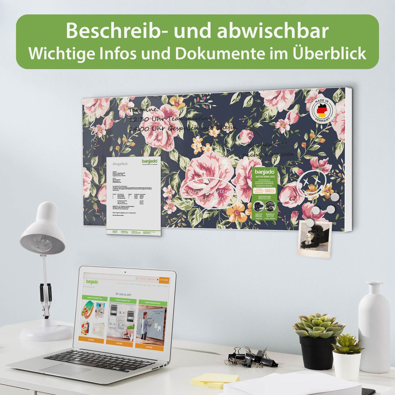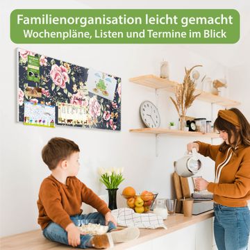 FUNKTION: Die banjado Magnettafel 78x37 cm im Design Motiv Rosen Auf Anthrazit vereint Funktionalität und modernes Wohndesign auf stilvolle Weise. Diese hochwertige Magnetwand aus Metall hilft Ihnen dabei, Notizen, Fotos, Termine, Einkaufslisten oder Rezepte übersichtlich zu organisieren. Als praktisches Memoboard sorgt sie für Struktur im Alltag und setzt gleichzeitig einen dekorativen Akzent an Ihrer Wand. DESIGN: Die Metalltafel besteht aus robustem, lackiertem Stahl und ist mit allen handelsüblichen Magneten nutzbar. Besonders praktisch ist die beschreibbare Oberfläche. Sie können die Magnettafel ganz einfach mit Kreidestiften beschriften und die Inhalte bei Bedarf mit einem feuchten Tuch wieder entfernen. So eignet sich das Memoboard ideal für Wochenpläne, Menüpläne, To Do Listen oder kreative Botschaften. DETAILS: Mit ihrem großzügigen Querformat von 78x37 cm bietet die Magnettafel ausreichend Platz für Ihre Organisation. Das Motiv Motiv Rosen Auf Anthrazit bringt eine warme, natürliche Optik in Küche, Flur, Büro oder Homeoffice und wirkt auch ohne Magnete oder Beschriftung wie ein modernes Wandbild. NUTZEN: Auf der Rückseite befinden sich vorgefertigte Löcher für eine schnelle und unkomplizierte Wandmontage. Jede banjado Magnettafel wird in Deutschland gefertigt und steht für Qualität, Langlebigkeit und liebevolle Verarbeitung. Dieses beschreibbare Memoboard ist die perfekte Kombination aus Metalltafel, Designobjekt und praktischer Magnetwand für Ihren Alltag. BANJADO: Wir sind ein kleines Team aus dem Herzen von Sachsen. Wir fertigen alle Artikel von Hand für Sie an, Sie erhalten keine preiswerte Importware. Auf Wunsch können Sie auch Ihr eigenes Foto auf die Magnettafel aufbringen, schreiben Sie uns an. Herzlichst, Ihr banjado-Team