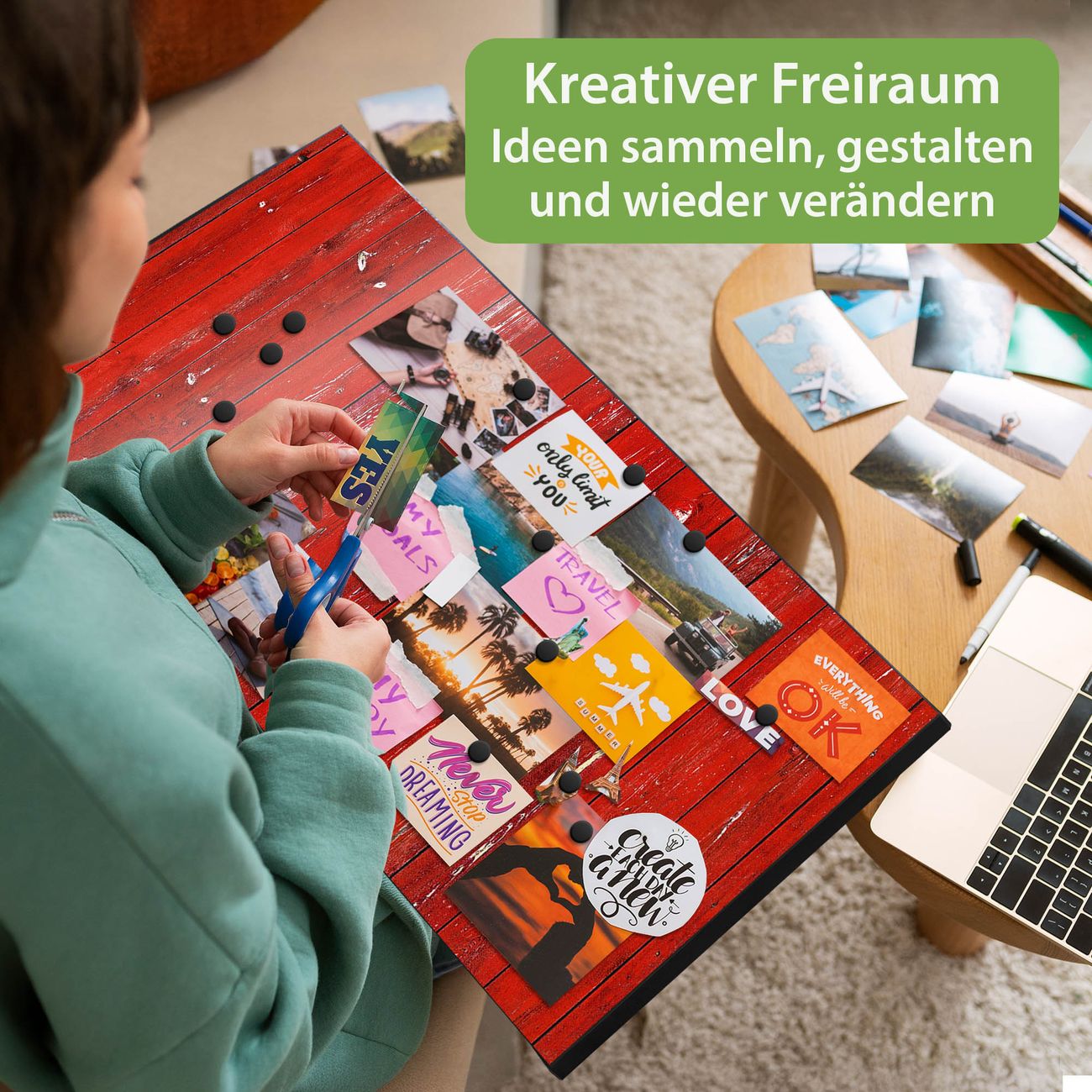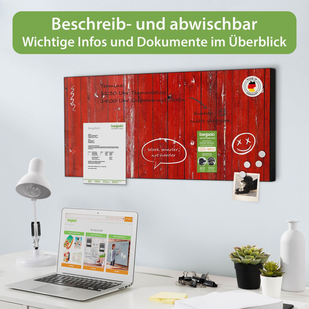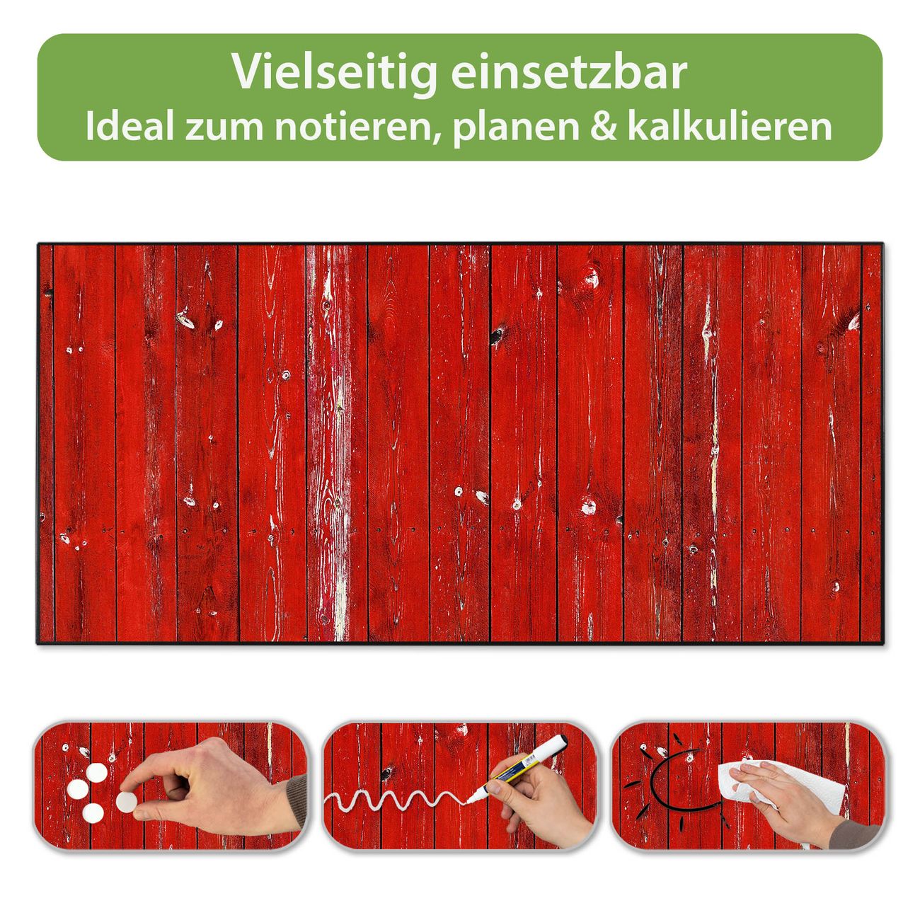 FUNKTION: Die banjado Magnettafel 78x37 cm im Design Motiv Rote Holzlatten vereint Funktionalität und modernes Wohndesign auf stilvolle Weise. Diese hochwertige Magnetwand aus Metall hilft Ihnen dabei, Notizen, Fotos, Termine, Einkaufslisten oder Rezepte übersichtlich zu organisieren. Als praktisches Memoboard sorgt sie für Struktur im Alltag und setzt gleichzeitig einen dekorativen Akzent an Ihrer Wand. DESIGN: Die Metalltafel besteht aus robustem, lackiertem Stahl und ist mit allen handelsüblichen Magneten nutzbar. Besonders praktisch ist die beschreibbare Oberfläche. Sie können die Magnettafel ganz einfach mit Kreidestiften beschriften und die Inhalte bei Bedarf mit einem feuchten Tuch wieder entfernen. So eignet sich das Memoboard ideal für Wochenpläne, Menüpläne, To Do Listen oder kreative Botschaften. DETAILS: Mit ihrem großzügigen Querformat von 78x37 cm bietet die Magnettafel ausreichend Platz für Ihre Organisation. Das Motiv Motiv Rote Holzlatten bringt eine warme, natürliche Optik in Küche, Flur, Büro oder Homeoffice und wirkt auch ohne Magnete oder Beschriftung wie ein modernes Wandbild. NUTZEN: Auf der Rückseite befinden sich vorgefertigte Löcher für eine schnelle und unkomplizierte Wandmontage. Jede banjado Magnettafel wird in Deutschland gefertigt und steht für Qualität, Langlebigkeit und liebevolle Verarbeitung. Dieses beschreibbare Memoboard ist die perfekte Kombination aus Metalltafel, Designobjekt und praktischer Magnetwand für Ihren Alltag. BANJADO: Wir sind ein kleines Team aus dem Herzen von Sachsen. Wir fertigen alle Artikel von Hand für Sie an, Sie erhalten keine preiswerte Importware. Auf Wunsch können Sie auch Ihr eigenes Foto auf die Magnettafel aufbringen, schreiben Sie uns an. Herzlichst, Ihr banjado-Team