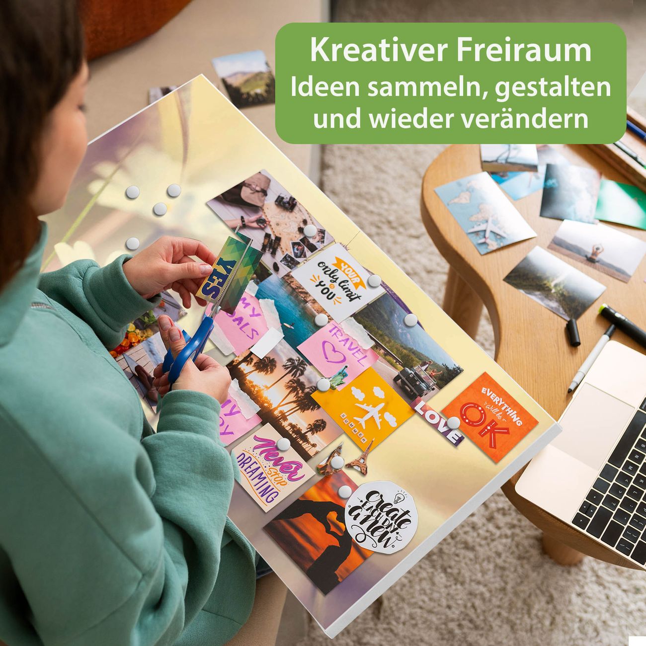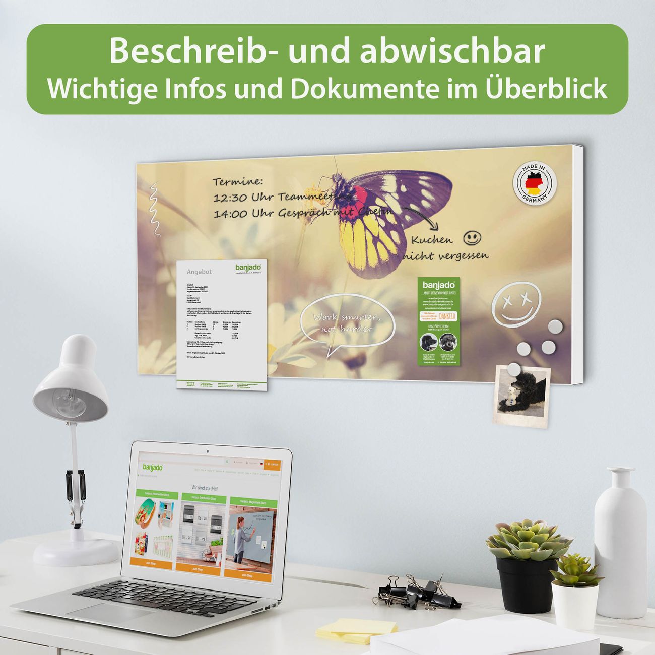 FUNKTION: Die banjado Magnettafel 78x37 cm im Design Motiv Rotgelber Falter vereint Funktionalität und modernes Wohndesign auf stilvolle Weise. Diese hochwertige Magnetwand aus Metall hilft Ihnen dabei, Notizen, Fotos, Termine, Einkaufslisten oder Rezepte übersichtlich zu organisieren. Als praktisches Memoboard sorgt sie für Struktur im Alltag und setzt gleichzeitig einen dekorativen Akzent an Ihrer Wand. DESIGN: Die Metalltafel besteht aus robustem, lackiertem Stahl und ist mit allen handelsüblichen Magneten nutzbar. Besonders praktisch ist die beschreibbare Oberfläche. Sie können die Magnettafel ganz einfach mit Kreidestiften beschriften und die Inhalte bei Bedarf mit einem feuchten Tuch wieder entfernen. So eignet sich das Memoboard ideal für Wochenpläne, Menüpläne, To Do Listen oder kreative Botschaften. DETAILS: Mit ihrem großzügigen Querformat von 78x37 cm bietet die Magnettafel ausreichend Platz für Ihre Organisation. Das Motiv Motiv Rotgelber Falter bringt eine warme, natürliche Optik in Küche, Flur, Büro oder Homeoffice und wirkt auch ohne Magnete oder Beschriftung wie ein modernes Wandbild. NUTZEN: Auf der Rückseite befinden sich vorgefertigte Löcher für eine schnelle und unkomplizierte Wandmontage. Jede banjado Magnettafel wird in Deutschland gefertigt und steht für Qualität, Langlebigkeit und liebevolle Verarbeitung. Dieses beschreibbare Memoboard ist die perfekte Kombination aus Metalltafel, Designobjekt und praktischer Magnetwand für Ihren Alltag. BANJADO: Wir sind ein kleines Team aus dem Herzen von Sachsen. Wir fertigen alle Artikel von Hand für Sie an, Sie erhalten keine preiswerte Importware. Auf Wunsch können Sie auch Ihr eigenes Foto auf die Magnettafel aufbringen, schreiben Sie uns an. Herzlichst, Ihr banjado-Team