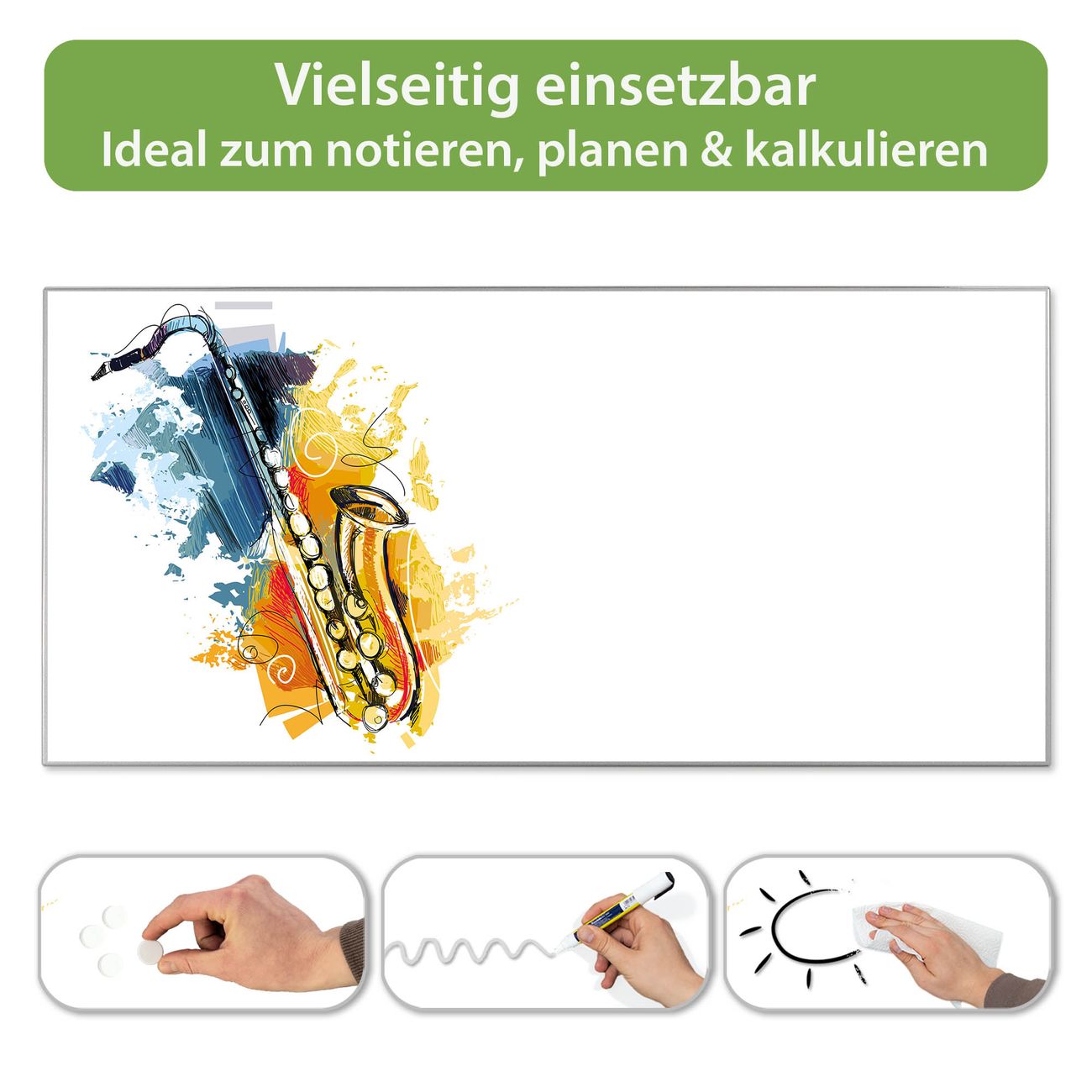FUNKTION: Die banjado Magnettafel 78x37 cm im Design Motiv Saxophon vereint Funktionalität und modernes Wohndesign auf stilvolle Weise. Diese hochwertige Magnetwand aus Metall hilft Ihnen dabei, Notizen, Fotos, Termine, Einkaufslisten oder Rezepte übersichtlich zu organisieren. Als praktisches Memoboard sorgt sie für Struktur im Alltag und setzt gleichzeitig einen dekorativen Akzent an Ihrer Wand. DESIGN: Die Metalltafel besteht aus robustem, lackiertem Stahl und ist mit allen handelsüblichen Magneten nutzbar. Besonders praktisch ist die beschreibbare Oberfläche. Sie können die Magnettafel ganz einfach mit Kreidestiften beschriften und die Inhalte bei Bedarf mit einem feuchten Tuch wieder entfernen. So eignet sich das Memoboard ideal für Wochenpläne, Menüpläne, To Do Listen oder kreative Botschaften. DETAILS: Mit ihrem großzügigen Querformat von 78x37 cm bietet die Magnettafel ausreichend Platz für Ihre Organisation. Das Motiv Motiv Saxophon bringt eine warme, natürliche Optik in Küche, Flur, Büro oder Homeoffice und wirkt auch ohne Magnete oder Beschriftung wie ein modernes Wandbild. NUTZEN: Auf der Rückseite befinden sich vorgefertigte Löcher für eine schnelle und unkomplizierte Wandmontage. Jede banjado Magnettafel wird in Deutschland gefertigt und steht für Qualität, Langlebigkeit und liebevolle Verarbeitung. Dieses beschreibbare Memoboard ist die perfekte Kombination aus Metalltafel, Designobjekt und praktischer Magnetwand für Ihren Alltag. BANJADO: Wir sind ein kleines Team aus dem Herzen von Sachsen. Wir fertigen alle Artikel von Hand für Sie an, Sie erhalten keine preiswerte Importware. Auf Wunsch können Sie auch Ihr eigenes Foto auf die Magnettafel aufbringen, schreiben Sie uns an. Herzlichst, Ihr banjado-Team