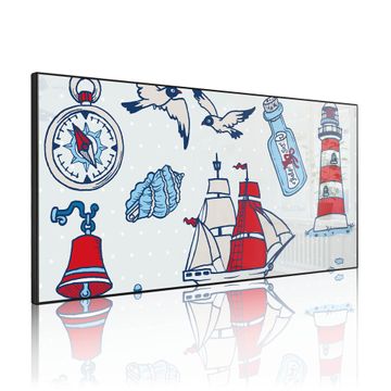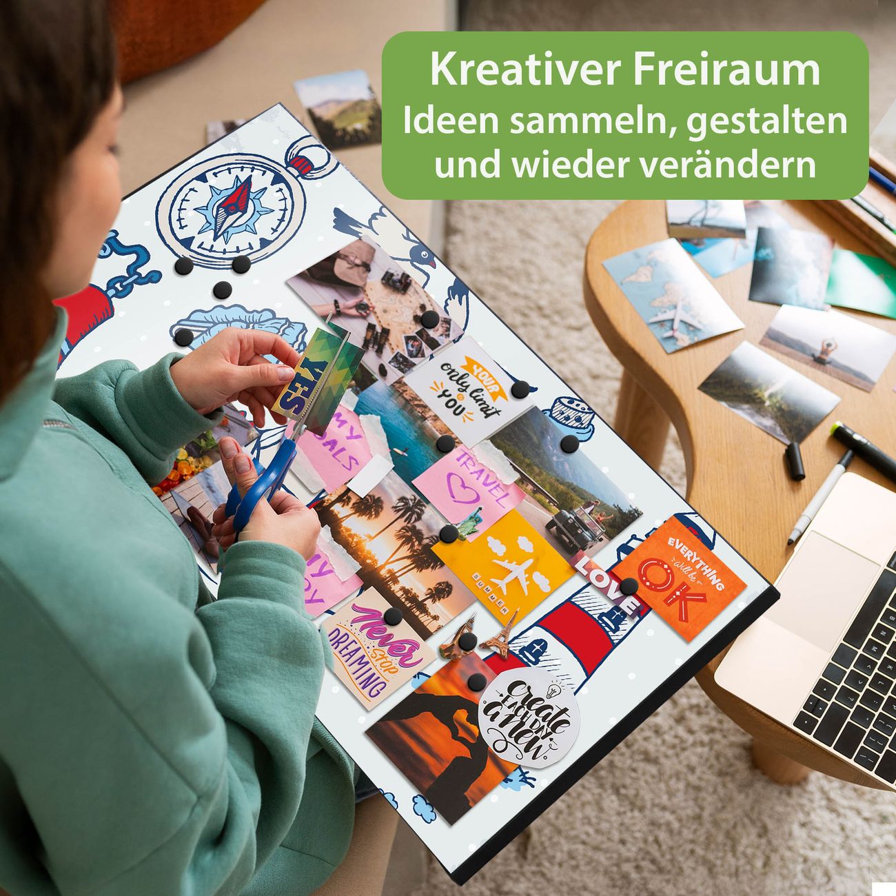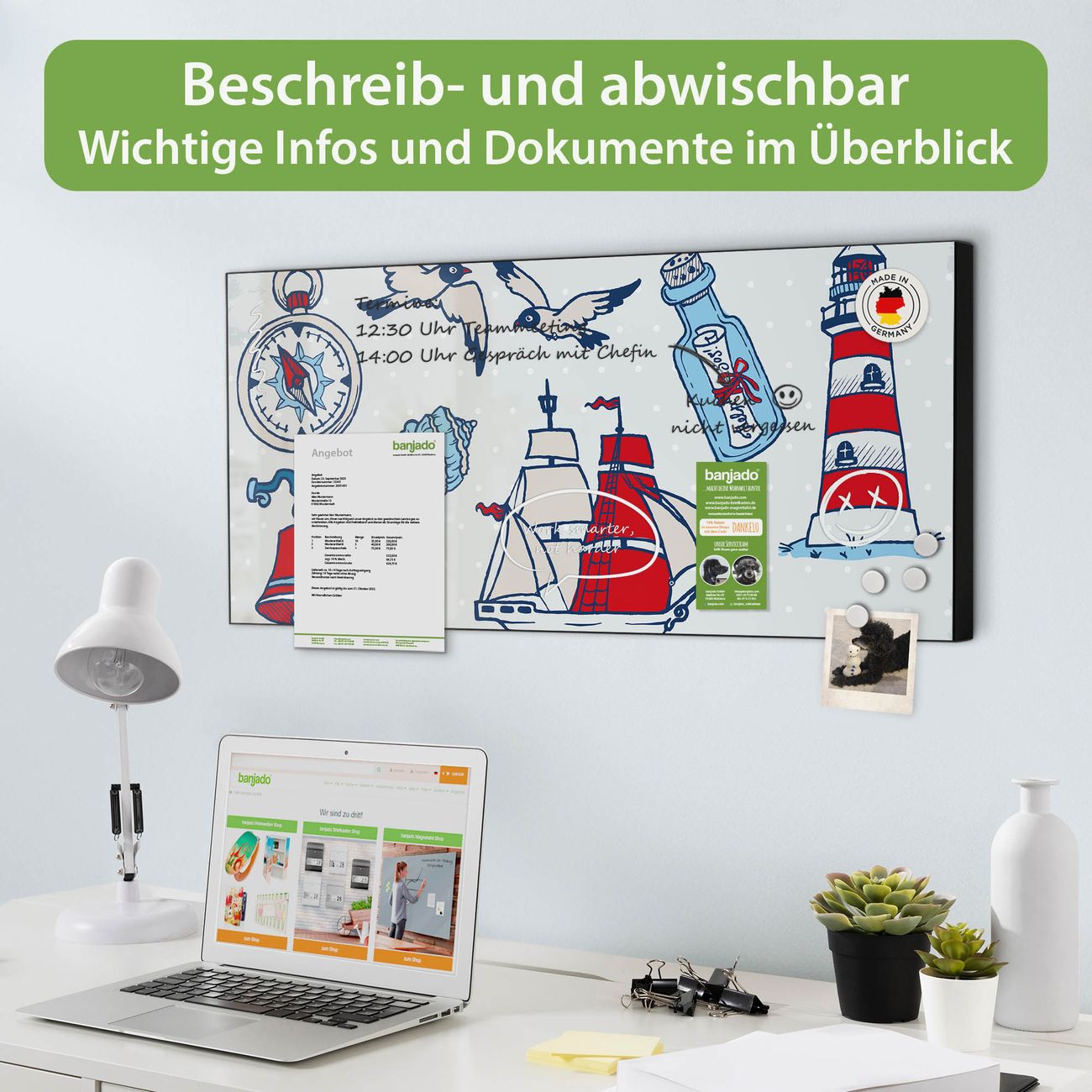 FUNKTION: Die banjado Magnettafel 78x37 cm im Design Motiv Schiff Ahoj vereint Funktionalität und modernes Wohndesign auf stilvolle Weise. Diese hochwertige Magnetwand aus Metall hilft Ihnen dabei, Notizen, Fotos, Termine, Einkaufslisten oder Rezepte übersichtlich zu organisieren. Als praktisches Memoboard sorgt sie für Struktur im Alltag und setzt gleichzeitig einen dekorativen Akzent an Ihrer Wand. DESIGN: Die Metalltafel besteht aus robustem, lackiertem Stahl und ist mit allen handelsüblichen Magneten nutzbar. Besonders praktisch ist die beschreibbare Oberfläche. Sie können die Magnettafel ganz einfach mit Kreidestiften beschriften und die Inhalte bei Bedarf mit einem feuchten Tuch wieder entfernen. So eignet sich das Memoboard ideal für Wochenpläne, Menüpläne, To Do Listen oder kreative Botschaften. DETAILS: Mit ihrem großzügigen Querformat von 78x37 cm bietet die Magnettafel ausreichend Platz für Ihre Organisation. Das Motiv Motiv Schiff Ahoj bringt eine warme, natürliche Optik in Küche, Flur, Büro oder Homeoffice und wirkt auch ohne Magnete oder Beschriftung wie ein modernes Wandbild. NUTZEN: Auf der Rückseite befinden sich vorgefertigte Löcher für eine schnelle und unkomplizierte Wandmontage. Jede banjado Magnettafel wird in Deutschland gefertigt und steht für Qualität, Langlebigkeit und liebevolle Verarbeitung. Dieses beschreibbare Memoboard ist die perfekte Kombination aus Metalltafel, Designobjekt und praktischer Magnetwand für Ihren Alltag. BANJADO: Wir sind ein kleines Team aus dem Herzen von Sachsen. Wir fertigen alle Artikel von Hand für Sie an, Sie erhalten keine preiswerte Importware. Auf Wunsch können Sie auch Ihr eigenes Foto auf die Magnettafel aufbringen, schreiben Sie uns an. Herzlichst, Ihr banjado-Team