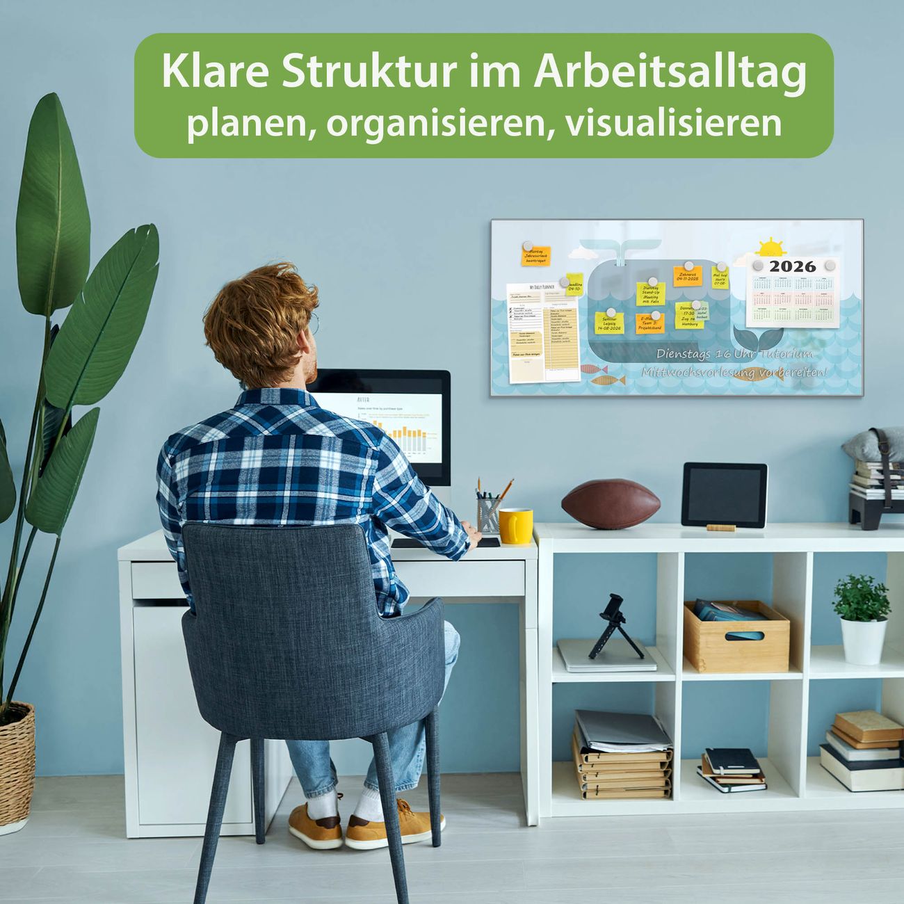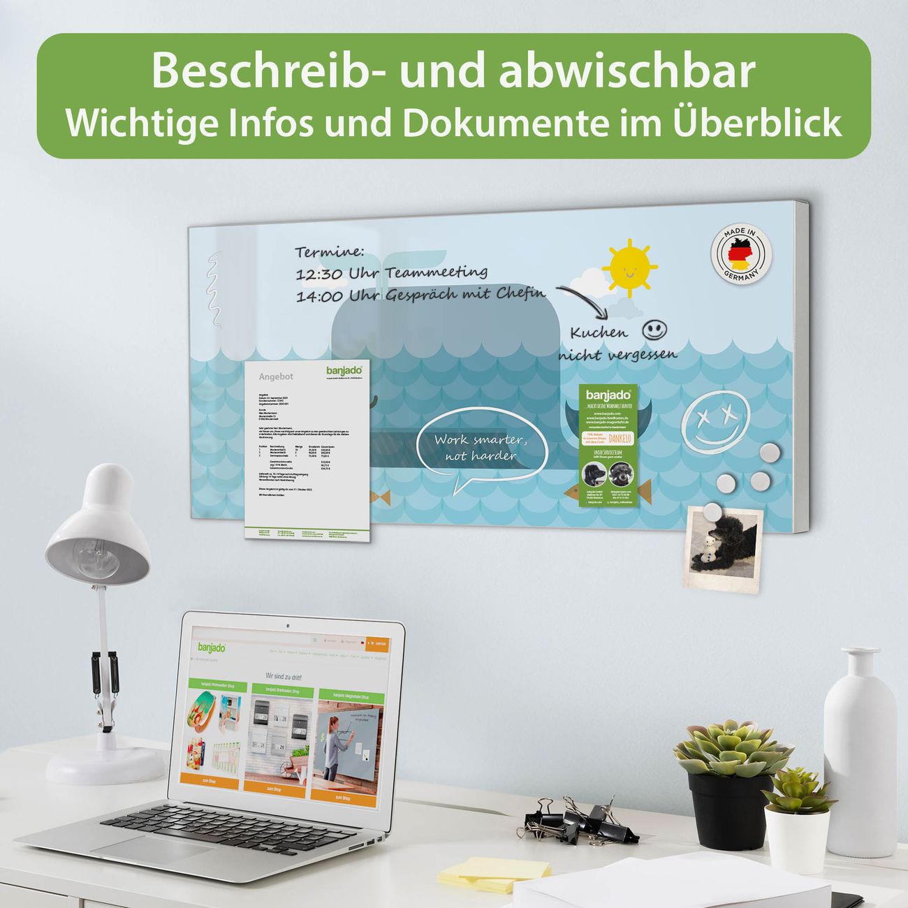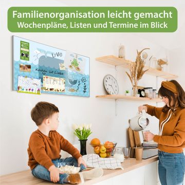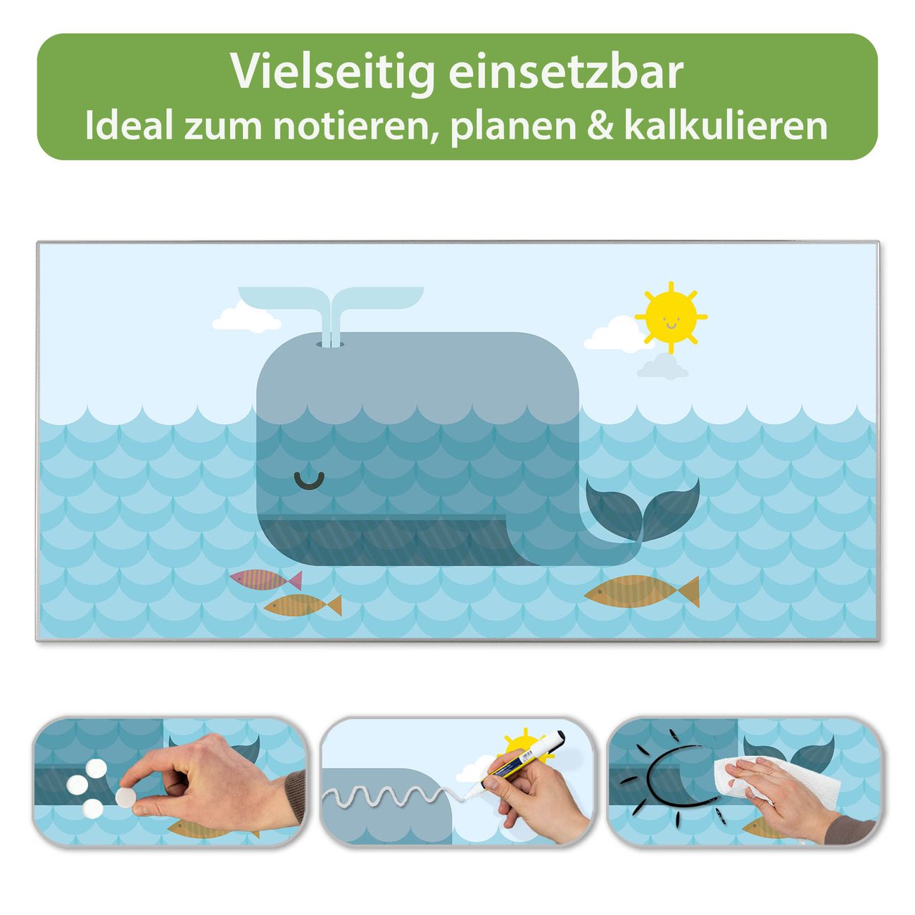 FUNKTION: Die banjado Magnettafel 78x37 cm im Design Motiv Schlafender Wal vereint Funktionalität und modernes Wohndesign auf stilvolle Weise. Diese hochwertige Magnetwand aus Metall hilft Ihnen dabei, Notizen, Fotos, Termine, Einkaufslisten oder Rezepte übersichtlich zu organisieren. Als praktisches Memoboard sorgt sie für Struktur im Alltag und setzt gleichzeitig einen dekorativen Akzent an Ihrer Wand. DESIGN: Die Metalltafel besteht aus robustem, lackiertem Stahl und ist mit allen handelsüblichen Magneten nutzbar. Besonders praktisch ist die beschreibbare Oberfläche. Sie können die Magnettafel ganz einfach mit Kreidestiften beschriften und die Inhalte bei Bedarf mit einem feuchten Tuch wieder entfernen. So eignet sich das Memoboard ideal für Wochenpläne, Menüpläne, To Do Listen oder kreative Botschaften. DETAILS: Mit ihrem großzügigen Querformat von 78x37 cm bietet die Magnettafel ausreichend Platz für Ihre Organisation. Das Motiv Motiv Schlafender Wal bringt eine warme, natürliche Optik in Küche, Flur, Büro oder Homeoffice und wirkt auch ohne Magnete oder Beschriftung wie ein modernes Wandbild. NUTZEN: Auf der Rückseite befinden sich vorgefertigte Löcher für eine schnelle und unkomplizierte Wandmontage. Jede banjado Magnettafel wird in Deutschland gefertigt und steht für Qualität, Langlebigkeit und liebevolle Verarbeitung. Dieses beschreibbare Memoboard ist die perfekte Kombination aus Metalltafel, Designobjekt und praktischer Magnetwand für Ihren Alltag. BANJADO: Wir sind ein kleines Team aus dem Herzen von Sachsen. Wir fertigen alle Artikel von Hand für Sie an, Sie erhalten keine preiswerte Importware. Auf Wunsch können Sie auch Ihr eigenes Foto auf die Magnettafel aufbringen, schreiben Sie uns an. Herzlichst, Ihr banjado-Team