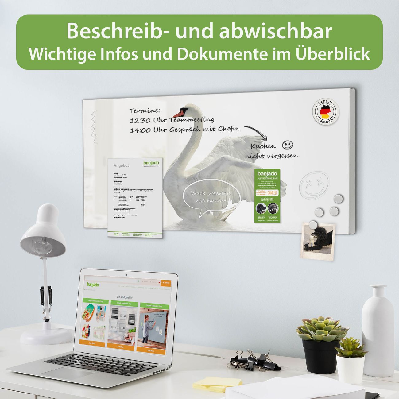 FUNKTION: Die banjado Magnettafel 78x37 cm im Design Motiv Schwan vereint Funktionalität und modernes Wohndesign auf stilvolle Weise. Diese hochwertige Magnetwand aus Metall hilft Ihnen dabei, Notizen, Fotos, Termine, Einkaufslisten oder Rezepte übersichtlich zu organisieren. Als praktisches Memoboard sorgt sie für Struktur im Alltag und setzt gleichzeitig einen dekorativen Akzent an Ihrer Wand. DESIGN: Die Metalltafel besteht aus robustem, lackiertem Stahl und ist mit allen handelsüblichen Magneten nutzbar. Besonders praktisch ist die beschreibbare Oberfläche. Sie können die Magnettafel ganz einfach mit Kreidestiften beschriften und die Inhalte bei Bedarf mit einem feuchten Tuch wieder entfernen. So eignet sich das Memoboard ideal für Wochenpläne, Menüpläne, To Do Listen oder kreative Botschaften. DETAILS: Mit ihrem großzügigen Querformat von 78x37 cm bietet die Magnettafel ausreichend Platz für Ihre Organisation. Das Motiv Motiv Schwan bringt eine warme, natürliche Optik in Küche, Flur, Büro oder Homeoffice und wirkt auch ohne Magnete oder Beschriftung wie ein modernes Wandbild. NUTZEN: Auf der Rückseite befinden sich vorgefertigte Löcher für eine schnelle und unkomplizierte Wandmontage. Jede banjado Magnettafel wird in Deutschland gefertigt und steht für Qualität, Langlebigkeit und liebevolle Verarbeitung. Dieses beschreibbare Memoboard ist die perfekte Kombination aus Metalltafel, Designobjekt und praktischer Magnetwand für Ihren Alltag. BANJADO: Wir sind ein kleines Team aus dem Herzen von Sachsen. Wir fertigen alle Artikel von Hand für Sie an, Sie erhalten keine preiswerte Importware. Auf Wunsch können Sie auch Ihr eigenes Foto auf die Magnettafel aufbringen, schreiben Sie uns an. Herzlichst, Ihr banjado-Team