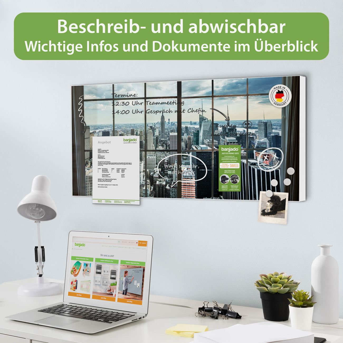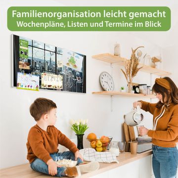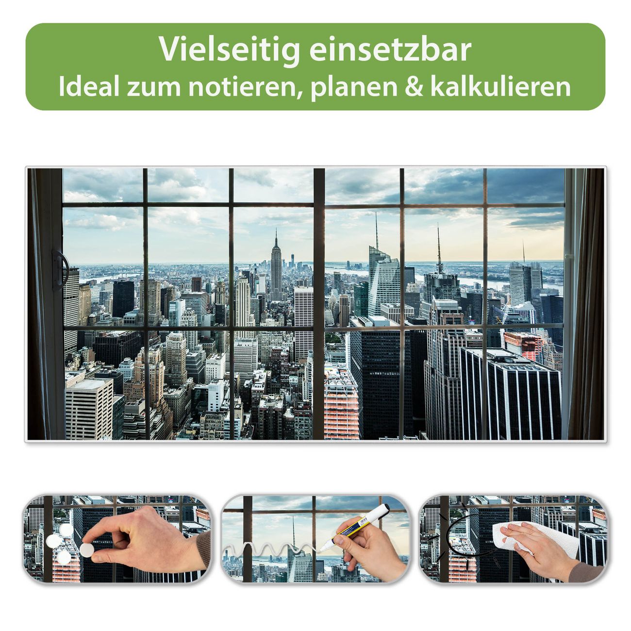 FUNKTION: Die banjado Magnettafel 78x37 cm im Design Motiv Skyline Manhattan vereint Funktionalität und modernes Wohndesign auf stilvolle Weise. Diese hochwertige Magnetwand aus Metall hilft Ihnen dabei, Notizen, Fotos, Termine, Einkaufslisten oder Rezepte übersichtlich zu organisieren. Als praktisches Memoboard sorgt sie für Struktur im Alltag und setzt gleichzeitig einen dekorativen Akzent an Ihrer Wand. DESIGN: Die Metalltafel besteht aus robustem, lackiertem Stahl und ist mit allen handelsüblichen Magneten nutzbar. Besonders praktisch ist die beschreibbare Oberfläche. Sie können die Magnettafel ganz einfach mit Kreidestiften beschriften und die Inhalte bei Bedarf mit einem feuchten Tuch wieder entfernen. So eignet sich das Memoboard ideal für Wochenpläne, Menüpläne, To Do Listen oder kreative Botschaften. DETAILS: Mit ihrem großzügigen Querformat von 78x37 cm bietet die Magnettafel ausreichend Platz für Ihre Organisation. Das Motiv Motiv Skyline Manhattan bringt eine warme, natürliche Optik in Küche, Flur, Büro oder Homeoffice und wirkt auch ohne Magnete oder Beschriftung wie ein modernes Wandbild. NUTZEN: Auf der Rückseite befinden sich vorgefertigte Löcher für eine schnelle und unkomplizierte Wandmontage. Jede banjado Magnettafel wird in Deutschland gefertigt und steht für Qualität, Langlebigkeit und liebevolle Verarbeitung. Dieses beschreibbare Memoboard ist die perfekte Kombination aus Metalltafel, Designobjekt und praktischer Magnetwand für Ihren Alltag. BANJADO: Wir sind ein kleines Team aus dem Herzen von Sachsen. Wir fertigen alle Artikel von Hand für Sie an, Sie erhalten keine preiswerte Importware. Auf Wunsch können Sie auch Ihr eigenes Foto auf die Magnettafel aufbringen, schreiben Sie uns an. Herzlichst, Ihr banjado-Team