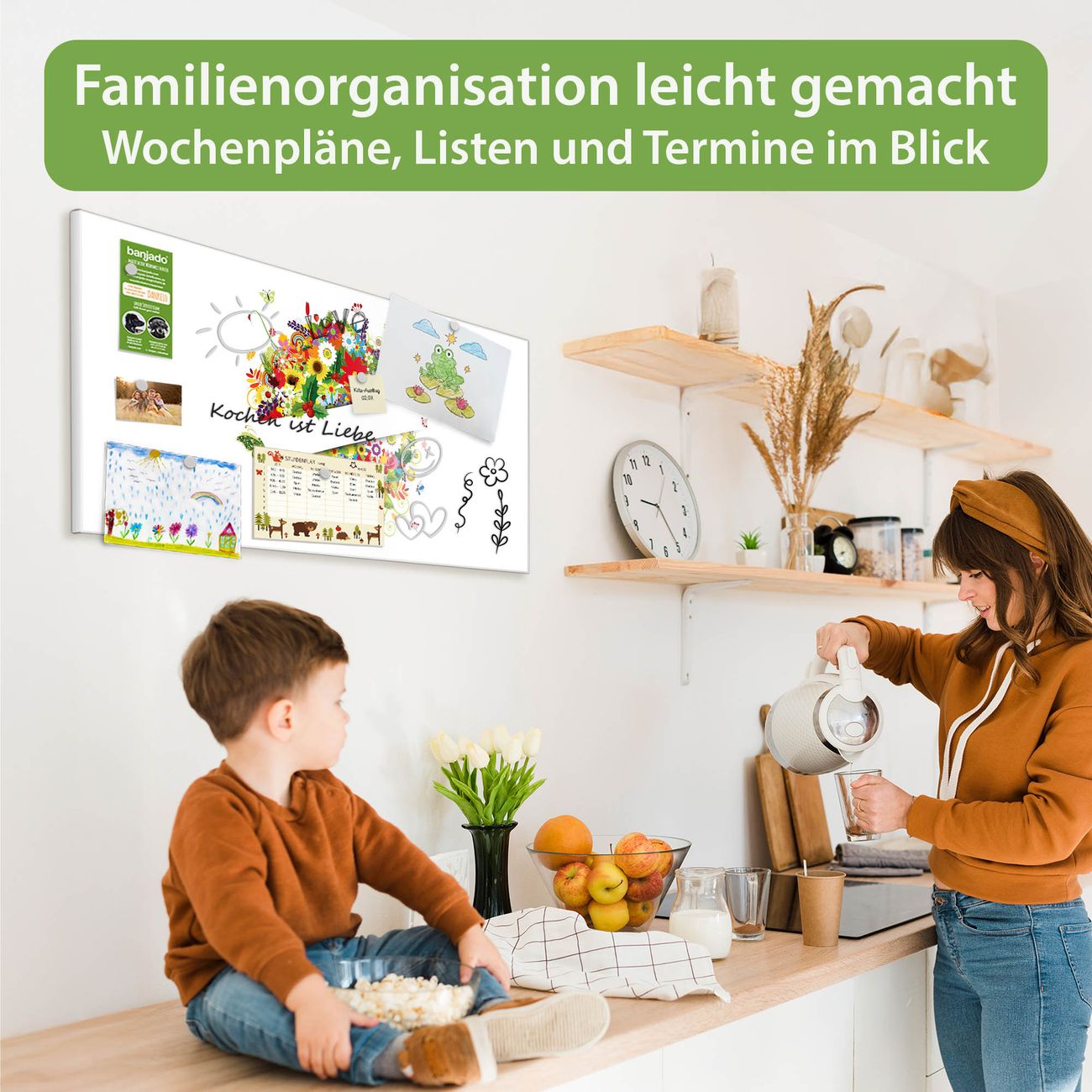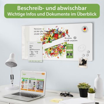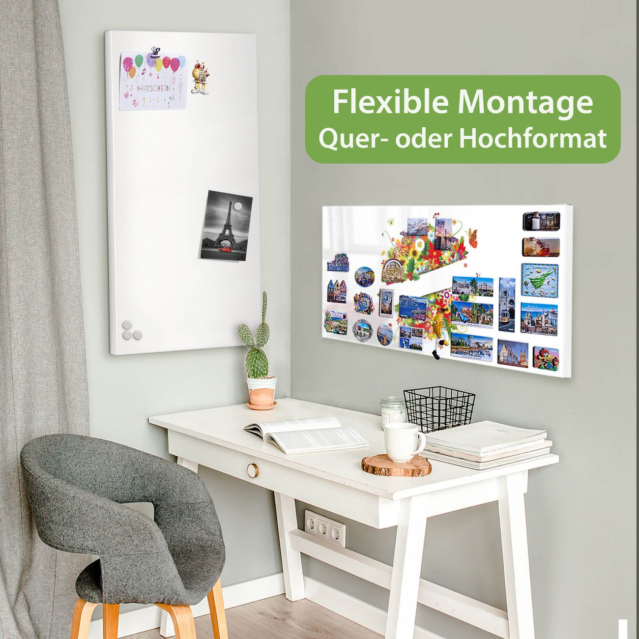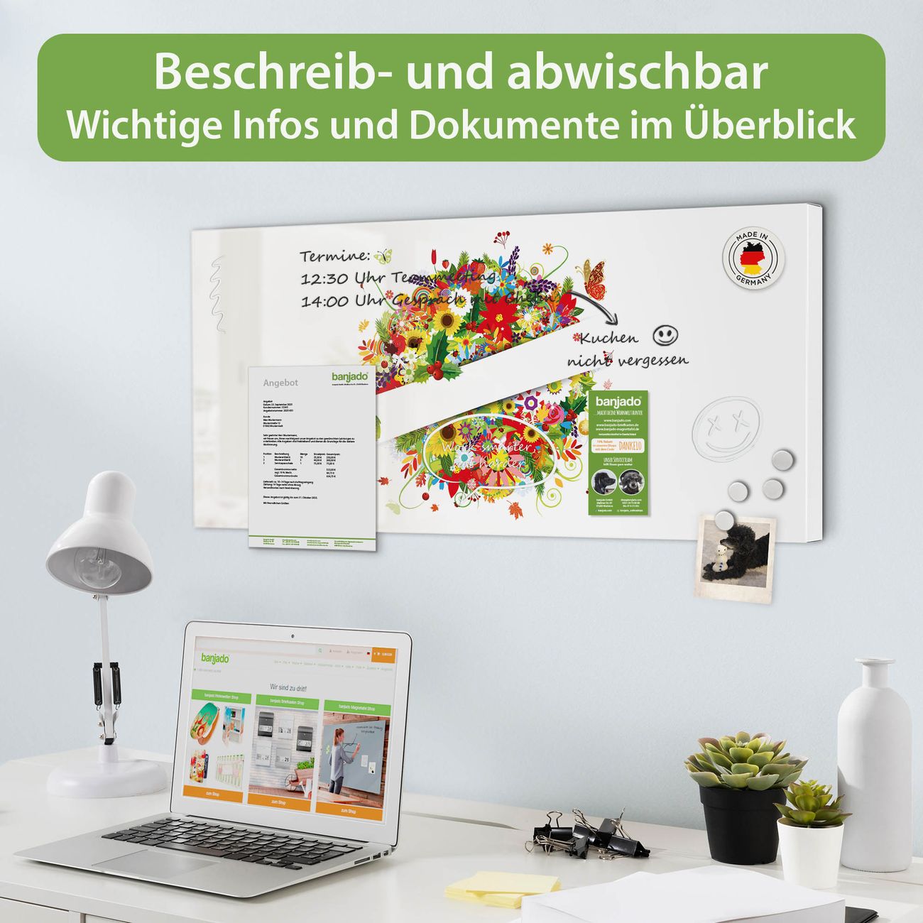 FUNKTION: Die banjado Magnettafel 78x37 cm im Design Motiv Sommer vereint Funktionalität und modernes Wohndesign auf stilvolle Weise. Diese hochwertige Magnetwand aus Metall hilft Ihnen dabei, Notizen, Fotos, Termine, Einkaufslisten oder Rezepte übersichtlich zu organisieren. Als praktisches Memoboard sorgt sie für Struktur im Alltag und setzt gleichzeitig einen dekorativen Akzent an Ihrer Wand. DESIGN: Die Metalltafel besteht aus robustem, lackiertem Stahl und ist mit allen handelsüblichen Magneten nutzbar. Besonders praktisch ist die beschreibbare Oberfläche. Sie können die Magnettafel ganz einfach mit Kreidestiften beschriften und die Inhalte bei Bedarf mit einem feuchten Tuch wieder entfernen. So eignet sich das Memoboard ideal für Wochenpläne, Menüpläne, To Do Listen oder kreative Botschaften. DETAILS: Mit ihrem großzügigen Querformat von 78x37 cm bietet die Magnettafel ausreichend Platz für Ihre Organisation. Das Motiv Motiv Sommer bringt eine warme, natürliche Optik in Küche, Flur, Büro oder Homeoffice und wirkt auch ohne Magnete oder Beschriftung wie ein modernes Wandbild. NUTZEN: Auf der Rückseite befinden sich vorgefertigte Löcher für eine schnelle und unkomplizierte Wandmontage. Jede banjado Magnettafel wird in Deutschland gefertigt und steht für Qualität, Langlebigkeit und liebevolle Verarbeitung. Dieses beschreibbare Memoboard ist die perfekte Kombination aus Metalltafel, Designobjekt und praktischer Magnetwand für Ihren Alltag. BANJADO: Wir sind ein kleines Team aus dem Herzen von Sachsen. Wir fertigen alle Artikel von Hand für Sie an, Sie erhalten keine preiswerte Importware. Auf Wunsch können Sie auch Ihr eigenes Foto auf die Magnettafel aufbringen, schreiben Sie uns an. Herzlichst, Ihr banjado-Team