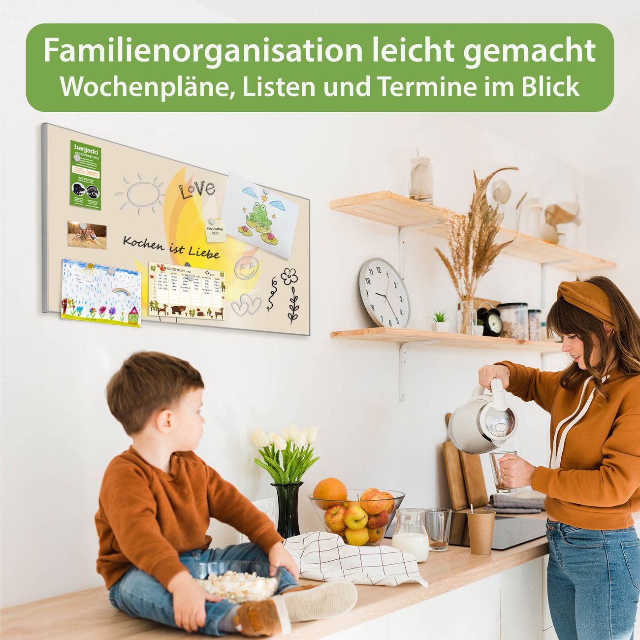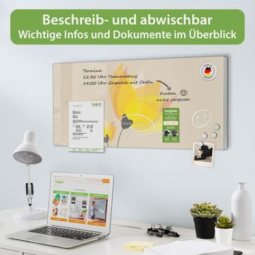 FUNKTION: Die banjado Magnettafel 78x37 cm im Design Motiv Sommerblüten vereint Funktionalität und modernes Wohndesign auf stilvolle Weise. Diese hochwertige Magnetwand aus Metall hilft Ihnen dabei, Notizen, Fotos, Termine, Einkaufslisten oder Rezepte übersichtlich zu organisieren. Als praktisches Memoboard sorgt sie für Struktur im Alltag und setzt gleichzeitig einen dekorativen Akzent an Ihrer Wand. DESIGN: Die Metalltafel besteht aus robustem, lackiertem Stahl und ist mit allen handelsüblichen Magneten nutzbar. Besonders praktisch ist die beschreibbare Oberfläche. Sie können die Magnettafel ganz einfach mit Kreidestiften beschriften und die Inhalte bei Bedarf mit einem feuchten Tuch wieder entfernen. So eignet sich das Memoboard ideal für Wochenpläne, Menüpläne, To Do Listen oder kreative Botschaften. DETAILS: Mit ihrem großzügigen Querformat von 78x37 cm bietet die Magnettafel ausreichend Platz für Ihre Organisation. Das Motiv Motiv Sommerblüten bringt eine warme, natürliche Optik in Küche, Flur, Büro oder Homeoffice und wirkt auch ohne Magnete oder Beschriftung wie ein modernes Wandbild. NUTZEN: Auf der Rückseite befinden sich vorgefertigte Löcher für eine schnelle und unkomplizierte Wandmontage. Jede banjado Magnettafel wird in Deutschland gefertigt und steht für Qualität, Langlebigkeit und liebevolle Verarbeitung. Dieses beschreibbare Memoboard ist die perfekte Kombination aus Metalltafel, Designobjekt und praktischer Magnetwand für Ihren Alltag. BANJADO: Wir sind ein kleines Team aus dem Herzen von Sachsen. Wir fertigen alle Artikel von Hand für Sie an, Sie erhalten keine preiswerte Importware. Auf Wunsch können Sie auch Ihr eigenes Foto auf die Magnettafel aufbringen, schreiben Sie uns an. Herzlichst, Ihr banjado-Team