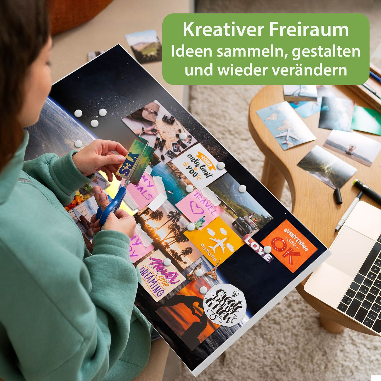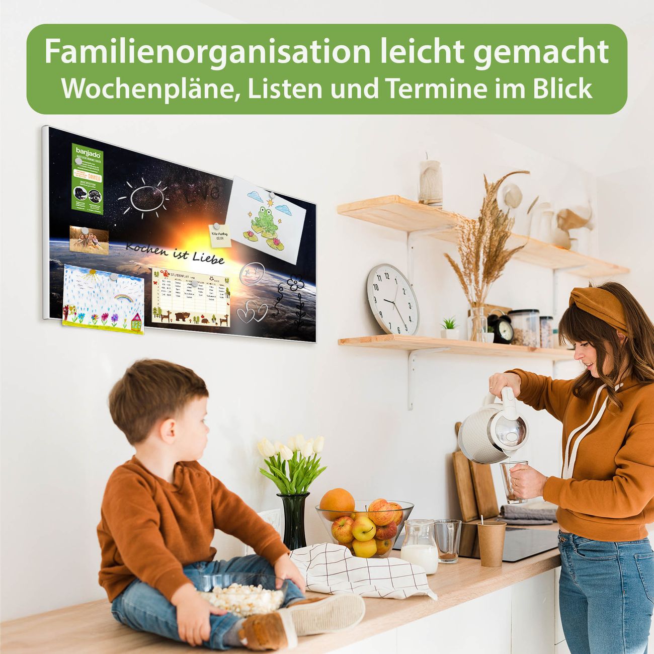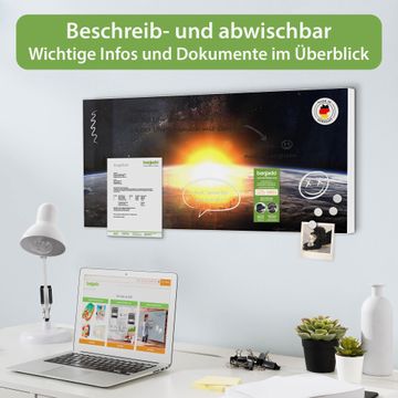 FUNKTION: Die banjado Magnettafel 78x37 cm im Design Motiv Sonne im Weltall vereint Funktionalität und modernes Wohndesign auf stilvolle Weise. Diese hochwertige Magnetwand aus Metall hilft Ihnen dabei, Notizen, Fotos, Termine, Einkaufslisten oder Rezepte übersichtlich zu organisieren. Als praktisches Memoboard sorgt sie für Struktur im Alltag und setzt gleichzeitig einen dekorativen Akzent an Ihrer Wand. DESIGN: Die Metalltafel besteht aus robustem, lackiertem Stahl und ist mit allen handelsüblichen Magneten nutzbar. Besonders praktisch ist die beschreibbare Oberfläche. Sie können die Magnettafel ganz einfach mit Kreidestiften beschriften und die Inhalte bei Bedarf mit einem feuchten Tuch wieder entfernen. So eignet sich das Memoboard ideal für Wochenpläne, Menüpläne, To Do Listen oder kreative Botschaften. DETAILS: Mit ihrem großzügigen Querformat von 78x37 cm bietet die Magnettafel ausreichend Platz für Ihre Organisation. Das Motiv Motiv Sonne im Weltall bringt eine warme, natürliche Optik in Küche, Flur, Büro oder Homeoffice und wirkt auch ohne Magnete oder Beschriftung wie ein modernes Wandbild. NUTZEN: Auf der Rückseite befinden sich vorgefertigte Löcher für eine schnelle und unkomplizierte Wandmontage. Jede banjado Magnettafel wird in Deutschland gefertigt und steht für Qualität, Langlebigkeit und liebevolle Verarbeitung. Dieses beschreibbare Memoboard ist die perfekte Kombination aus Metalltafel, Designobjekt und praktischer Magnetwand für Ihren Alltag. BANJADO: Wir sind ein kleines Team aus dem Herzen von Sachsen. Wir fertigen alle Artikel von Hand für Sie an, Sie erhalten keine preiswerte Importware. Auf Wunsch können Sie auch Ihr eigenes Foto auf die Magnettafel aufbringen, schreiben Sie uns an. Herzlichst, Ihr banjado-Team