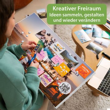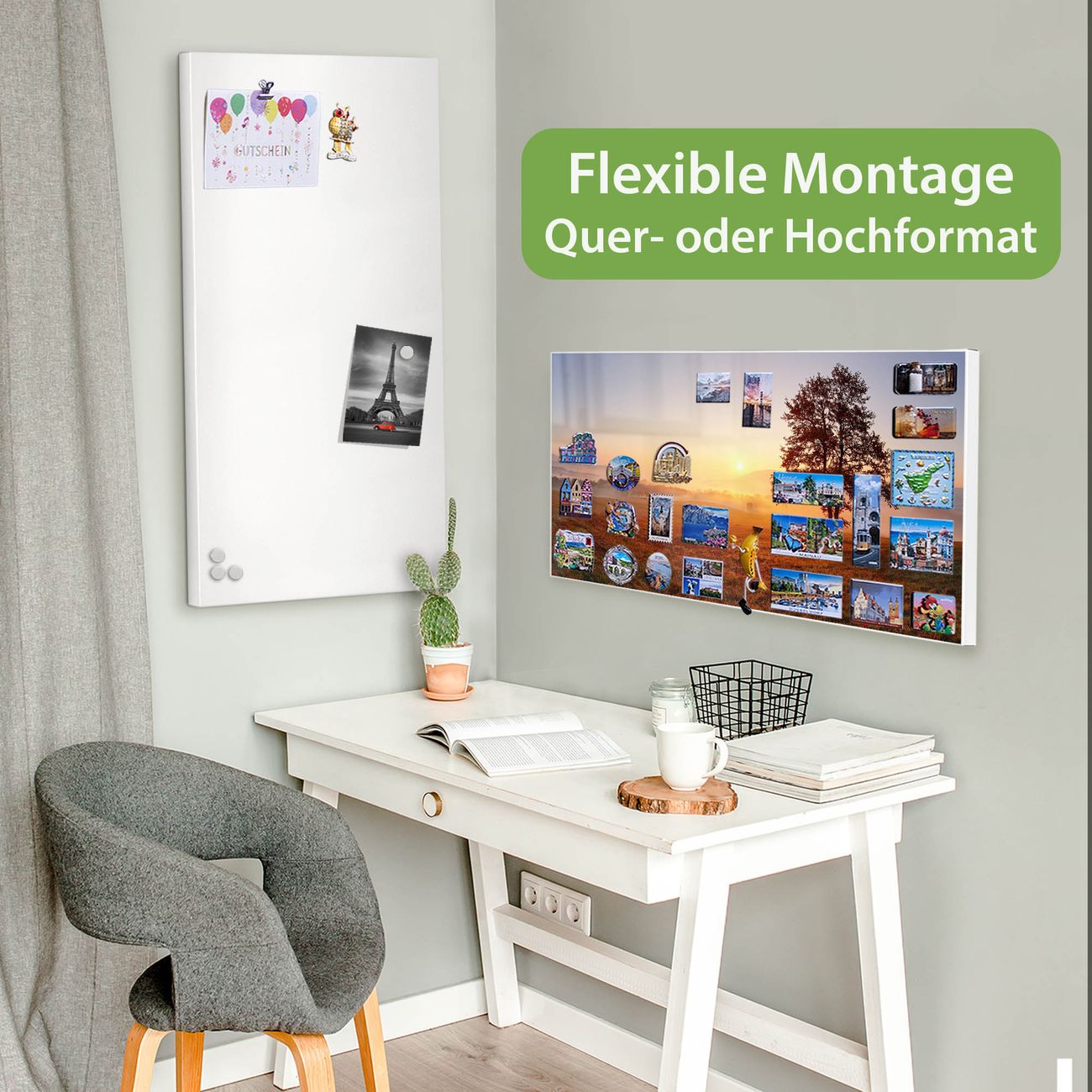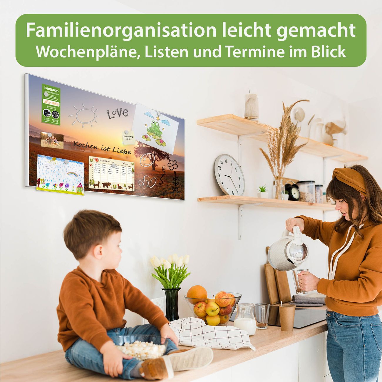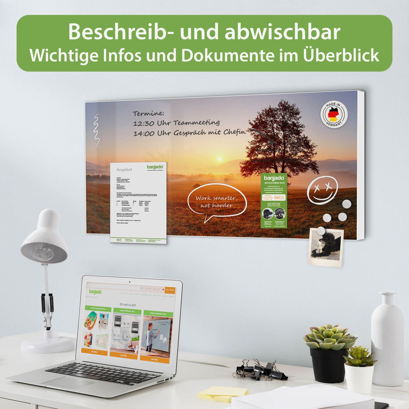 FUNKTION: Die banjado Magnettafel 78x37 cm im Design Motiv Sonnenaufgang vereint Funktionalität und modernes Wohndesign auf stilvolle Weise. Diese hochwertige Magnetwand aus Metall hilft Ihnen dabei, Notizen, Fotos, Termine, Einkaufslisten oder Rezepte übersichtlich zu organisieren. Als praktisches Memoboard sorgt sie für Struktur im Alltag und setzt gleichzeitig einen dekorativen Akzent an Ihrer Wand. DESIGN: Die Metalltafel besteht aus robustem, lackiertem Stahl und ist mit allen handelsüblichen Magneten nutzbar. Besonders praktisch ist die beschreibbare Oberfläche. Sie können die Magnettafel ganz einfach mit Kreidestiften beschriften und die Inhalte bei Bedarf mit einem feuchten Tuch wieder entfernen. So eignet sich das Memoboard ideal für Wochenpläne, Menüpläne, To Do Listen oder kreative Botschaften. DETAILS: Mit ihrem großzügigen Querformat von 78x37 cm bietet die Magnettafel ausreichend Platz für Ihre Organisation. Das Motiv Motiv Sonnenaufgang bringt eine warme, natürliche Optik in Küche, Flur, Büro oder Homeoffice und wirkt auch ohne Magnete oder Beschriftung wie ein modernes Wandbild. NUTZEN: Auf der Rückseite befinden sich vorgefertigte Löcher für eine schnelle und unkomplizierte Wandmontage. Jede banjado Magnettafel wird in Deutschland gefertigt und steht für Qualität, Langlebigkeit und liebevolle Verarbeitung. Dieses beschreibbare Memoboard ist die perfekte Kombination aus Metalltafel, Designobjekt und praktischer Magnetwand für Ihren Alltag. BANJADO: Wir sind ein kleines Team aus dem Herzen von Sachsen. Wir fertigen alle Artikel von Hand für Sie an, Sie erhalten keine preiswerte Importware. Auf Wunsch können Sie auch Ihr eigenes Foto auf die Magnettafel aufbringen, schreiben Sie uns an. Herzlichst, Ihr banjado-Team
