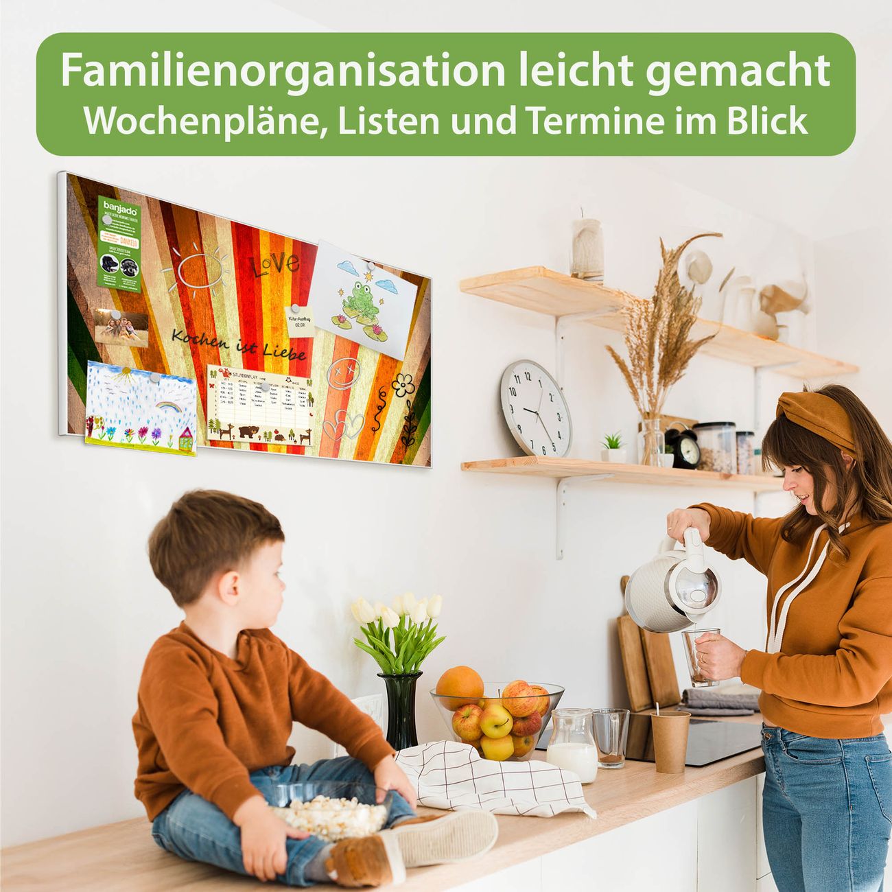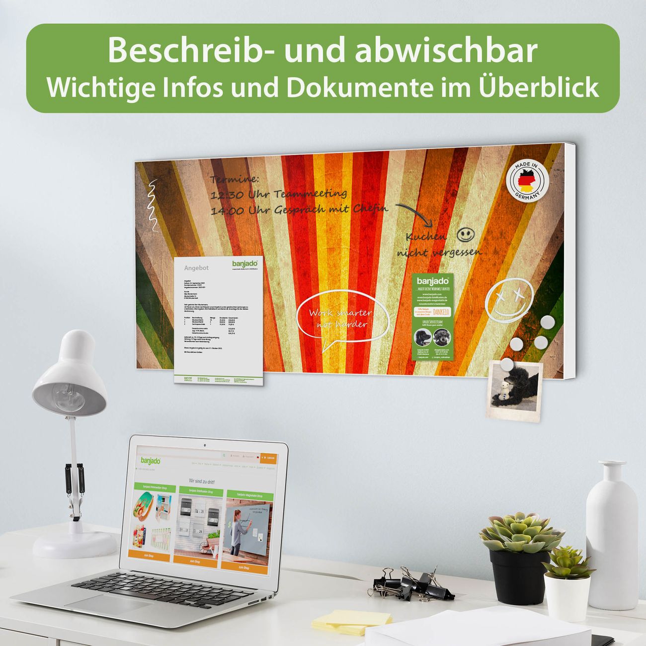 FUNKTION: Die banjado Magnettafel 78x37 cm im Design Motiv Sonnenuntergang Abstrakt vereint Funktionalität und modernes Wohndesign auf stilvolle Weise. Diese hochwertige Magnetwand aus Metall hilft Ihnen dabei, Notizen, Fotos, Termine, Einkaufslisten oder Rezepte übersichtlich zu organisieren. Als praktisches Memoboard sorgt sie für Struktur im Alltag und setzt gleichzeitig einen dekorativen Akzent an Ihrer Wand. DESIGN: Die Metalltafel besteht aus robustem, lackiertem Stahl und ist mit allen handelsüblichen Magneten nutzbar. Besonders praktisch ist die beschreibbare Oberfläche. Sie können die Magnettafel ganz einfach mit Kreidestiften beschriften und die Inhalte bei Bedarf mit einem feuchten Tuch wieder entfernen. So eignet sich das Memoboard ideal für Wochenpläne, Menüpläne, To Do Listen oder kreative Botschaften. DETAILS: Mit ihrem großzügigen Querformat von 78x37 cm bietet die Magnettafel ausreichend Platz für Ihre Organisation. Das Motiv Motiv Sonnenuntergang Abstrakt bringt eine warme, natürliche Optik in Küche, Flur, Büro oder Homeoffice und wirkt auch ohne Magnete oder Beschriftung wie ein modernes Wandbild. NUTZEN: Auf der Rückseite befinden sich vorgefertigte Löcher für eine schnelle und unkomplizierte Wandmontage. Jede banjado Magnettafel wird in Deutschland gefertigt und steht für Qualität, Langlebigkeit und liebevolle Verarbeitung. Dieses beschreibbare Memoboard ist die perfekte Kombination aus Metalltafel, Designobjekt und praktischer Magnetwand für Ihren Alltag. BANJADO: Wir sind ein kleines Team aus dem Herzen von Sachsen. Wir fertigen alle Artikel von Hand für Sie an, Sie erhalten keine preiswerte Importware. Auf Wunsch können Sie auch Ihr eigenes Foto auf die Magnettafel aufbringen, schreiben Sie uns an. Herzlichst, Ihr banjado-Team