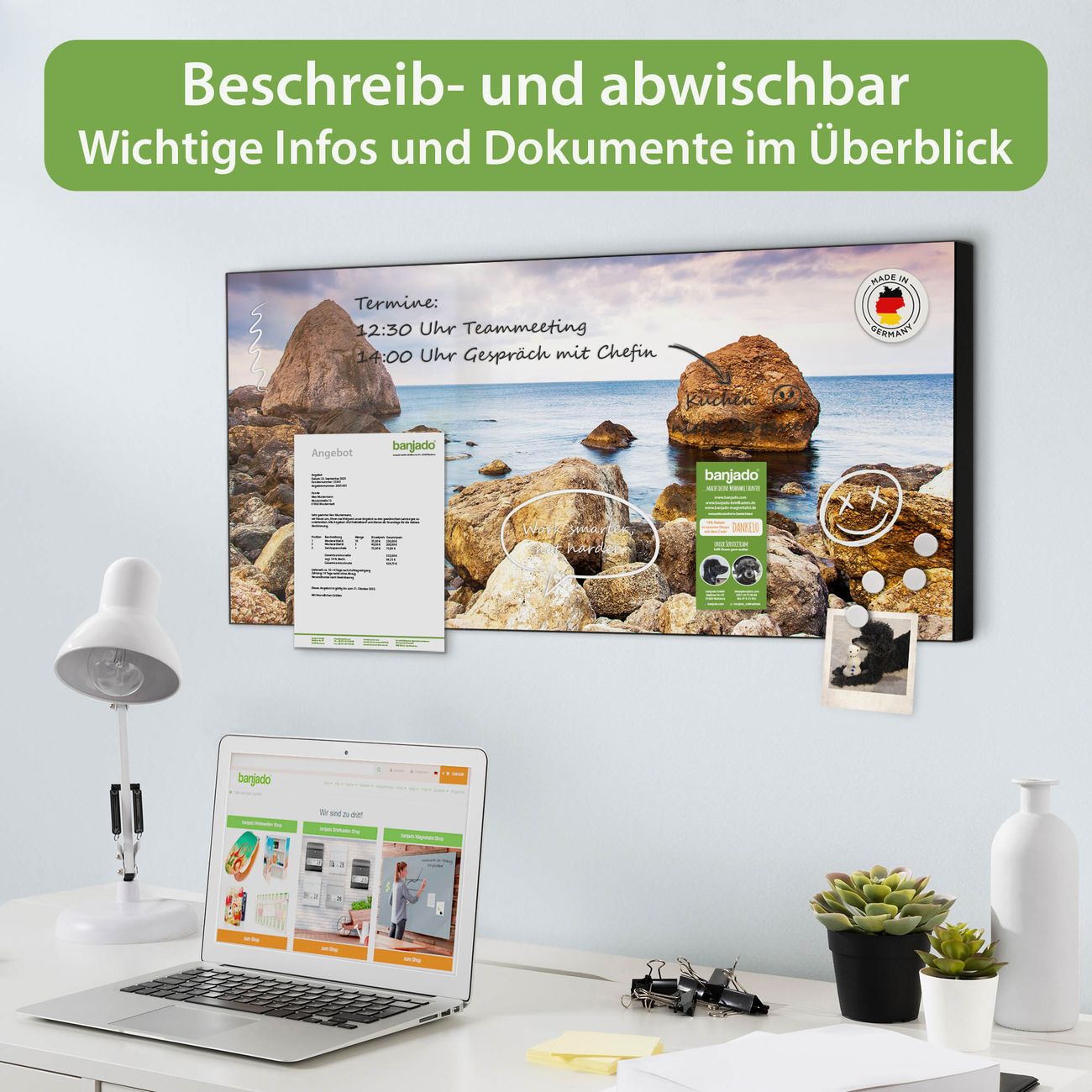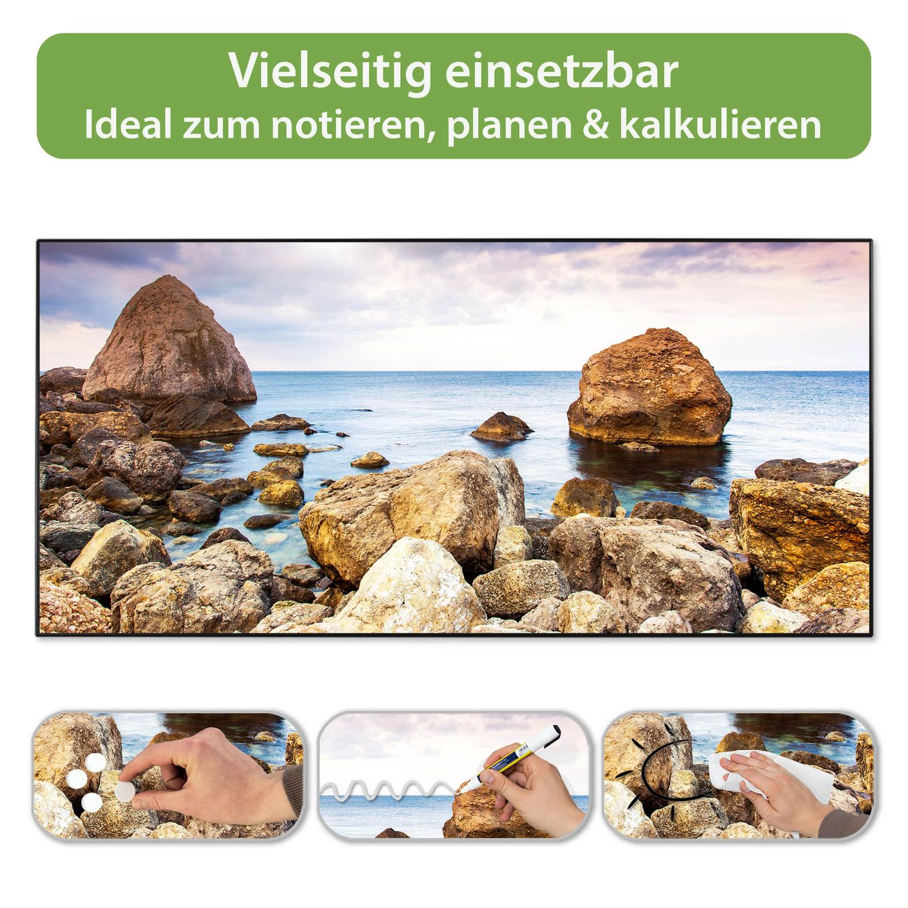 FUNKTION: Die banjado Magnettafel 78x37 cm im Design Motiv Steinbucht vereint Funktionalität und modernes Wohndesign auf stilvolle Weise. Diese hochwertige Magnetwand aus Metall hilft Ihnen dabei, Notizen, Fotos, Termine, Einkaufslisten oder Rezepte übersichtlich zu organisieren. Als praktisches Memoboard sorgt sie für Struktur im Alltag und setzt gleichzeitig einen dekorativen Akzent an Ihrer Wand. DESIGN: Die Metalltafel besteht aus robustem, lackiertem Stahl und ist mit allen handelsüblichen Magneten nutzbar. Besonders praktisch ist die beschreibbare Oberfläche. Sie können die Magnettafel ganz einfach mit Kreidestiften beschriften und die Inhalte bei Bedarf mit einem feuchten Tuch wieder entfernen. So eignet sich das Memoboard ideal für Wochenpläne, Menüpläne, To Do Listen oder kreative Botschaften. DETAILS: Mit ihrem großzügigen Querformat von 78x37 cm bietet die Magnettafel ausreichend Platz für Ihre Organisation. Das Motiv Motiv Steinbucht bringt eine warme, natürliche Optik in Küche, Flur, Büro oder Homeoffice und wirkt auch ohne Magnete oder Beschriftung wie ein modernes Wandbild. NUTZEN: Auf der Rückseite befinden sich vorgefertigte Löcher für eine schnelle und unkomplizierte Wandmontage. Jede banjado Magnettafel wird in Deutschland gefertigt und steht für Qualität, Langlebigkeit und liebevolle Verarbeitung. Dieses beschreibbare Memoboard ist die perfekte Kombination aus Metalltafel, Designobjekt und praktischer Magnetwand für Ihren Alltag. BANJADO: Wir sind ein kleines Team aus dem Herzen von Sachsen. Wir fertigen alle Artikel von Hand für Sie an, Sie erhalten keine preiswerte Importware. Auf Wunsch können Sie auch Ihr eigenes Foto auf die Magnettafel aufbringen, schreiben Sie uns an. Herzlichst, Ihr banjado-Team