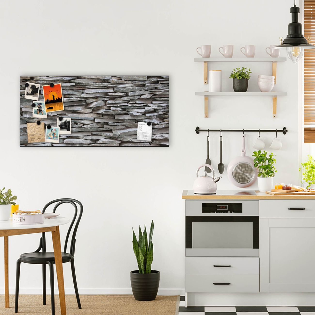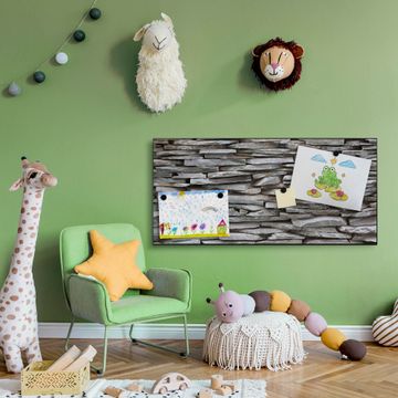 FUNKTION:  Die banjado Magnettafel mit Motiv Steinwand Motiv bringt Ordnung in Ihr Zettelchaos. Fotos, Termine, Notizen oder Rezepte lassen Sich hier stilvoll mit Magneten ordnen, Sie behalten alles im Blick. An der Design Magnetwand halten alle handesüblichen Magnete. DESIGN:  Die Metall Pinnwand mit dem Motiv Motiv Steinwand ist ein eleganter Begleiter im Alltag. Mit dieser Magnettafel haben Sie auch ohne Notizen und Magnete ein schönes Dekoelement. Das Format bietet Ihnen ausreichend Platz um alle wichtigen Informationen im Blick zu behalten. DETAILS: Die magnetische Pinnwand besteht aus silber-grau, weiß oder schwarz lackiertem Stahl. Sie hat eine Größe von 78cm x 37cm. Es befinden sich auf der Rückseite vorgefertigte Löcher die eine schnelle und unkomplizierte Anbringung ermöglichen. Das Motiv ist mit einem seidenmatten Laminat versehen und schützt so zusätzlich vor Kratzern. NUTZEN:  Sie können diese Magnettafel wunderbar als Wandbild nutzen, es halten alle handelsüblichen Magneten daran. Das Memoboard ist mit einem feuchten Lappen oder Schwamm abwischbar. Sie finden bei uns eine große Auswahl an passenden Magneten. BANJADO:  Wir sind ein kleines Team aus dem Herzen von Sachsen. Wir fertigen alle Artikel von Hand für Sie an, Sie erhalten keine preiswerte Importware. Auf Wunsch können Sie auch Ihr eigenes Foto auf die Magnettafel aufbringen, schreiben Sie uns an. Herzlichst, Ihr banjado-Team