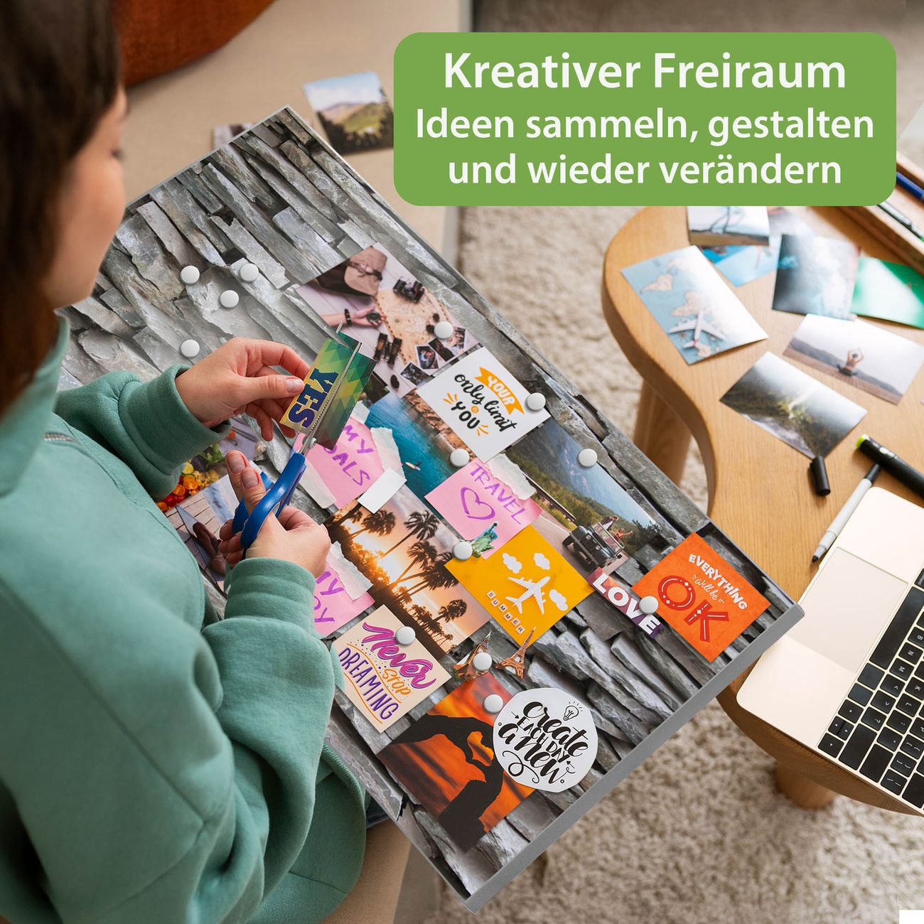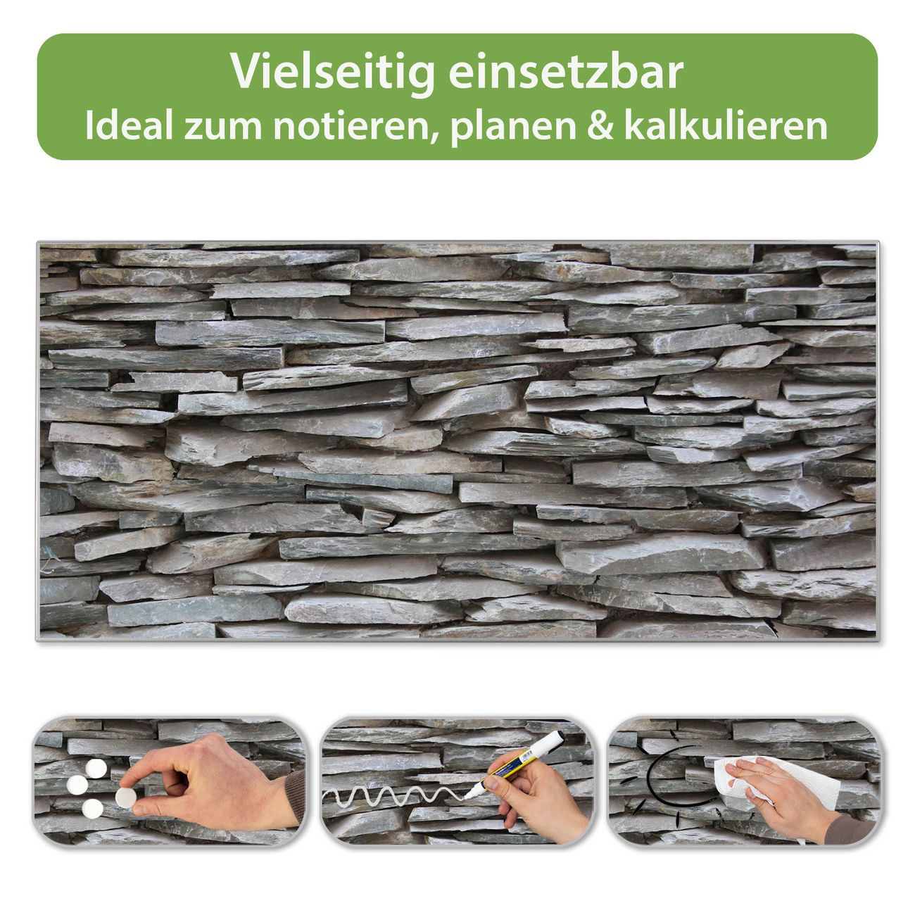 FUNKTION: Die banjado Magnettafel 78x37 cm im Design Motiv Steinwand vereint Funktionalität und modernes Wohndesign auf stilvolle Weise. Diese hochwertige Magnetwand aus Metall hilft Ihnen dabei, Notizen, Fotos, Termine, Einkaufslisten oder Rezepte übersichtlich zu organisieren. Als praktisches Memoboard sorgt sie für Struktur im Alltag und setzt gleichzeitig einen dekorativen Akzent an Ihrer Wand. DESIGN: Die Metalltafel besteht aus robustem, lackiertem Stahl und ist mit allen handelsüblichen Magneten nutzbar. Besonders praktisch ist die beschreibbare Oberfläche. Sie können die Magnettafel ganz einfach mit Kreidestiften beschriften und die Inhalte bei Bedarf mit einem feuchten Tuch wieder entfernen. So eignet sich das Memoboard ideal für Wochenpläne, Menüpläne, To Do Listen oder kreative Botschaften. DETAILS: Mit ihrem großzügigen Querformat von 78x37 cm bietet die Magnettafel ausreichend Platz für Ihre Organisation. Das Motiv Motiv Steinwand bringt eine warme, natürliche Optik in Küche, Flur, Büro oder Homeoffice und wirkt auch ohne Magnete oder Beschriftung wie ein modernes Wandbild. NUTZEN: Auf der Rückseite befinden sich vorgefertigte Löcher für eine schnelle und unkomplizierte Wandmontage. Jede banjado Magnettafel wird in Deutschland gefertigt und steht für Qualität, Langlebigkeit und liebevolle Verarbeitung. Dieses beschreibbare Memoboard ist die perfekte Kombination aus Metalltafel, Designobjekt und praktischer Magnetwand für Ihren Alltag. BANJADO: Wir sind ein kleines Team aus dem Herzen von Sachsen. Wir fertigen alle Artikel von Hand für Sie an, Sie erhalten keine preiswerte Importware. Auf Wunsch können Sie auch Ihr eigenes Foto auf die Magnettafel aufbringen, schreiben Sie uns an. Herzlichst, Ihr banjado-Team