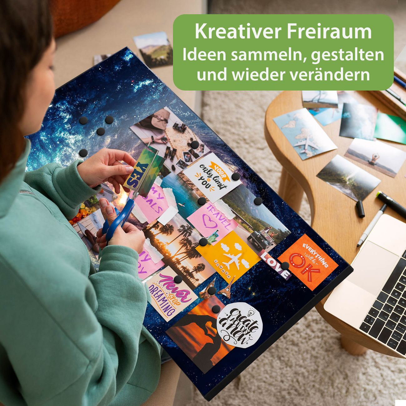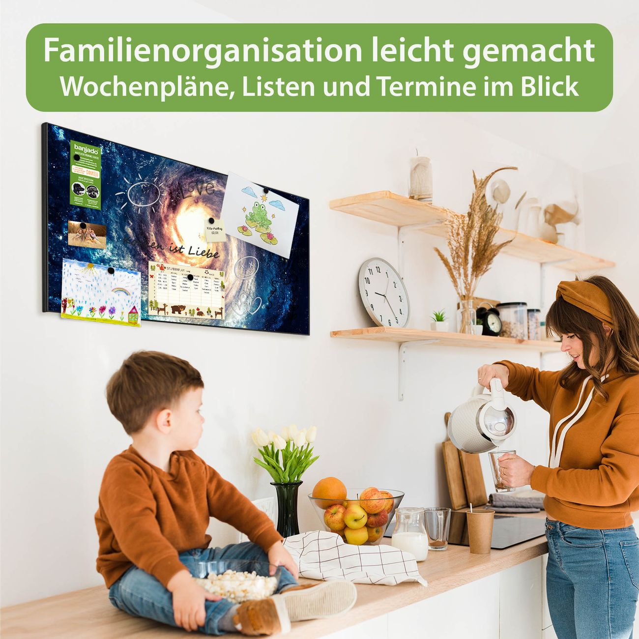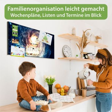 FUNKTION: Die banjado Magnettafel 78x37 cm im Design Motiv Sternenwirbel vereint Funktionalität und modernes Wohndesign auf stilvolle Weise. Diese hochwertige Magnetwand aus Metall hilft Ihnen dabei, Notizen, Fotos, Termine, Einkaufslisten oder Rezepte übersichtlich zu organisieren. Als praktisches Memoboard sorgt sie für Struktur im Alltag und setzt gleichzeitig einen dekorativen Akzent an Ihrer Wand. DESIGN: Die Metalltafel besteht aus robustem, lackiertem Stahl und ist mit allen handelsüblichen Magneten nutzbar. Besonders praktisch ist die beschreibbare Oberfläche. Sie können die Magnettafel ganz einfach mit Kreidestiften beschriften und die Inhalte bei Bedarf mit einem feuchten Tuch wieder entfernen. So eignet sich das Memoboard ideal für Wochenpläne, Menüpläne, To Do Listen oder kreative Botschaften. DETAILS: Mit ihrem großzügigen Querformat von 78x37 cm bietet die Magnettafel ausreichend Platz für Ihre Organisation. Das Motiv Motiv Sternenwirbel bringt eine warme, natürliche Optik in Küche, Flur, Büro oder Homeoffice und wirkt auch ohne Magnete oder Beschriftung wie ein modernes Wandbild. NUTZEN: Auf der Rückseite befinden sich vorgefertigte Löcher für eine schnelle und unkomplizierte Wandmontage. Jede banjado Magnettafel wird in Deutschland gefertigt und steht für Qualität, Langlebigkeit und liebevolle Verarbeitung. Dieses beschreibbare Memoboard ist die perfekte Kombination aus Metalltafel, Designobjekt und praktischer Magnetwand für Ihren Alltag. BANJADO: Wir sind ein kleines Team aus dem Herzen von Sachsen. Wir fertigen alle Artikel von Hand für Sie an, Sie erhalten keine preiswerte Importware. Auf Wunsch können Sie auch Ihr eigenes Foto auf die Magnettafel aufbringen, schreiben Sie uns an. Herzlichst, Ihr banjado-Team