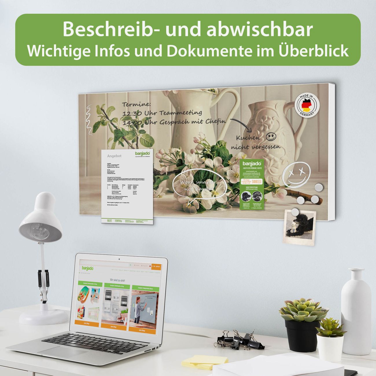 FUNKTION: Die banjado Magnettafel 78x37 cm im Design Motiv Stillleben Kirschblüten vereint Funktionalität und modernes Wohndesign auf stilvolle Weise. Diese hochwertige Magnetwand aus Metall hilft Ihnen dabei, Notizen, Fotos, Termine, Einkaufslisten oder Rezepte übersichtlich zu organisieren. Als praktisches Memoboard sorgt sie für Struktur im Alltag und setzt gleichzeitig einen dekorativen Akzent an Ihrer Wand. DESIGN: Die Metalltafel besteht aus robustem, lackiertem Stahl und ist mit allen handelsüblichen Magneten nutzbar. Besonders praktisch ist die beschreibbare Oberfläche. Sie können die Magnettafel ganz einfach mit Kreidestiften beschriften und die Inhalte bei Bedarf mit einem feuchten Tuch wieder entfernen. So eignet sich das Memoboard ideal für Wochenpläne, Menüpläne, To Do Listen oder kreative Botschaften. DETAILS: Mit ihrem großzügigen Querformat von 78x37 cm bietet die Magnettafel ausreichend Platz für Ihre Organisation. Das Motiv Motiv Stillleben Kirschblüten bringt eine warme, natürliche Optik in Küche, Flur, Büro oder Homeoffice und wirkt auch ohne Magnete oder Beschriftung wie ein modernes Wandbild. NUTZEN: Auf der Rückseite befinden sich vorgefertigte Löcher für eine schnelle und unkomplizierte Wandmontage. Jede banjado Magnettafel wird in Deutschland gefertigt und steht für Qualität, Langlebigkeit und liebevolle Verarbeitung. Dieses beschreibbare Memoboard ist die perfekte Kombination aus Metalltafel, Designobjekt und praktischer Magnetwand für Ihren Alltag. BANJADO: Wir sind ein kleines Team aus dem Herzen von Sachsen. Wir fertigen alle Artikel von Hand für Sie an, Sie erhalten keine preiswerte Importware. Auf Wunsch können Sie auch Ihr eigenes Foto auf die Magnettafel aufbringen, schreiben Sie uns an. Herzlichst, Ihr banjado-Team