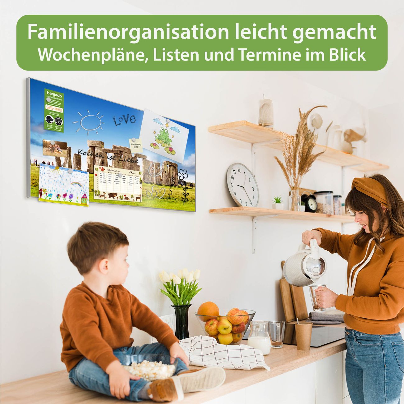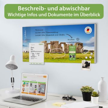 FUNKTION: Die banjado Magnettafel 78x37 cm im Design Motiv Stonehenge vereint Funktionalität und modernes Wohndesign auf stilvolle Weise. Diese hochwertige Magnetwand aus Metall hilft Ihnen dabei, Notizen, Fotos, Termine, Einkaufslisten oder Rezepte übersichtlich zu organisieren. Als praktisches Memoboard sorgt sie für Struktur im Alltag und setzt gleichzeitig einen dekorativen Akzent an Ihrer Wand. DESIGN: Die Metalltafel besteht aus robustem, lackiertem Stahl und ist mit allen handelsüblichen Magneten nutzbar. Besonders praktisch ist die beschreibbare Oberfläche. Sie können die Magnettafel ganz einfach mit Kreidestiften beschriften und die Inhalte bei Bedarf mit einem feuchten Tuch wieder entfernen. So eignet sich das Memoboard ideal für Wochenpläne, Menüpläne, To Do Listen oder kreative Botschaften. DETAILS: Mit ihrem großzügigen Querformat von 78x37 cm bietet die Magnettafel ausreichend Platz für Ihre Organisation. Das Motiv Motiv Stonehenge bringt eine warme, natürliche Optik in Küche, Flur, Büro oder Homeoffice und wirkt auch ohne Magnete oder Beschriftung wie ein modernes Wandbild. NUTZEN: Auf der Rückseite befinden sich vorgefertigte Löcher für eine schnelle und unkomplizierte Wandmontage. Jede banjado Magnettafel wird in Deutschland gefertigt und steht für Qualität, Langlebigkeit und liebevolle Verarbeitung. Dieses beschreibbare Memoboard ist die perfekte Kombination aus Metalltafel, Designobjekt und praktischer Magnetwand für Ihren Alltag. BANJADO: Wir sind ein kleines Team aus dem Herzen von Sachsen. Wir fertigen alle Artikel von Hand für Sie an, Sie erhalten keine preiswerte Importware. Auf Wunsch können Sie auch Ihr eigenes Foto auf die Magnettafel aufbringen, schreiben Sie uns an. Herzlichst, Ihr banjado-Team