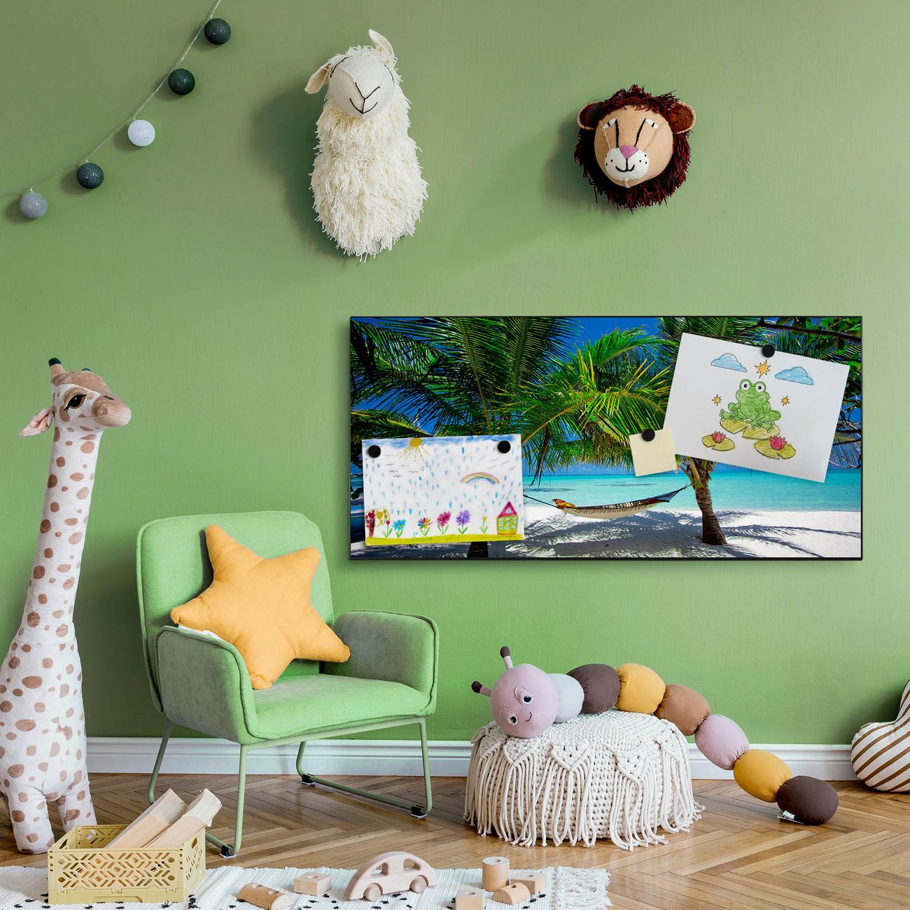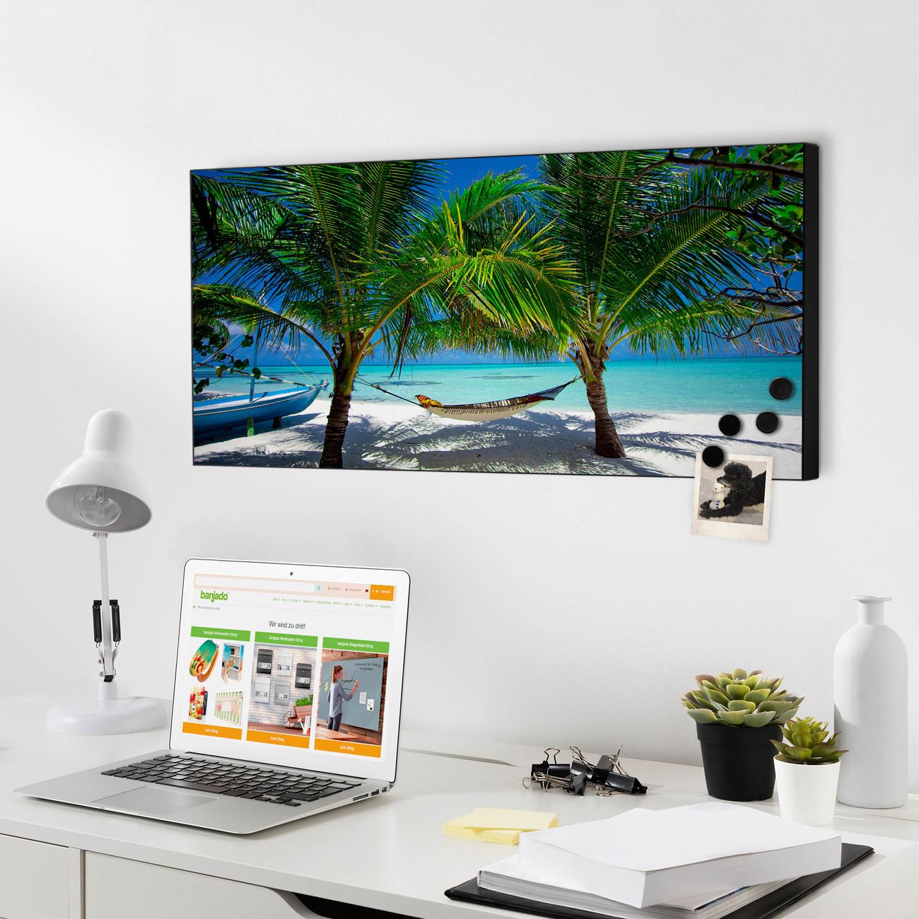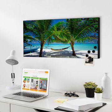 FUNKTION:  Die banjado Magnettafel mit Motiv Strand Motiv bringt Ordnung in Ihr Zettelchaos. Fotos, Termine, Notizen oder Rezepte lassen Sich hier stilvoll mit Magneten ordnen, Sie behalten alles im Blick. An der Design Magnetwand halten alle handesüblichen Magnete. DESIGN:  Die Metall Pinnwand mit dem Motiv Motiv Strand ist ein eleganter Begleiter im Alltag. Mit dieser Magnettafel haben Sie auch ohne Notizen und Magnete ein schönes Dekoelement. Das Format bietet Ihnen ausreichend Platz um alle wichtigen Informationen im Blick zu behalten. DETAILS: Die magnetische Pinnwand besteht aus silber-grau, weiß oder schwarz lackiertem Stahl. Sie hat eine Größe von 78cm x 37cm. Es befinden sich auf der Rückseite vorgefertigte Löcher die eine schnelle und unkomplizierte Anbringung ermöglichen. Das Motiv ist mit einem seidenmatten Laminat versehen und schützt so zusätzlich vor Kratzern. NUTZEN:  Sie können diese Magnettafel wunderbar als Wandbild nutzen, es halten alle handelsüblichen Magneten daran. Das Memoboard ist mit einem feuchten Lappen oder Schwamm abwischbar. Sie finden bei uns eine große Auswahl an passenden Magneten. BANJADO:  Wir sind ein kleines Team aus dem Herzen von Sachsen. Wir fertigen alle Artikel von Hand für Sie an, Sie erhalten keine preiswerte Importware. Auf Wunsch können Sie auch Ihr eigenes Foto auf die Magnettafel aufbringen, schreiben Sie uns an. Herzlichst, Ihr banjado-Team