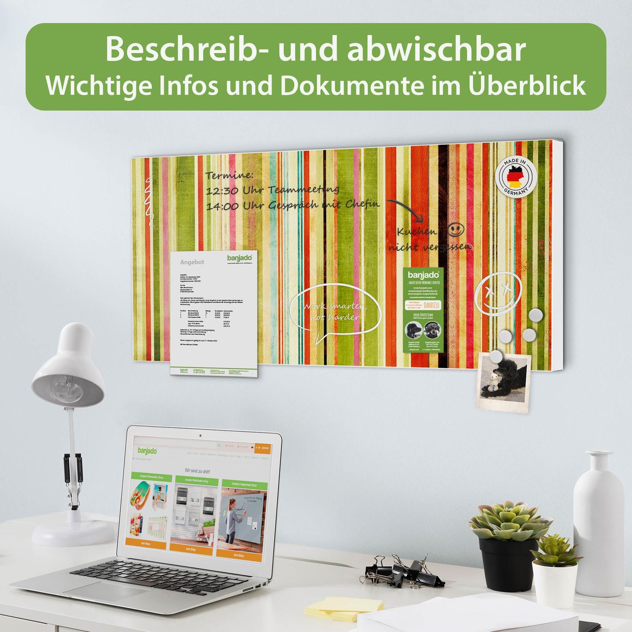 FUNKTION: Die banjado Magnettafel 78x37 cm im Design Motiv Streifen vereint Funktionalität und modernes Wohndesign auf stilvolle Weise. Diese hochwertige Magnetwand aus Metall hilft Ihnen dabei, Notizen, Fotos, Termine, Einkaufslisten oder Rezepte übersichtlich zu organisieren. Als praktisches Memoboard sorgt sie für Struktur im Alltag und setzt gleichzeitig einen dekorativen Akzent an Ihrer Wand. DESIGN: Die Metalltafel besteht aus robustem, lackiertem Stahl und ist mit allen handelsüblichen Magneten nutzbar. Besonders praktisch ist die beschreibbare Oberfläche. Sie können die Magnettafel ganz einfach mit Kreidestiften beschriften und die Inhalte bei Bedarf mit einem feuchten Tuch wieder entfernen. So eignet sich das Memoboard ideal für Wochenpläne, Menüpläne, To Do Listen oder kreative Botschaften. DETAILS: Mit ihrem großzügigen Querformat von 78x37 cm bietet die Magnettafel ausreichend Platz für Ihre Organisation. Das Motiv Motiv Streifen bringt eine warme, natürliche Optik in Küche, Flur, Büro oder Homeoffice und wirkt auch ohne Magnete oder Beschriftung wie ein modernes Wandbild. NUTZEN: Auf der Rückseite befinden sich vorgefertigte Löcher für eine schnelle und unkomplizierte Wandmontage. Jede banjado Magnettafel wird in Deutschland gefertigt und steht für Qualität, Langlebigkeit und liebevolle Verarbeitung. Dieses beschreibbare Memoboard ist die perfekte Kombination aus Metalltafel, Designobjekt und praktischer Magnetwand für Ihren Alltag. BANJADO: Wir sind ein kleines Team aus dem Herzen von Sachsen. Wir fertigen alle Artikel von Hand für Sie an, Sie erhalten keine preiswerte Importware. Auf Wunsch können Sie auch Ihr eigenes Foto auf die Magnettafel aufbringen, schreiben Sie uns an. Herzlichst, Ihr banjado-Team