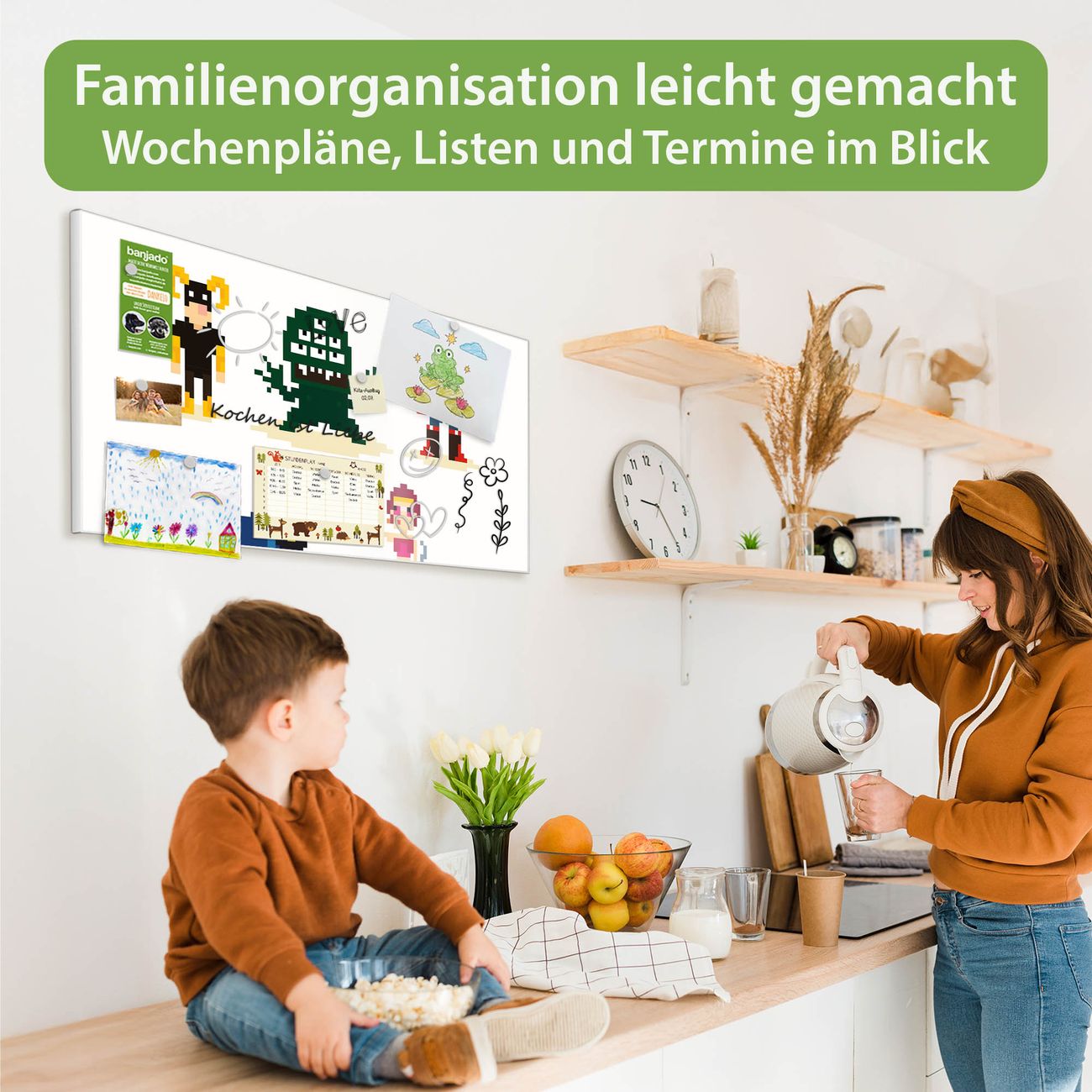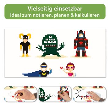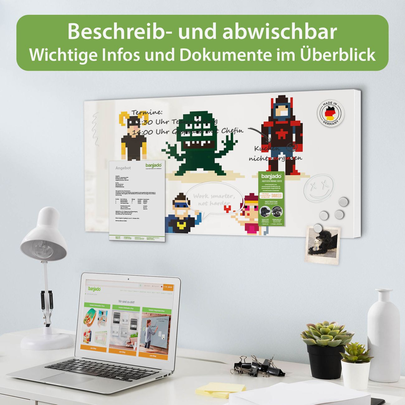 FUNKTION: Die banjado Magnettafel 78x37 cm im Design Motiv Superhelden vereint Funktionalität und modernes Wohndesign auf stilvolle Weise. Diese hochwertige Magnetwand aus Metall hilft Ihnen dabei, Notizen, Fotos, Termine, Einkaufslisten oder Rezepte übersichtlich zu organisieren. Als praktisches Memoboard sorgt sie für Struktur im Alltag und setzt gleichzeitig einen dekorativen Akzent an Ihrer Wand. DESIGN: Die Metalltafel besteht aus robustem, lackiertem Stahl und ist mit allen handelsüblichen Magneten nutzbar. Besonders praktisch ist die beschreibbare Oberfläche. Sie können die Magnettafel ganz einfach mit Kreidestiften beschriften und die Inhalte bei Bedarf mit einem feuchten Tuch wieder entfernen. So eignet sich das Memoboard ideal für Wochenpläne, Menüpläne, To Do Listen oder kreative Botschaften. DETAILS: Mit ihrem großzügigen Querformat von 78x37 cm bietet die Magnettafel ausreichend Platz für Ihre Organisation. Das Motiv Motiv Superhelden bringt eine warme, natürliche Optik in Küche, Flur, Büro oder Homeoffice und wirkt auch ohne Magnete oder Beschriftung wie ein modernes Wandbild. NUTZEN: Auf der Rückseite befinden sich vorgefertigte Löcher für eine schnelle und unkomplizierte Wandmontage. Jede banjado Magnettafel wird in Deutschland gefertigt und steht für Qualität, Langlebigkeit und liebevolle Verarbeitung. Dieses beschreibbare Memoboard ist die perfekte Kombination aus Metalltafel, Designobjekt und praktischer Magnetwand für Ihren Alltag. BANJADO: Wir sind ein kleines Team aus dem Herzen von Sachsen. Wir fertigen alle Artikel von Hand für Sie an, Sie erhalten keine preiswerte Importware. Auf Wunsch können Sie auch Ihr eigenes Foto auf die Magnettafel aufbringen, schreiben Sie uns an. Herzlichst, Ihr banjado-Team