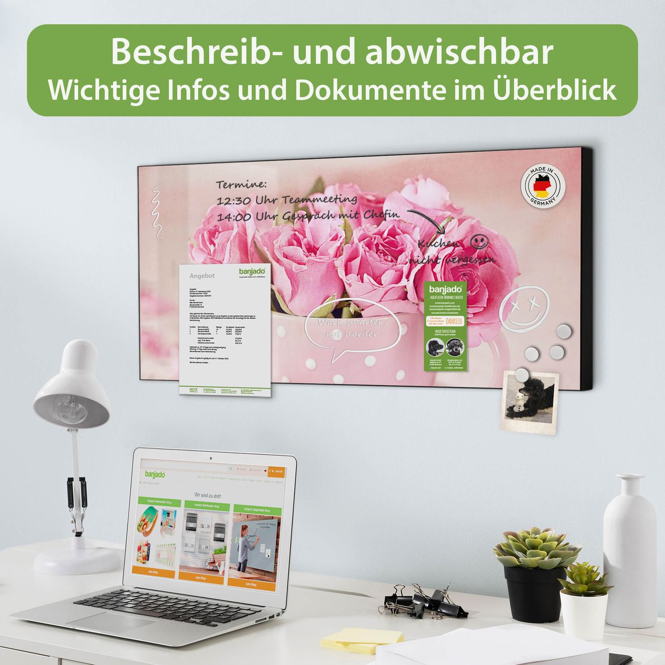 FUNKTION: Die banjado Magnettafel 78x37 cm im Design Motiv Tasse Voll Rosen vereint Funktionalität und modernes Wohndesign auf stilvolle Weise. Diese hochwertige Magnetwand aus Metall hilft Ihnen dabei, Notizen, Fotos, Termine, Einkaufslisten oder Rezepte übersichtlich zu organisieren. Als praktisches Memoboard sorgt sie für Struktur im Alltag und setzt gleichzeitig einen dekorativen Akzent an Ihrer Wand. DESIGN: Die Metalltafel besteht aus robustem, lackiertem Stahl und ist mit allen handelsüblichen Magneten nutzbar. Besonders praktisch ist die beschreibbare Oberfläche. Sie können die Magnettafel ganz einfach mit Kreidestiften beschriften und die Inhalte bei Bedarf mit einem feuchten Tuch wieder entfernen. So eignet sich das Memoboard ideal für Wochenpläne, Menüpläne, To Do Listen oder kreative Botschaften. DETAILS: Mit ihrem großzügigen Querformat von 78x37 cm bietet die Magnettafel ausreichend Platz für Ihre Organisation. Das Motiv Motiv Tasse Voll Rosen bringt eine warme, natürliche Optik in Küche, Flur, Büro oder Homeoffice und wirkt auch ohne Magnete oder Beschriftung wie ein modernes Wandbild. NUTZEN: Auf der Rückseite befinden sich vorgefertigte Löcher für eine schnelle und unkomplizierte Wandmontage. Jede banjado Magnettafel wird in Deutschland gefertigt und steht für Qualität, Langlebigkeit und liebevolle Verarbeitung. Dieses beschreibbare Memoboard ist die perfekte Kombination aus Metalltafel, Designobjekt und praktischer Magnetwand für Ihren Alltag. BANJADO: Wir sind ein kleines Team aus dem Herzen von Sachsen. Wir fertigen alle Artikel von Hand für Sie an, Sie erhalten keine preiswerte Importware. Auf Wunsch können Sie auch Ihr eigenes Foto auf die Magnettafel aufbringen, schreiben Sie uns an. Herzlichst, Ihr banjado-Team