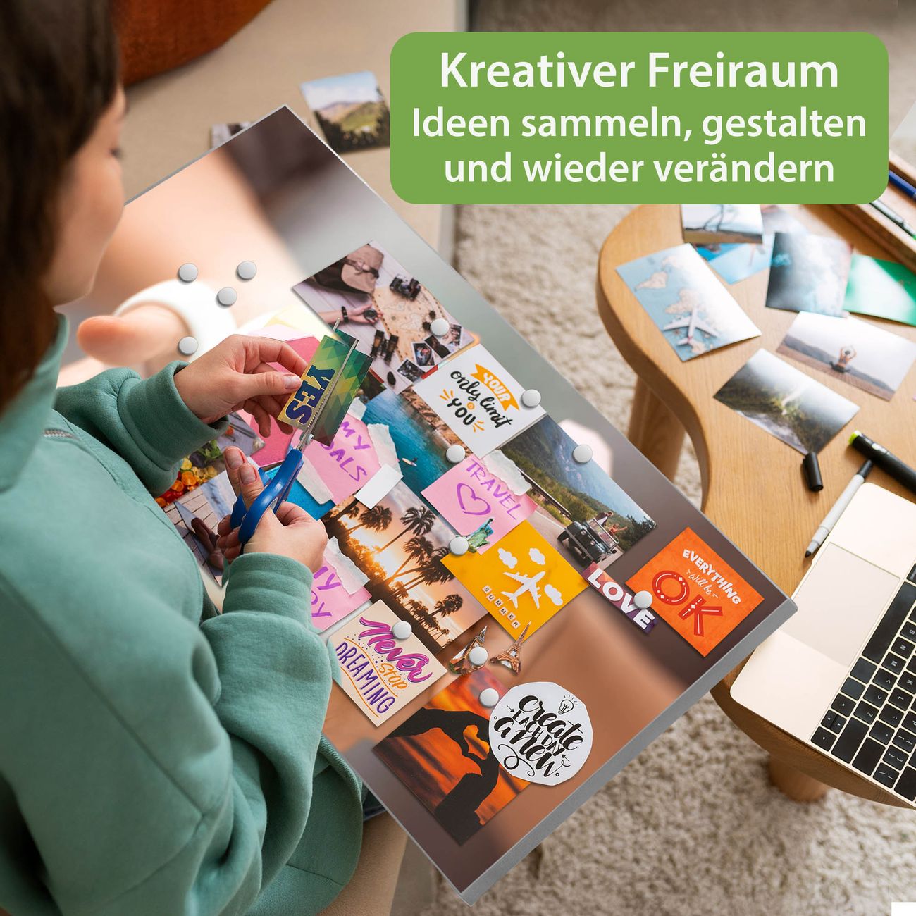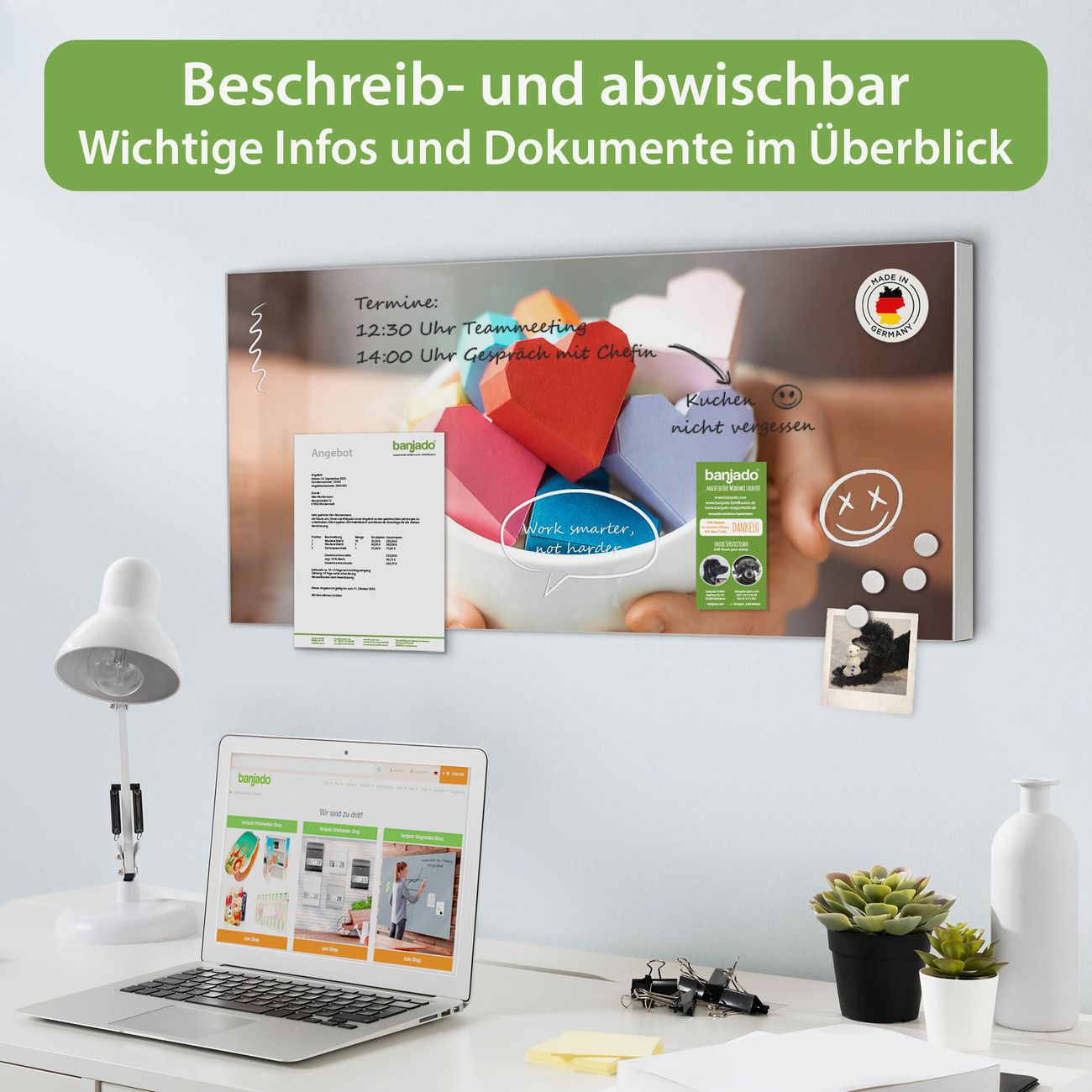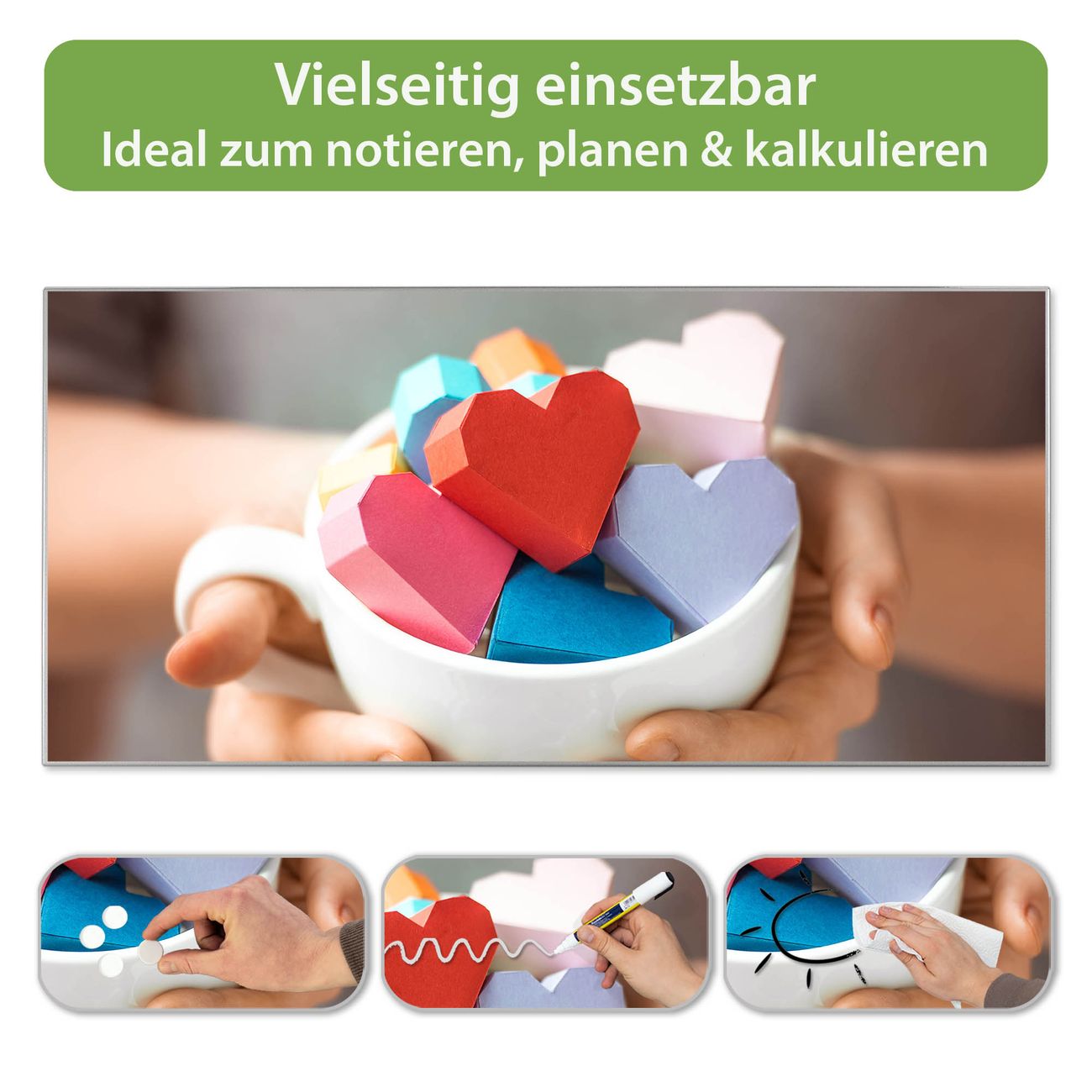 FUNKTION: Die banjado Magnettafel 78x37 cm im Design Motiv Tasse voller Herzen vereint Funktionalität und modernes Wohndesign auf stilvolle Weise. Diese hochwertige Magnetwand aus Metall hilft Ihnen dabei, Notizen, Fotos, Termine, Einkaufslisten oder Rezepte übersichtlich zu organisieren. Als praktisches Memoboard sorgt sie für Struktur im Alltag und setzt gleichzeitig einen dekorativen Akzent an Ihrer Wand. DESIGN: Die Metalltafel besteht aus robustem, lackiertem Stahl und ist mit allen handelsüblichen Magneten nutzbar. Besonders praktisch ist die beschreibbare Oberfläche. Sie können die Magnettafel ganz einfach mit Kreidestiften beschriften und die Inhalte bei Bedarf mit einem feuchten Tuch wieder entfernen. So eignet sich das Memoboard ideal für Wochenpläne, Menüpläne, To Do Listen oder kreative Botschaften. DETAILS: Mit ihrem großzügigen Querformat von 78x37 cm bietet die Magnettafel ausreichend Platz für Ihre Organisation. Das Motiv Motiv Tasse voller Herzen bringt eine warme, natürliche Optik in Küche, Flur, Büro oder Homeoffice und wirkt auch ohne Magnete oder Beschriftung wie ein modernes Wandbild. NUTZEN: Auf der Rückseite befinden sich vorgefertigte Löcher für eine schnelle und unkomplizierte Wandmontage. Jede banjado Magnettafel wird in Deutschland gefertigt und steht für Qualität, Langlebigkeit und liebevolle Verarbeitung. Dieses beschreibbare Memoboard ist die perfekte Kombination aus Metalltafel, Designobjekt und praktischer Magnetwand für Ihren Alltag. BANJADO: Wir sind ein kleines Team aus dem Herzen von Sachsen. Wir fertigen alle Artikel von Hand für Sie an, Sie erhalten keine preiswerte Importware. Auf Wunsch können Sie auch Ihr eigenes Foto auf die Magnettafel aufbringen, schreiben Sie uns an. Herzlichst, Ihr banjado-Team
