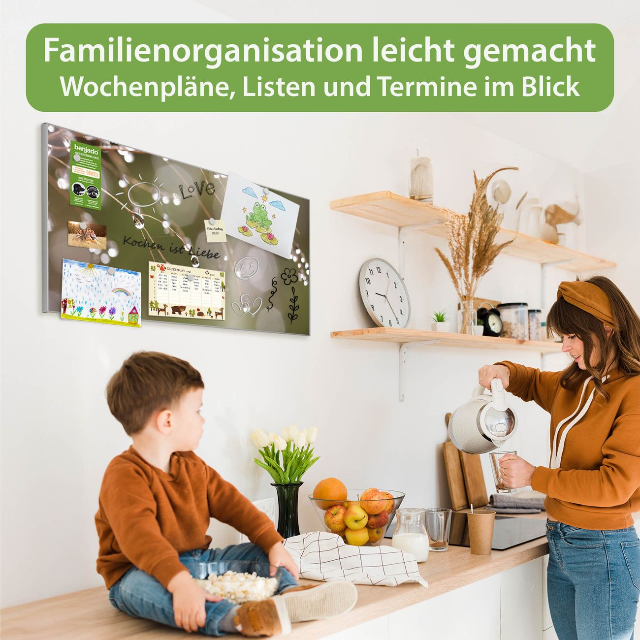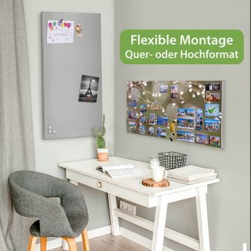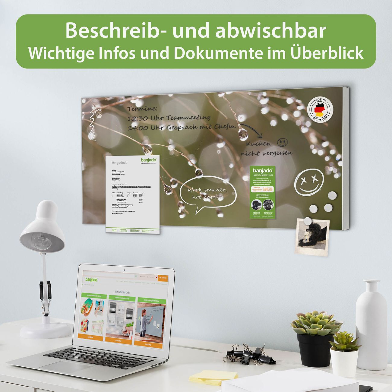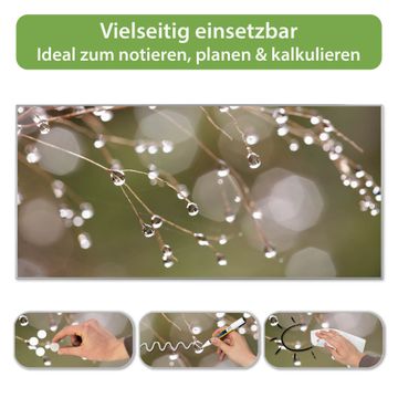 FUNKTION: Die banjado Magnettafel 78x37 cm im Design Motiv Tau Auf Zweigen vereint Funktionalität und modernes Wohndesign auf stilvolle Weise. Diese hochwertige Magnetwand aus Metall hilft Ihnen dabei, Notizen, Fotos, Termine, Einkaufslisten oder Rezepte übersichtlich zu organisieren. Als praktisches Memoboard sorgt sie für Struktur im Alltag und setzt gleichzeitig einen dekorativen Akzent an Ihrer Wand. DESIGN: Die Metalltafel besteht aus robustem, lackiertem Stahl und ist mit allen handelsüblichen Magneten nutzbar. Besonders praktisch ist die beschreibbare Oberfläche. Sie können die Magnettafel ganz einfach mit Kreidestiften beschriften und die Inhalte bei Bedarf mit einem feuchten Tuch wieder entfernen. So eignet sich das Memoboard ideal für Wochenpläne, Menüpläne, To Do Listen oder kreative Botschaften. DETAILS: Mit ihrem großzügigen Querformat von 78x37 cm bietet die Magnettafel ausreichend Platz für Ihre Organisation. Das Motiv Motiv Tau Auf Zweigen bringt eine warme, natürliche Optik in Küche, Flur, Büro oder Homeoffice und wirkt auch ohne Magnete oder Beschriftung wie ein modernes Wandbild. NUTZEN: Auf der Rückseite befinden sich vorgefertigte Löcher für eine schnelle und unkomplizierte Wandmontage. Jede banjado Magnettafel wird in Deutschland gefertigt und steht für Qualität, Langlebigkeit und liebevolle Verarbeitung. Dieses beschreibbare Memoboard ist die perfekte Kombination aus Metalltafel, Designobjekt und praktischer Magnetwand für Ihren Alltag. BANJADO: Wir sind ein kleines Team aus dem Herzen von Sachsen. Wir fertigen alle Artikel von Hand für Sie an, Sie erhalten keine preiswerte Importware. Auf Wunsch können Sie auch Ihr eigenes Foto auf die Magnettafel aufbringen, schreiben Sie uns an. Herzlichst, Ihr banjado-Team