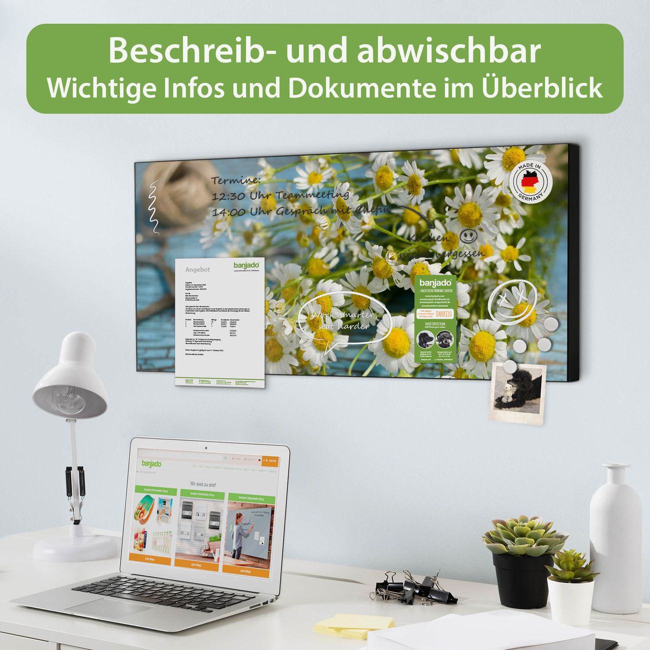 FUNKTION: Die banjado Magnettafel 78x37 cm im Design Motiv Tausendschön vereint Funktionalität und modernes Wohndesign auf stilvolle Weise. Diese hochwertige Magnetwand aus Metall hilft Ihnen dabei, Notizen, Fotos, Termine, Einkaufslisten oder Rezepte übersichtlich zu organisieren. Als praktisches Memoboard sorgt sie für Struktur im Alltag und setzt gleichzeitig einen dekorativen Akzent an Ihrer Wand. DESIGN: Die Metalltafel besteht aus robustem, lackiertem Stahl und ist mit allen handelsüblichen Magneten nutzbar. Besonders praktisch ist die beschreibbare Oberfläche. Sie können die Magnettafel ganz einfach mit Kreidestiften beschriften und die Inhalte bei Bedarf mit einem feuchten Tuch wieder entfernen. So eignet sich das Memoboard ideal für Wochenpläne, Menüpläne, To Do Listen oder kreative Botschaften. DETAILS: Mit ihrem großzügigen Querformat von 78x37 cm bietet die Magnettafel ausreichend Platz für Ihre Organisation. Das Motiv Motiv Tausendschön bringt eine warme, natürliche Optik in Küche, Flur, Büro oder Homeoffice und wirkt auch ohne Magnete oder Beschriftung wie ein modernes Wandbild. NUTZEN: Auf der Rückseite befinden sich vorgefertigte Löcher für eine schnelle und unkomplizierte Wandmontage. Jede banjado Magnettafel wird in Deutschland gefertigt und steht für Qualität, Langlebigkeit und liebevolle Verarbeitung. Dieses beschreibbare Memoboard ist die perfekte Kombination aus Metalltafel, Designobjekt und praktischer Magnetwand für Ihren Alltag. BANJADO: Wir sind ein kleines Team aus dem Herzen von Sachsen. Wir fertigen alle Artikel von Hand für Sie an, Sie erhalten keine preiswerte Importware. Auf Wunsch können Sie auch Ihr eigenes Foto auf die Magnettafel aufbringen, schreiben Sie uns an. Herzlichst, Ihr banjado-Team