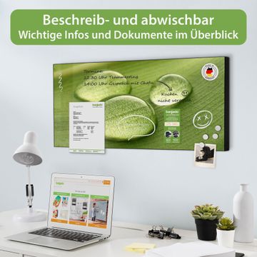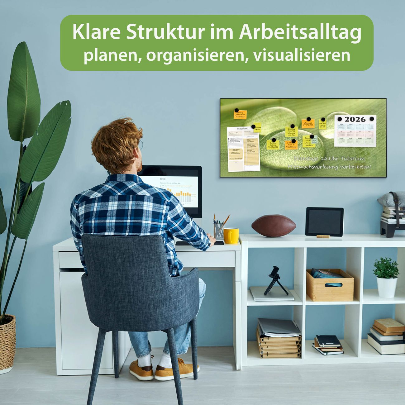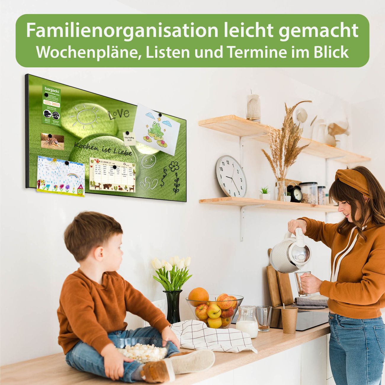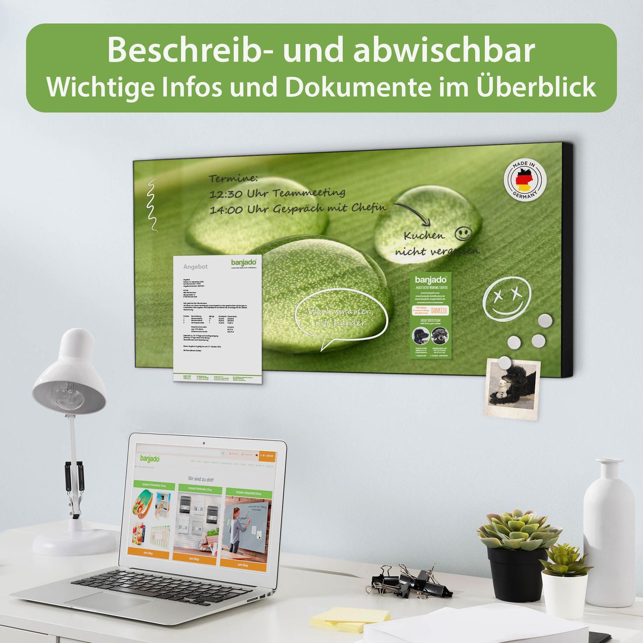 FUNKTION: Die banjado Magnettafel 78x37 cm im Design Motiv Tautropfen vereint Funktionalität und modernes Wohndesign auf stilvolle Weise. Diese hochwertige Magnetwand aus Metall hilft Ihnen dabei, Notizen, Fotos, Termine, Einkaufslisten oder Rezepte übersichtlich zu organisieren. Als praktisches Memoboard sorgt sie für Struktur im Alltag und setzt gleichzeitig einen dekorativen Akzent an Ihrer Wand. DESIGN: Die Metalltafel besteht aus robustem, lackiertem Stahl und ist mit allen handelsüblichen Magneten nutzbar. Besonders praktisch ist die beschreibbare Oberfläche. Sie können die Magnettafel ganz einfach mit Kreidestiften beschriften und die Inhalte bei Bedarf mit einem feuchten Tuch wieder entfernen. So eignet sich das Memoboard ideal für Wochenpläne, Menüpläne, To Do Listen oder kreative Botschaften. DETAILS: Mit ihrem großzügigen Querformat von 78x37 cm bietet die Magnettafel ausreichend Platz für Ihre Organisation. Das Motiv Motiv Tautropfen bringt eine warme, natürliche Optik in Küche, Flur, Büro oder Homeoffice und wirkt auch ohne Magnete oder Beschriftung wie ein modernes Wandbild. NUTZEN: Auf der Rückseite befinden sich vorgefertigte Löcher für eine schnelle und unkomplizierte Wandmontage. Jede banjado Magnettafel wird in Deutschland gefertigt und steht für Qualität, Langlebigkeit und liebevolle Verarbeitung. Dieses beschreibbare Memoboard ist die perfekte Kombination aus Metalltafel, Designobjekt und praktischer Magnetwand für Ihren Alltag. BANJADO: Wir sind ein kleines Team aus dem Herzen von Sachsen. Wir fertigen alle Artikel von Hand für Sie an, Sie erhalten keine preiswerte Importware. Auf Wunsch können Sie auch Ihr eigenes Foto auf die Magnettafel aufbringen, schreiben Sie uns an. Herzlichst, Ihr banjado-Team