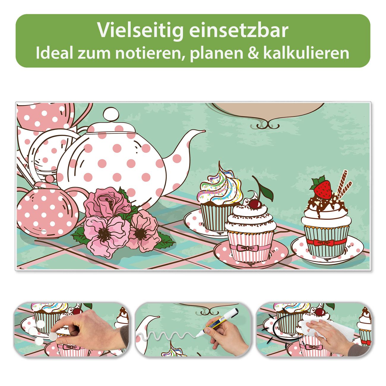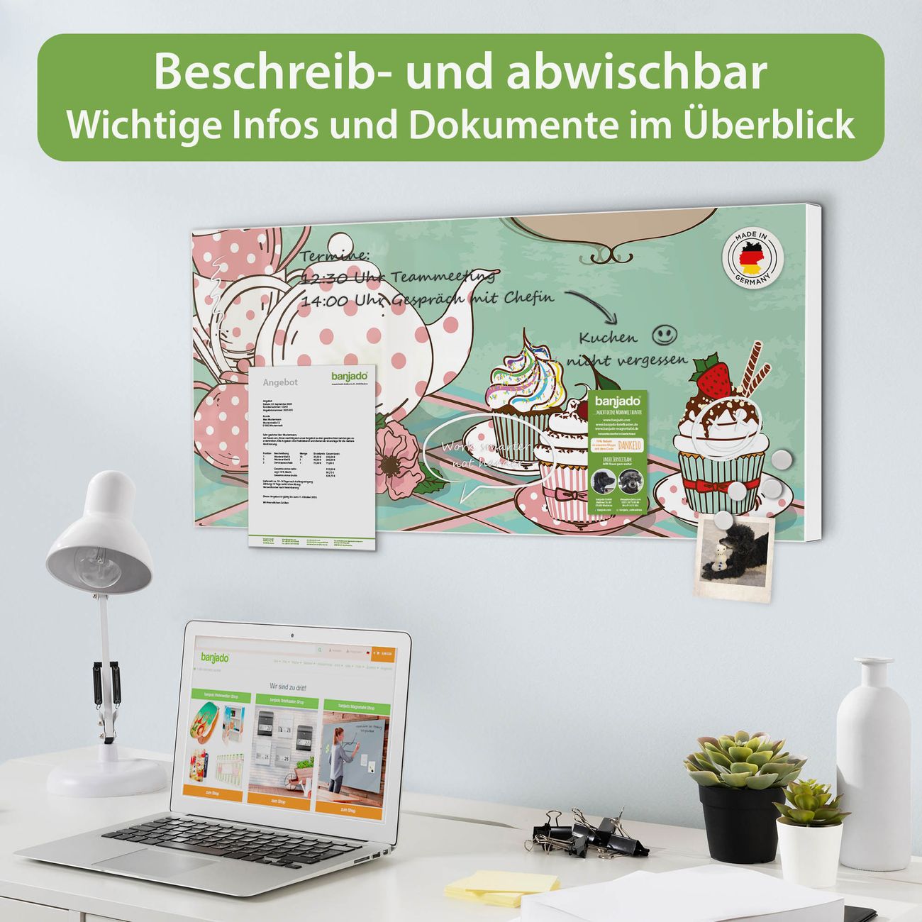 FUNKTION: Die banjado Magnettafel 78x37 cm im Design Motiv Tea Time vereint Funktionalität und modernes Wohndesign auf stilvolle Weise. Diese hochwertige Magnetwand aus Metall hilft Ihnen dabei, Notizen, Fotos, Termine, Einkaufslisten oder Rezepte übersichtlich zu organisieren. Als praktisches Memoboard sorgt sie für Struktur im Alltag und setzt gleichzeitig einen dekorativen Akzent an Ihrer Wand. DESIGN: Die Metalltafel besteht aus robustem, lackiertem Stahl und ist mit allen handelsüblichen Magneten nutzbar. Besonders praktisch ist die beschreibbare Oberfläche. Sie können die Magnettafel ganz einfach mit Kreidestiften beschriften und die Inhalte bei Bedarf mit einem feuchten Tuch wieder entfernen. So eignet sich das Memoboard ideal für Wochenpläne, Menüpläne, To Do Listen oder kreative Botschaften. DETAILS: Mit ihrem großzügigen Querformat von 78x37 cm bietet die Magnettafel ausreichend Platz für Ihre Organisation. Das Motiv Motiv Tea Time bringt eine warme, natürliche Optik in Küche, Flur, Büro oder Homeoffice und wirkt auch ohne Magnete oder Beschriftung wie ein modernes Wandbild. NUTZEN: Auf der Rückseite befinden sich vorgefertigte Löcher für eine schnelle und unkomplizierte Wandmontage. Jede banjado Magnettafel wird in Deutschland gefertigt und steht für Qualität, Langlebigkeit und liebevolle Verarbeitung. Dieses beschreibbare Memoboard ist die perfekte Kombination aus Metalltafel, Designobjekt und praktischer Magnetwand für Ihren Alltag. BANJADO: Wir sind ein kleines Team aus dem Herzen von Sachsen. Wir fertigen alle Artikel von Hand für Sie an, Sie erhalten keine preiswerte Importware. Auf Wunsch können Sie auch Ihr eigenes Foto auf die Magnettafel aufbringen, schreiben Sie uns an. Herzlichst, Ihr banjado-Team