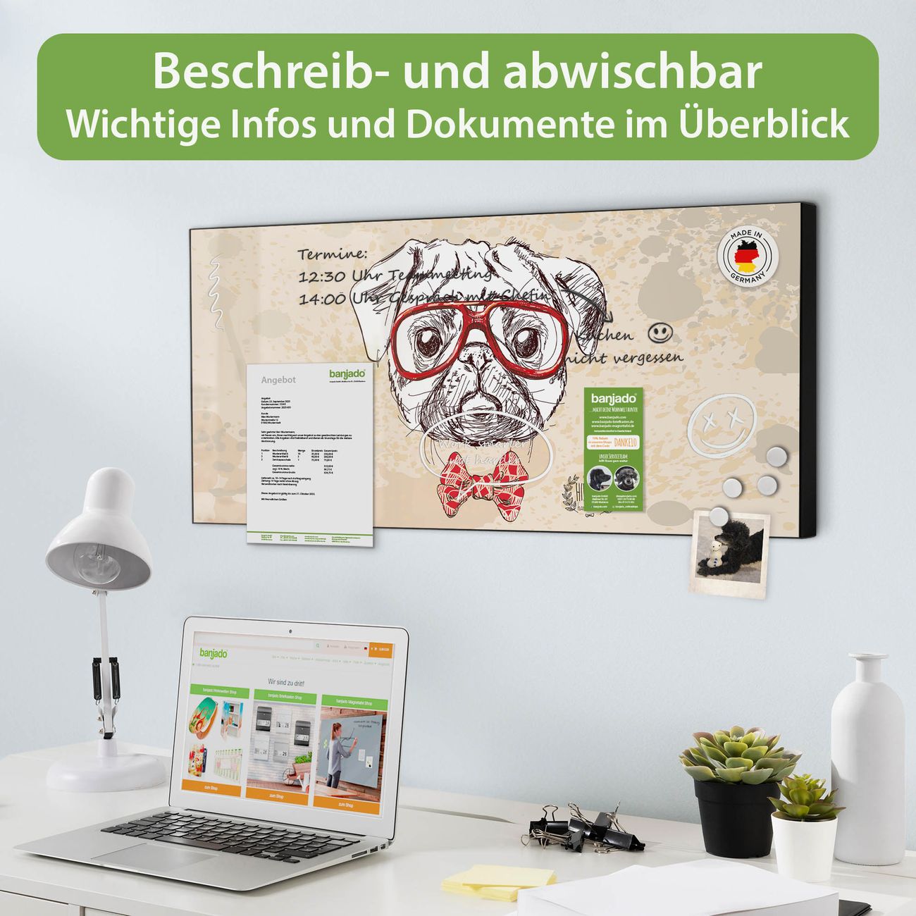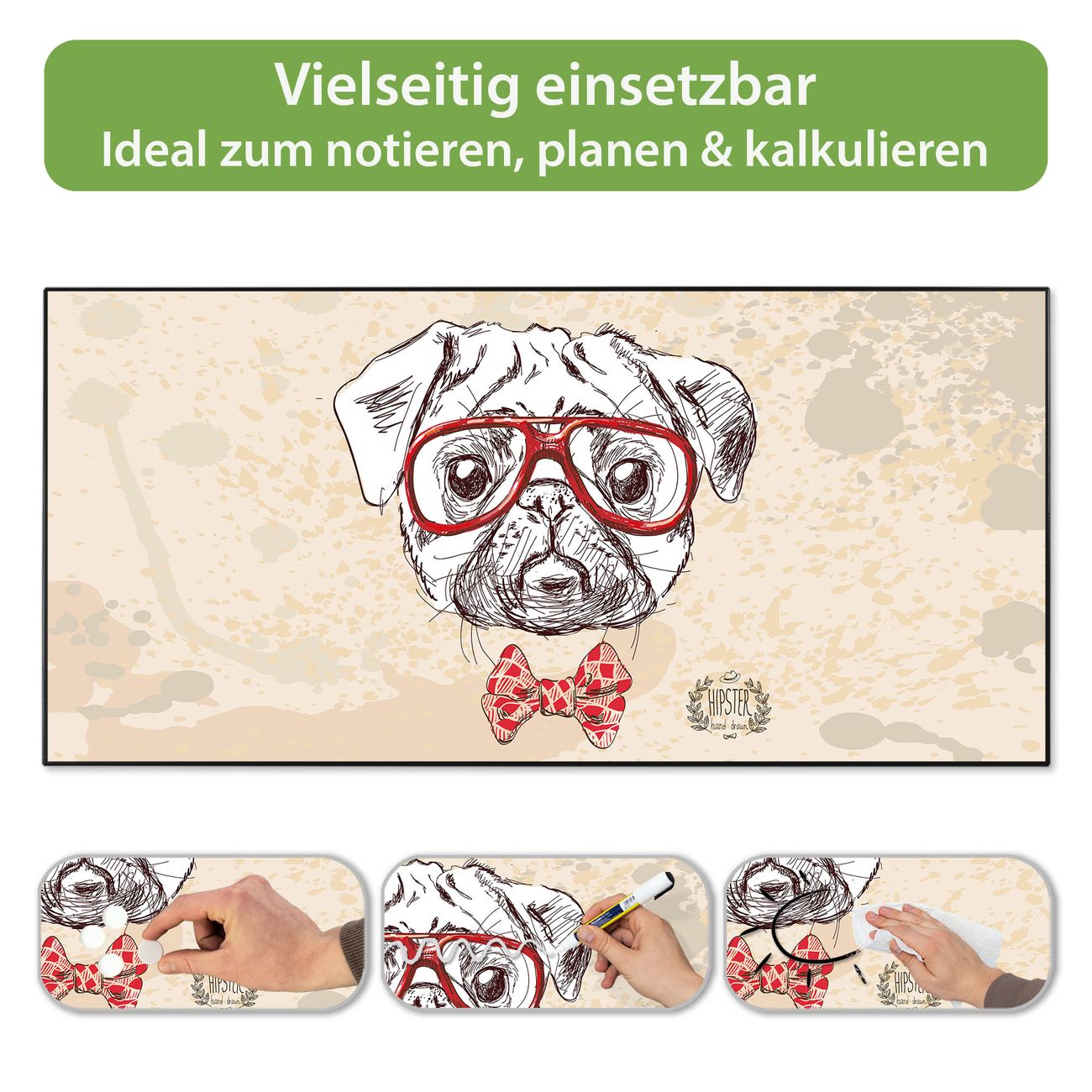 FUNKTION: Die banjado Magnettafel 78x37 cm im Design Motiv Timothy vereint Funktionalität und modernes Wohndesign auf stilvolle Weise. Diese hochwertige Magnetwand aus Metall hilft Ihnen dabei, Notizen, Fotos, Termine, Einkaufslisten oder Rezepte übersichtlich zu organisieren. Als praktisches Memoboard sorgt sie für Struktur im Alltag und setzt gleichzeitig einen dekorativen Akzent an Ihrer Wand. DESIGN: Die Metalltafel besteht aus robustem, lackiertem Stahl und ist mit allen handelsüblichen Magneten nutzbar. Besonders praktisch ist die beschreibbare Oberfläche. Sie können die Magnettafel ganz einfach mit Kreidestiften beschriften und die Inhalte bei Bedarf mit einem feuchten Tuch wieder entfernen. So eignet sich das Memoboard ideal für Wochenpläne, Menüpläne, To Do Listen oder kreative Botschaften. DETAILS: Mit ihrem großzügigen Querformat von 78x37 cm bietet die Magnettafel ausreichend Platz für Ihre Organisation. Das Motiv Motiv Timothy bringt eine warme, natürliche Optik in Küche, Flur, Büro oder Homeoffice und wirkt auch ohne Magnete oder Beschriftung wie ein modernes Wandbild. NUTZEN: Auf der Rückseite befinden sich vorgefertigte Löcher für eine schnelle und unkomplizierte Wandmontage. Jede banjado Magnettafel wird in Deutschland gefertigt und steht für Qualität, Langlebigkeit und liebevolle Verarbeitung. Dieses beschreibbare Memoboard ist die perfekte Kombination aus Metalltafel, Designobjekt und praktischer Magnetwand für Ihren Alltag. BANJADO: Wir sind ein kleines Team aus dem Herzen von Sachsen. Wir fertigen alle Artikel von Hand für Sie an, Sie erhalten keine preiswerte Importware. Auf Wunsch können Sie auch Ihr eigenes Foto auf die Magnettafel aufbringen, schreiben Sie uns an. Herzlichst, Ihr banjado-Team