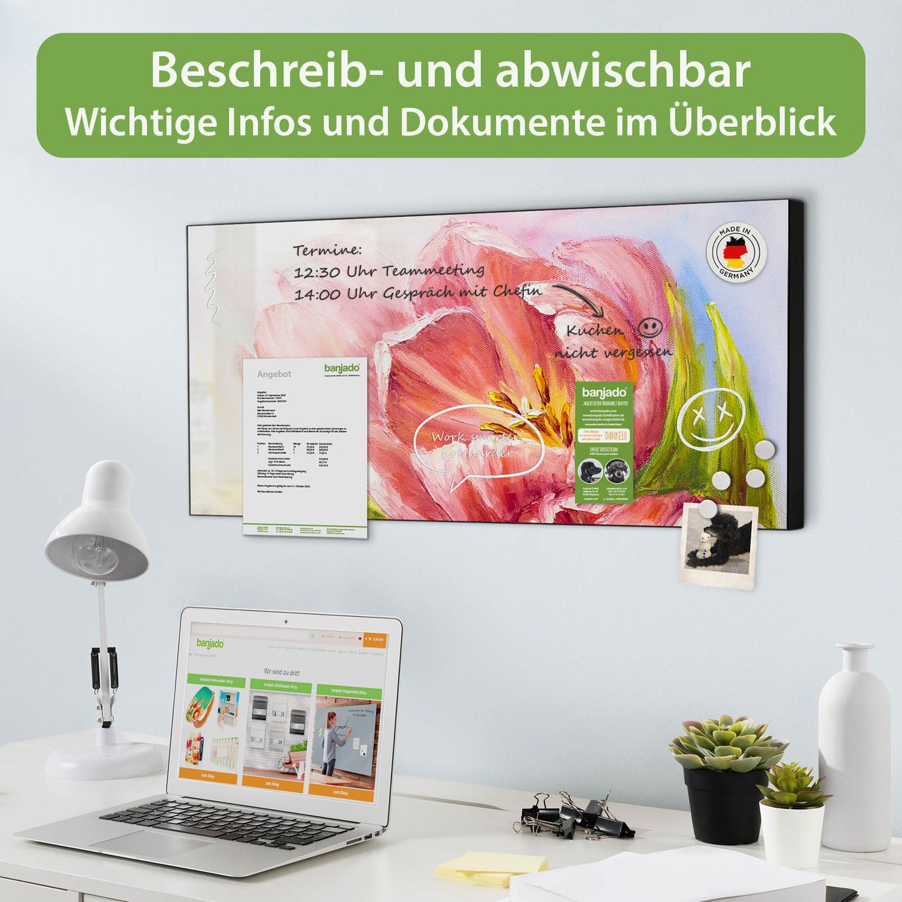 FUNKTION: Die banjado Magnettafel 78x37 cm im Design Motiv Tulpen Detail vereint Funktionalität und modernes Wohndesign auf stilvolle Weise. Diese hochwertige Magnetwand aus Metall hilft Ihnen dabei, Notizen, Fotos, Termine, Einkaufslisten oder Rezepte übersichtlich zu organisieren. Als praktisches Memoboard sorgt sie für Struktur im Alltag und setzt gleichzeitig einen dekorativen Akzent an Ihrer Wand. DESIGN: Die Metalltafel besteht aus robustem, lackiertem Stahl und ist mit allen handelsüblichen Magneten nutzbar. Besonders praktisch ist die beschreibbare Oberfläche. Sie können die Magnettafel ganz einfach mit Kreidestiften beschriften und die Inhalte bei Bedarf mit einem feuchten Tuch wieder entfernen. So eignet sich das Memoboard ideal für Wochenpläne, Menüpläne, To Do Listen oder kreative Botschaften. DETAILS: Mit ihrem großzügigen Querformat von 78x37 cm bietet die Magnettafel ausreichend Platz für Ihre Organisation. Das Motiv Motiv Tulpen Detail bringt eine warme, natürliche Optik in Küche, Flur, Büro oder Homeoffice und wirkt auch ohne Magnete oder Beschriftung wie ein modernes Wandbild. NUTZEN: Auf der Rückseite befinden sich vorgefertigte Löcher für eine schnelle und unkomplizierte Wandmontage. Jede banjado Magnettafel wird in Deutschland gefertigt und steht für Qualität, Langlebigkeit und liebevolle Verarbeitung. Dieses beschreibbare Memoboard ist die perfekte Kombination aus Metalltafel, Designobjekt und praktischer Magnetwand für Ihren Alltag. BANJADO: Wir sind ein kleines Team aus dem Herzen von Sachsen. Wir fertigen alle Artikel von Hand für Sie an, Sie erhalten keine preiswerte Importware. Auf Wunsch können Sie auch Ihr eigenes Foto auf die Magnettafel aufbringen, schreiben Sie uns an. Herzlichst, Ihr banjado-Team