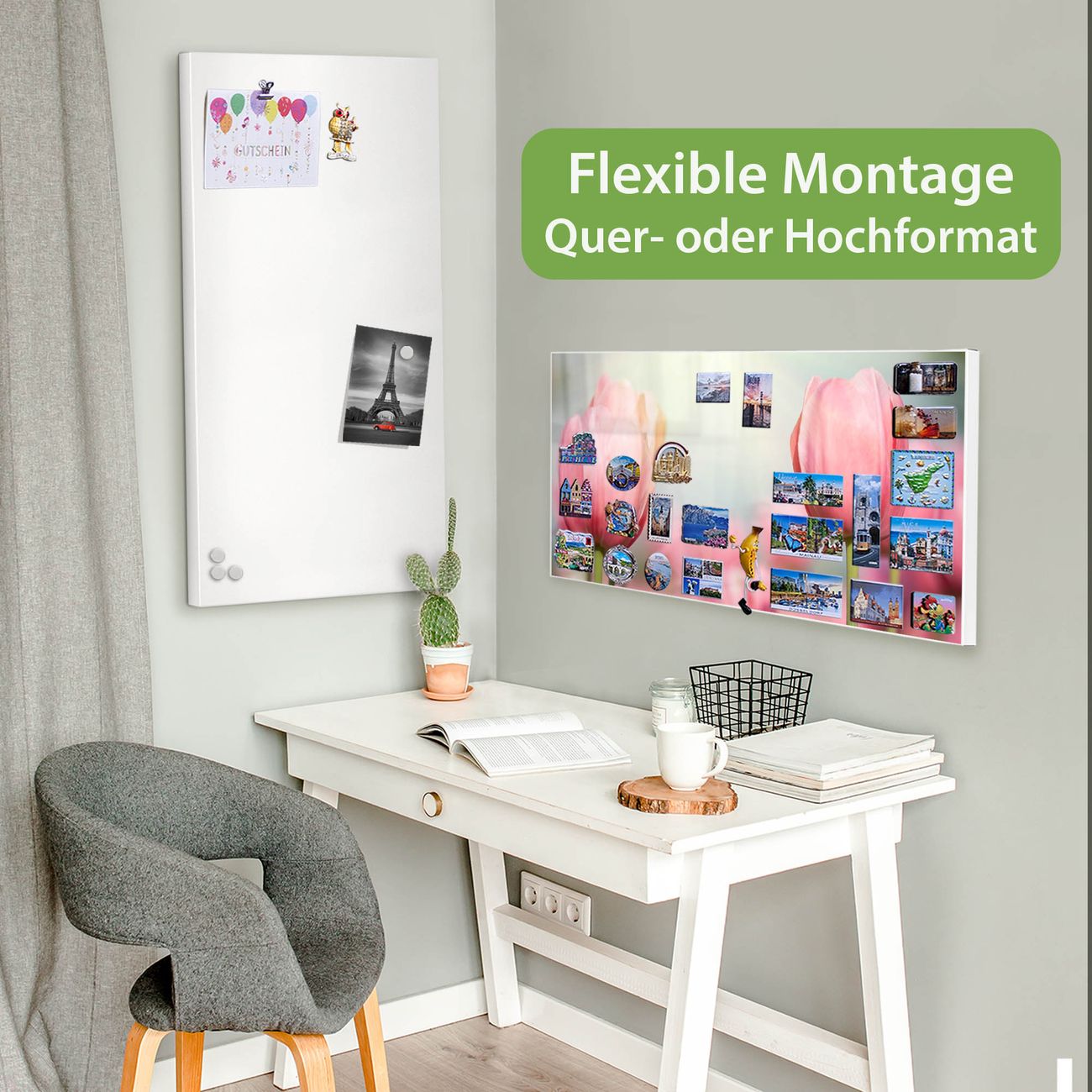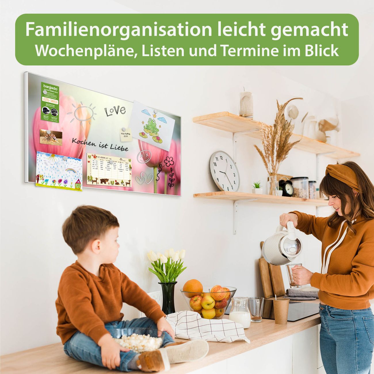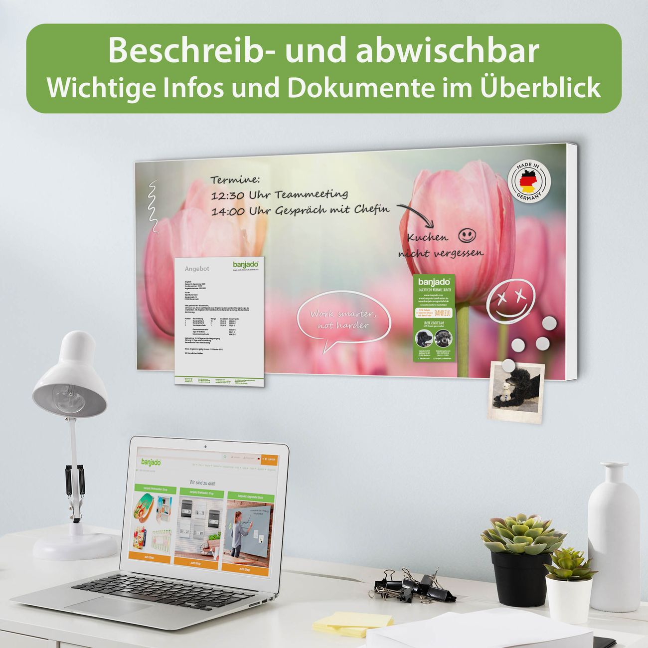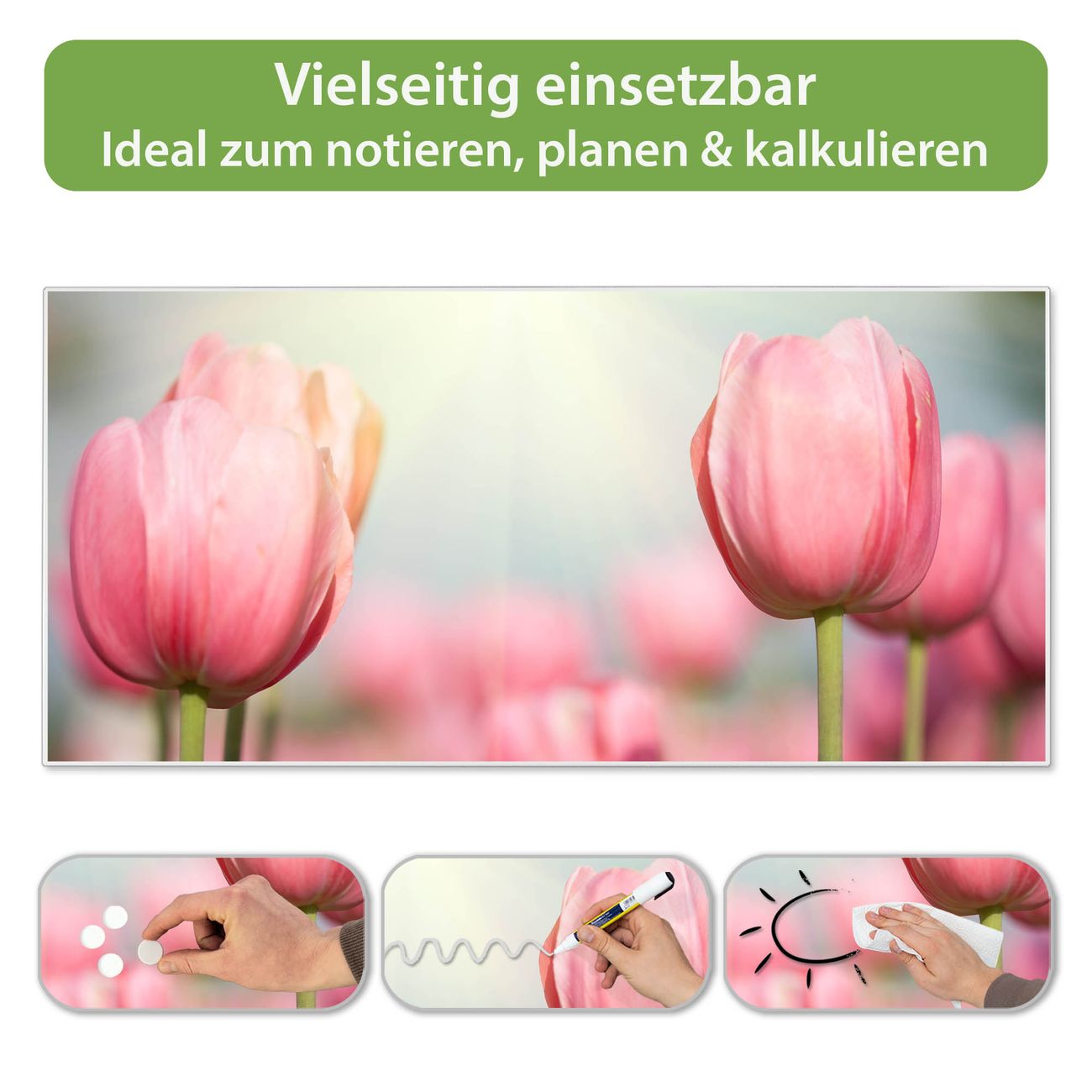 FUNKTION: Die banjado Magnettafel 78x37 cm im Design Motiv Tulpen vereint Funktionalität und modernes Wohndesign auf stilvolle Weise. Diese hochwertige Magnetwand aus Metall hilft Ihnen dabei, Notizen, Fotos, Termine, Einkaufslisten oder Rezepte übersichtlich zu organisieren. Als praktisches Memoboard sorgt sie für Struktur im Alltag und setzt gleichzeitig einen dekorativen Akzent an Ihrer Wand. DESIGN: Die Metalltafel besteht aus robustem, lackiertem Stahl und ist mit allen handelsüblichen Magneten nutzbar. Besonders praktisch ist die beschreibbare Oberfläche. Sie können die Magnettafel ganz einfach mit Kreidestiften beschriften und die Inhalte bei Bedarf mit einem feuchten Tuch wieder entfernen. So eignet sich das Memoboard ideal für Wochenpläne, Menüpläne, To Do Listen oder kreative Botschaften. DETAILS: Mit ihrem großzügigen Querformat von 78x37 cm bietet die Magnettafel ausreichend Platz für Ihre Organisation. Das Motiv Motiv Tulpen bringt eine warme, natürliche Optik in Küche, Flur, Büro oder Homeoffice und wirkt auch ohne Magnete oder Beschriftung wie ein modernes Wandbild. NUTZEN: Auf der Rückseite befinden sich vorgefertigte Löcher für eine schnelle und unkomplizierte Wandmontage. Jede banjado Magnettafel wird in Deutschland gefertigt und steht für Qualität, Langlebigkeit und liebevolle Verarbeitung. Dieses beschreibbare Memoboard ist die perfekte Kombination aus Metalltafel, Designobjekt und praktischer Magnetwand für Ihren Alltag. BANJADO: Wir sind ein kleines Team aus dem Herzen von Sachsen. Wir fertigen alle Artikel von Hand für Sie an, Sie erhalten keine preiswerte Importware. Auf Wunsch können Sie auch Ihr eigenes Foto auf die Magnettafel aufbringen, schreiben Sie uns an. Herzlichst, Ihr banjado-Team