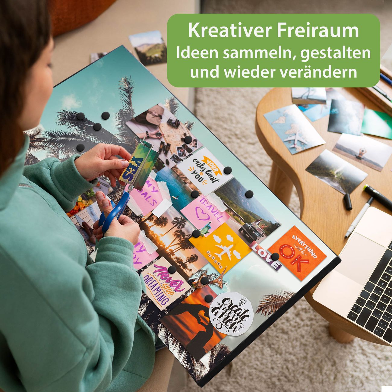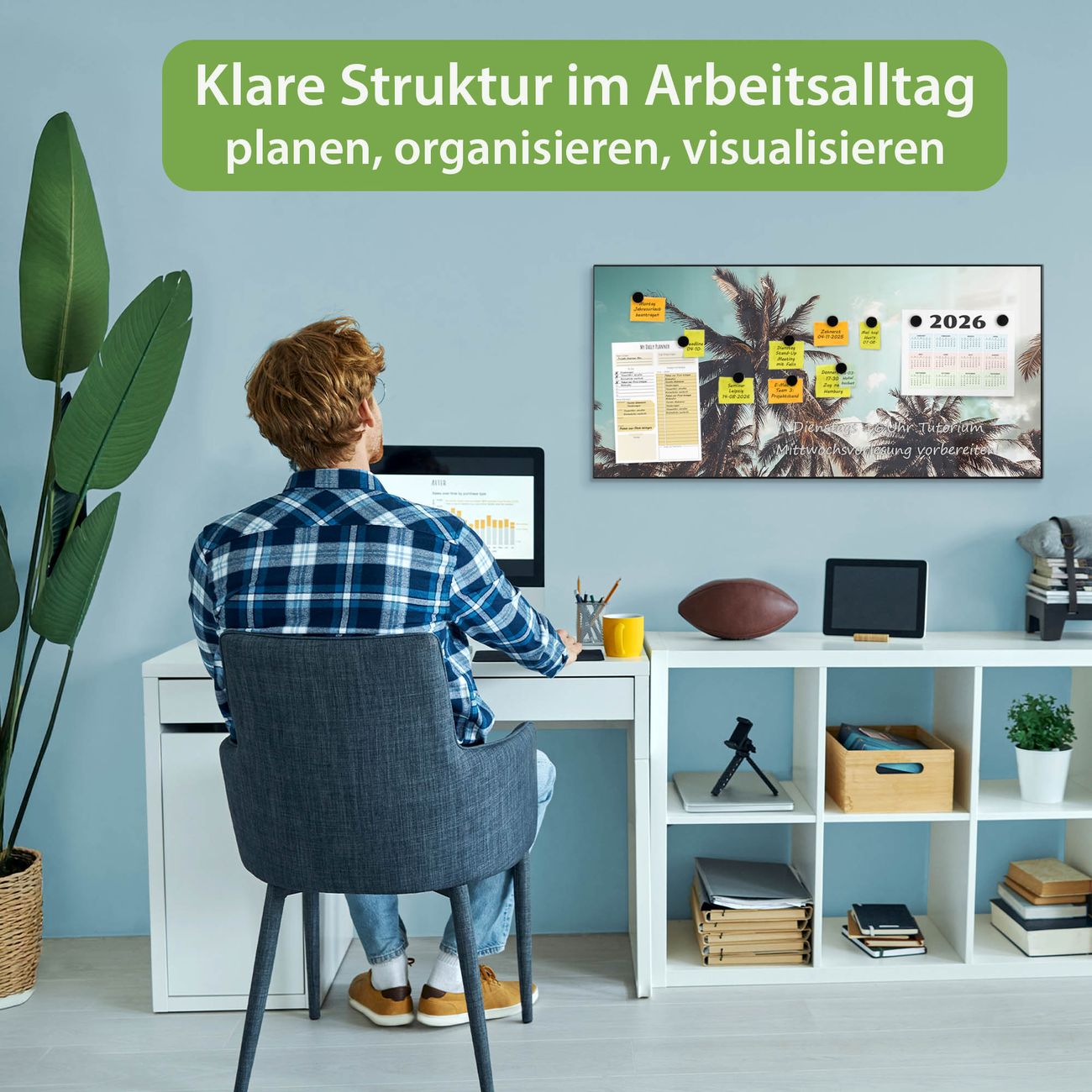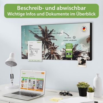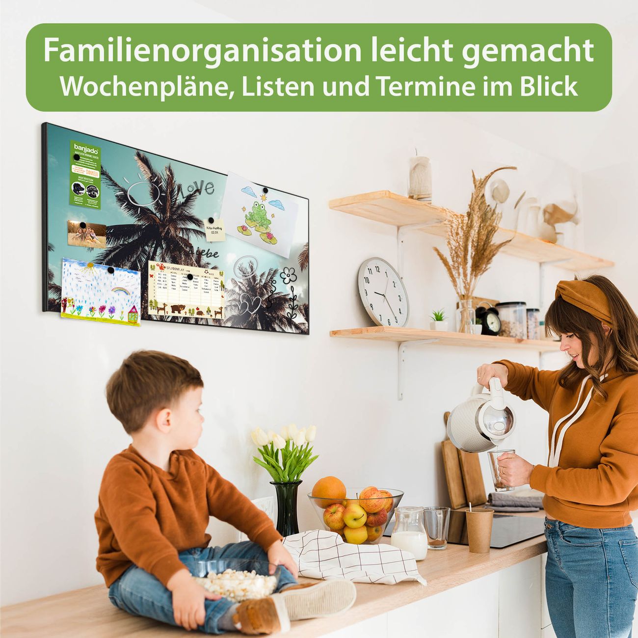 FUNKTION: Die banjado Magnettafel 78x37 cm im Design Motiv Unter Palmen vereint Funktionalität und modernes Wohndesign auf stilvolle Weise. Diese hochwertige Magnetwand aus Metall hilft Ihnen dabei, Notizen, Fotos, Termine, Einkaufslisten oder Rezepte übersichtlich zu organisieren. Als praktisches Memoboard sorgt sie für Struktur im Alltag und setzt gleichzeitig einen dekorativen Akzent an Ihrer Wand. DESIGN: Die Metalltafel besteht aus robustem, lackiertem Stahl und ist mit allen handelsüblichen Magneten nutzbar. Besonders praktisch ist die beschreibbare Oberfläche. Sie können die Magnettafel ganz einfach mit Kreidestiften beschriften und die Inhalte bei Bedarf mit einem feuchten Tuch wieder entfernen. So eignet sich das Memoboard ideal für Wochenpläne, Menüpläne, To Do Listen oder kreative Botschaften. DETAILS: Mit ihrem großzügigen Querformat von 78x37 cm bietet die Magnettafel ausreichend Platz für Ihre Organisation. Das Motiv Motiv Unter Palmen bringt eine warme, natürliche Optik in Küche, Flur, Büro oder Homeoffice und wirkt auch ohne Magnete oder Beschriftung wie ein modernes Wandbild. NUTZEN: Auf der Rückseite befinden sich vorgefertigte Löcher für eine schnelle und unkomplizierte Wandmontage. Jede banjado Magnettafel wird in Deutschland gefertigt und steht für Qualität, Langlebigkeit und liebevolle Verarbeitung. Dieses beschreibbare Memoboard ist die perfekte Kombination aus Metalltafel, Designobjekt und praktischer Magnetwand für Ihren Alltag. BANJADO: Wir sind ein kleines Team aus dem Herzen von Sachsen. Wir fertigen alle Artikel von Hand für Sie an, Sie erhalten keine preiswerte Importware. Auf Wunsch können Sie auch Ihr eigenes Foto auf die Magnettafel aufbringen, schreiben Sie uns an. Herzlichst, Ihr banjado-Team