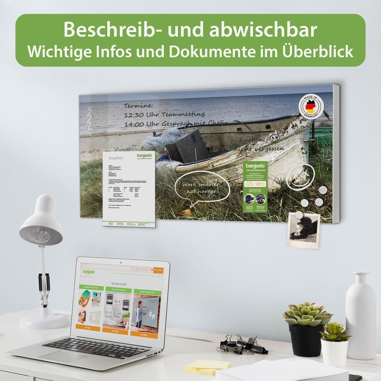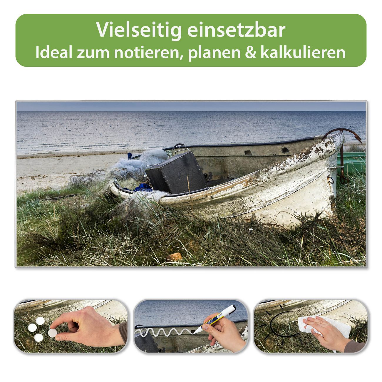 FUNKTION: Die banjado Magnettafel 78x37 cm im Design Motiv Vergessenes Fischerboot vereint Funktionalität und modernes Wohndesign auf stilvolle Weise. Diese hochwertige Magnetwand aus Metall hilft Ihnen dabei, Notizen, Fotos, Termine, Einkaufslisten oder Rezepte übersichtlich zu organisieren. Als praktisches Memoboard sorgt sie für Struktur im Alltag und setzt gleichzeitig einen dekorativen Akzent an Ihrer Wand. DESIGN: Die Metalltafel besteht aus robustem, lackiertem Stahl und ist mit allen handelsüblichen Magneten nutzbar. Besonders praktisch ist die beschreibbare Oberfläche. Sie können die Magnettafel ganz einfach mit Kreidestiften beschriften und die Inhalte bei Bedarf mit einem feuchten Tuch wieder entfernen. So eignet sich das Memoboard ideal für Wochenpläne, Menüpläne, To Do Listen oder kreative Botschaften. DETAILS: Mit ihrem großzügigen Querformat von 78x37 cm bietet die Magnettafel ausreichend Platz für Ihre Organisation. Das Motiv Motiv Vergessenes Fischerboot bringt eine warme, natürliche Optik in Küche, Flur, Büro oder Homeoffice und wirkt auch ohne Magnete oder Beschriftung wie ein modernes Wandbild. NUTZEN: Auf der Rückseite befinden sich vorgefertigte Löcher für eine schnelle und unkomplizierte Wandmontage. Jede banjado Magnettafel wird in Deutschland gefertigt und steht für Qualität, Langlebigkeit und liebevolle Verarbeitung. Dieses beschreibbare Memoboard ist die perfekte Kombination aus Metalltafel, Designobjekt und praktischer Magnetwand für Ihren Alltag. BANJADO: Wir sind ein kleines Team aus dem Herzen von Sachsen. Wir fertigen alle Artikel von Hand für Sie an, Sie erhalten keine preiswerte Importware. Auf Wunsch können Sie auch Ihr eigenes Foto auf die Magnettafel aufbringen, schreiben Sie uns an. Herzlichst, Ihr banjado-Team