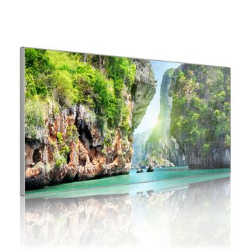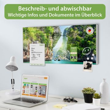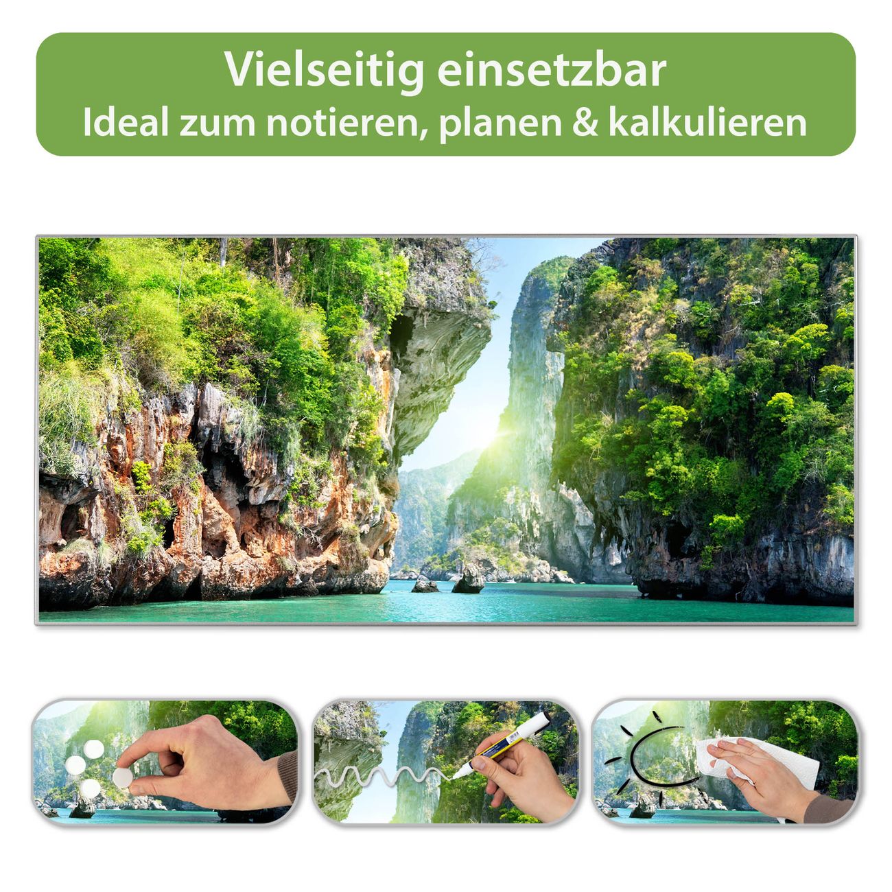 FUNKTION: Die banjado Magnettafel 78x37 cm im Design Motiv Versteckte Bucht vereint Funktionalität und modernes Wohndesign auf stilvolle Weise. Diese hochwertige Magnetwand aus Metall hilft Ihnen dabei, Notizen, Fotos, Termine, Einkaufslisten oder Rezepte übersichtlich zu organisieren. Als praktisches Memoboard sorgt sie für Struktur im Alltag und setzt gleichzeitig einen dekorativen Akzent an Ihrer Wand. DESIGN: Die Metalltafel besteht aus robustem, lackiertem Stahl und ist mit allen handelsüblichen Magneten nutzbar. Besonders praktisch ist die beschreibbare Oberfläche. Sie können die Magnettafel ganz einfach mit Kreidestiften beschriften und die Inhalte bei Bedarf mit einem feuchten Tuch wieder entfernen. So eignet sich das Memoboard ideal für Wochenpläne, Menüpläne, To Do Listen oder kreative Botschaften. DETAILS: Mit ihrem großzügigen Querformat von 78x37 cm bietet die Magnettafel ausreichend Platz für Ihre Organisation. Das Motiv Motiv Versteckte Bucht bringt eine warme, natürliche Optik in Küche, Flur, Büro oder Homeoffice und wirkt auch ohne Magnete oder Beschriftung wie ein modernes Wandbild. NUTZEN: Auf der Rückseite befinden sich vorgefertigte Löcher für eine schnelle und unkomplizierte Wandmontage. Jede banjado Magnettafel wird in Deutschland gefertigt und steht für Qualität, Langlebigkeit und liebevolle Verarbeitung. Dieses beschreibbare Memoboard ist die perfekte Kombination aus Metalltafel, Designobjekt und praktischer Magnetwand für Ihren Alltag. BANJADO: Wir sind ein kleines Team aus dem Herzen von Sachsen. Wir fertigen alle Artikel von Hand für Sie an, Sie erhalten keine preiswerte Importware. Auf Wunsch können Sie auch Ihr eigenes Foto auf die Magnettafel aufbringen, schreiben Sie uns an. Herzlichst, Ihr banjado-Team