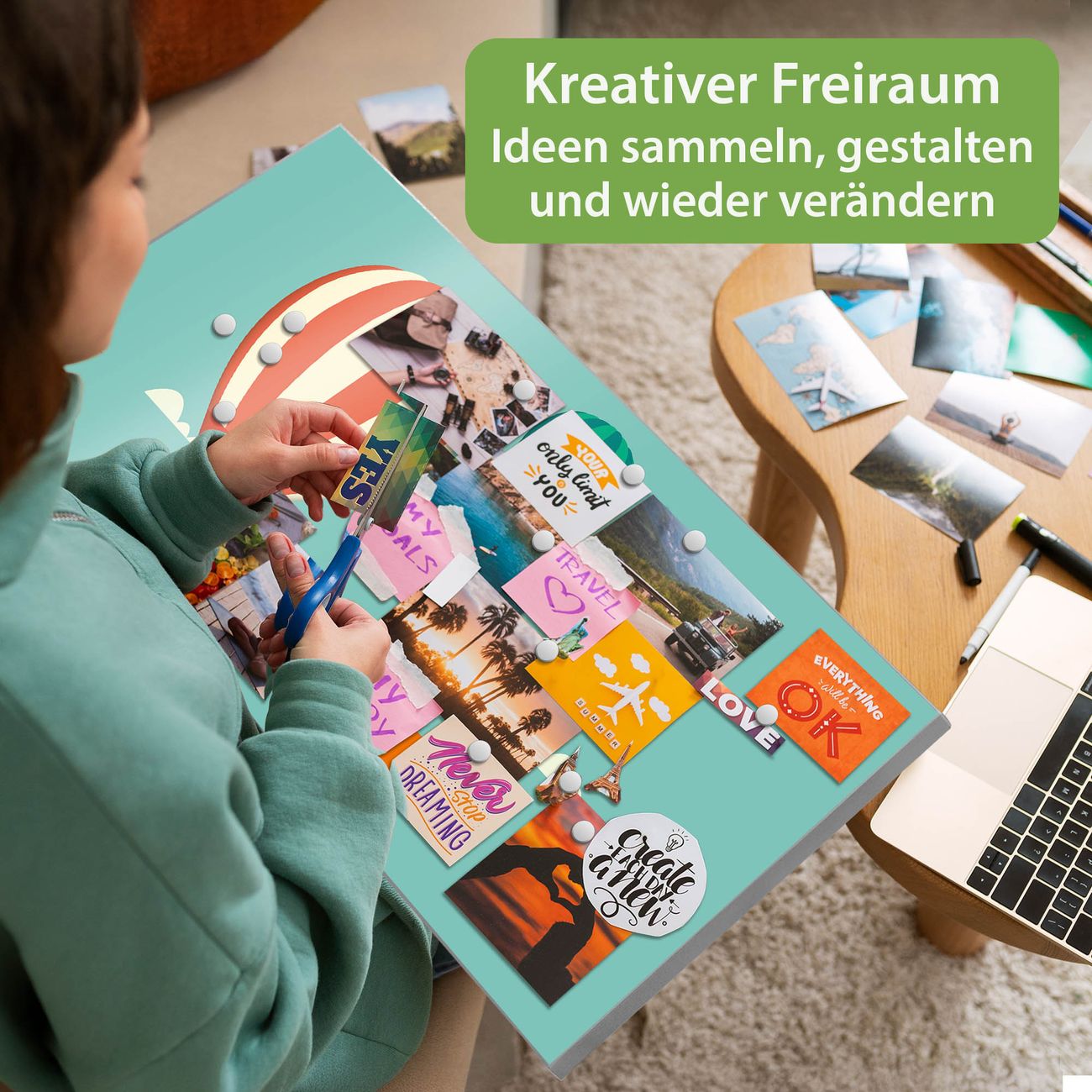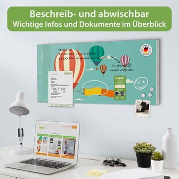 FUNKTION: Die banjado Magnettafel 78x37 cm im Design Motiv Vier Ballons vereint Funktionalität und modernes Wohndesign auf stilvolle Weise. Diese hochwertige Magnetwand aus Metall hilft Ihnen dabei, Notizen, Fotos, Termine, Einkaufslisten oder Rezepte übersichtlich zu organisieren. Als praktisches Memoboard sorgt sie für Struktur im Alltag und setzt gleichzeitig einen dekorativen Akzent an Ihrer Wand. DESIGN: Die Metalltafel besteht aus robustem, lackiertem Stahl und ist mit allen handelsüblichen Magneten nutzbar. Besonders praktisch ist die beschreibbare Oberfläche. Sie können die Magnettafel ganz einfach mit Kreidestiften beschriften und die Inhalte bei Bedarf mit einem feuchten Tuch wieder entfernen. So eignet sich das Memoboard ideal für Wochenpläne, Menüpläne, To Do Listen oder kreative Botschaften. DETAILS: Mit ihrem großzügigen Querformat von 78x37 cm bietet die Magnettafel ausreichend Platz für Ihre Organisation. Das Motiv Motiv Vier Ballons bringt eine warme, natürliche Optik in Küche, Flur, Büro oder Homeoffice und wirkt auch ohne Magnete oder Beschriftung wie ein modernes Wandbild. NUTZEN: Auf der Rückseite befinden sich vorgefertigte Löcher für eine schnelle und unkomplizierte Wandmontage. Jede banjado Magnettafel wird in Deutschland gefertigt und steht für Qualität, Langlebigkeit und liebevolle Verarbeitung. Dieses beschreibbare Memoboard ist die perfekte Kombination aus Metalltafel, Designobjekt und praktischer Magnetwand für Ihren Alltag. BANJADO: Wir sind ein kleines Team aus dem Herzen von Sachsen. Wir fertigen alle Artikel von Hand für Sie an, Sie erhalten keine preiswerte Importware. Auf Wunsch können Sie auch Ihr eigenes Foto auf die Magnettafel aufbringen, schreiben Sie uns an. Herzlichst, Ihr banjado-Team