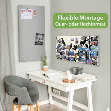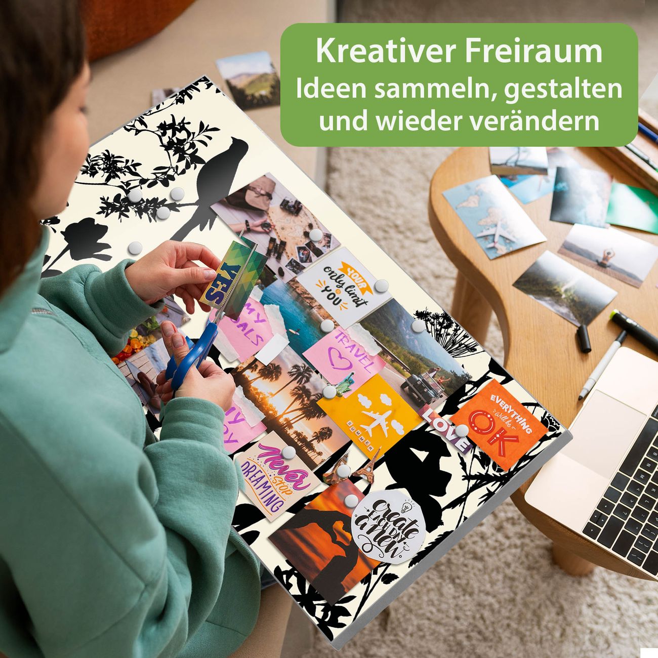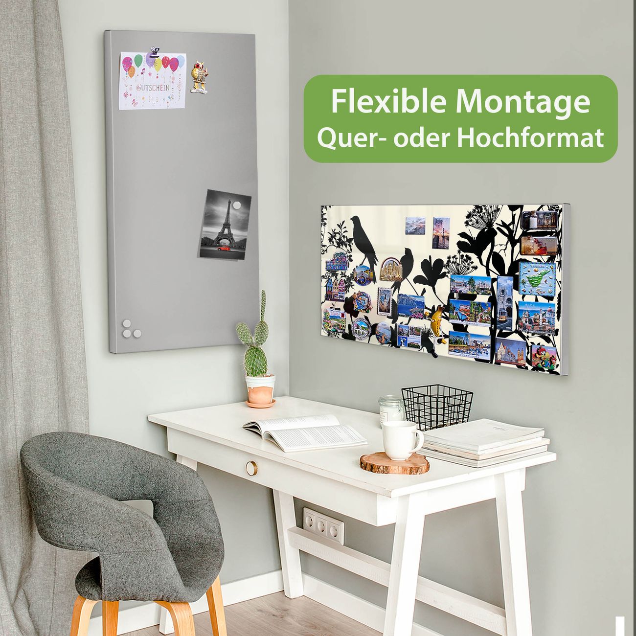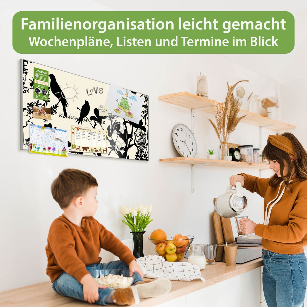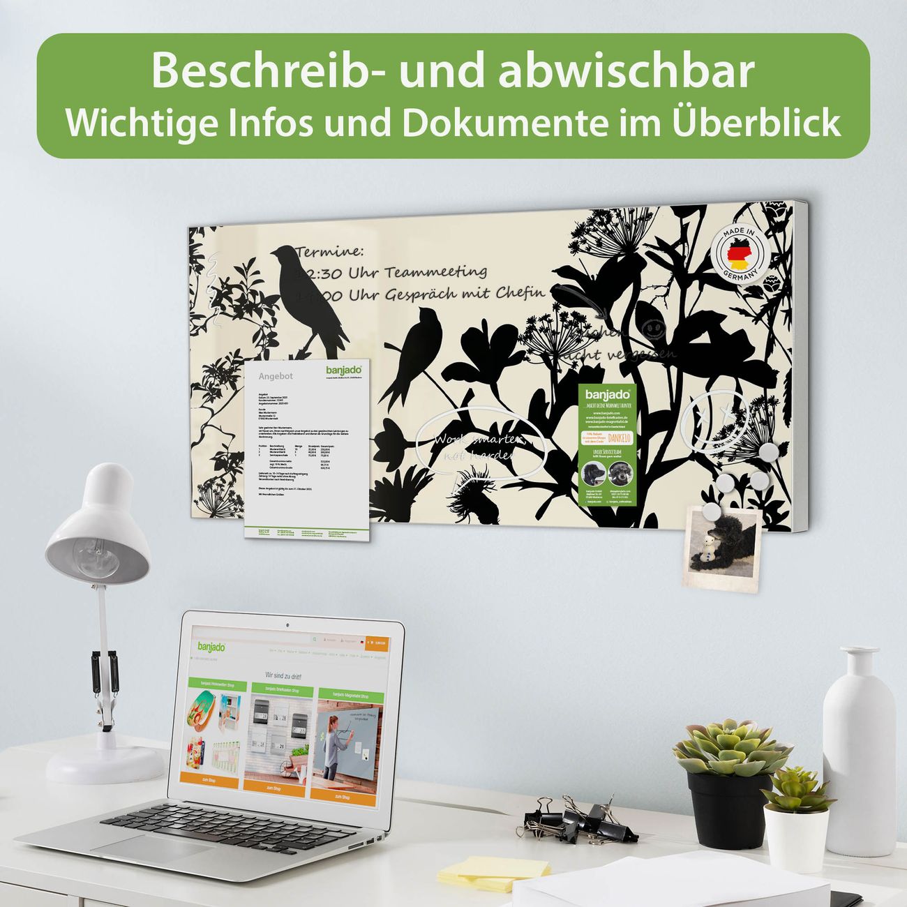FUNKTION: Die banjado Magnettafel 78x37 cm im Design Motiv Vögel Schattenriß vereint Funktionalität und modernes Wohndesign auf stilvolle Weise. Diese hochwertige Magnetwand aus Metall hilft Ihnen dabei, Notizen, Fotos, Termine, Einkaufslisten oder Rezepte übersichtlich zu organisieren. Als praktisches Memoboard sorgt sie für Struktur im Alltag und setzt gleichzeitig einen dekorativen Akzent an Ihrer Wand. DESIGN: Die Metalltafel besteht aus robustem, lackiertem Stahl und ist mit allen handelsüblichen Magneten nutzbar. Besonders praktisch ist die beschreibbare Oberfläche. Sie können die Magnettafel ganz einfach mit Kreidestiften beschriften und die Inhalte bei Bedarf mit einem feuchten Tuch wieder entfernen. So eignet sich das Memoboard ideal für Wochenpläne, Menüpläne, To Do Listen oder kreative Botschaften. DETAILS: Mit ihrem großzügigen Querformat von 78x37 cm bietet die Magnettafel ausreichend Platz für Ihre Organisation. Das Motiv Motiv Vögel Schattenriß bringt eine warme, natürliche Optik in Küche, Flur, Büro oder Homeoffice und wirkt auch ohne Magnete oder Beschriftung wie ein modernes Wandbild. NUTZEN: Auf der Rückseite befinden sich vorgefertigte Löcher für eine schnelle und unkomplizierte Wandmontage. Jede banjado Magnettafel wird in Deutschland gefertigt und steht für Qualität, Langlebigkeit und liebevolle Verarbeitung. Dieses beschreibbare Memoboard ist die perfekte Kombination aus Metalltafel, Designobjekt und praktischer Magnetwand für Ihren Alltag. BANJADO: Wir sind ein kleines Team aus dem Herzen von Sachsen. Wir fertigen alle Artikel von Hand für Sie an, Sie erhalten keine preiswerte Importware. Auf Wunsch können Sie auch Ihr eigenes Foto auf die Magnettafel aufbringen, schreiben Sie uns an. Herzlichst, Ihr banjado-Team