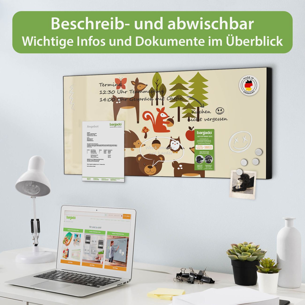FUNKTION: Die banjado Magnettafel 78x37 cm im Design Motiv Waldfreunde vereint Funktionalität und modernes Wohndesign auf stilvolle Weise. Diese hochwertige Magnetwand aus Metall hilft Ihnen dabei, Notizen, Fotos, Termine, Einkaufslisten oder Rezepte übersichtlich zu organisieren. Als praktisches Memoboard sorgt sie für Struktur im Alltag und setzt gleichzeitig einen dekorativen Akzent an Ihrer Wand. DESIGN: Die Metalltafel besteht aus robustem, lackiertem Stahl und ist mit allen handelsüblichen Magneten nutzbar. Besonders praktisch ist die beschreibbare Oberfläche. Sie können die Magnettafel ganz einfach mit Kreidestiften beschriften und die Inhalte bei Bedarf mit einem feuchten Tuch wieder entfernen. So eignet sich das Memoboard ideal für Wochenpläne, Menüpläne, To Do Listen oder kreative Botschaften. DETAILS: Mit ihrem großzügigen Querformat von 78x37 cm bietet die Magnettafel ausreichend Platz für Ihre Organisation. Das Motiv Motiv Waldfreunde bringt eine warme, natürliche Optik in Küche, Flur, Büro oder Homeoffice und wirkt auch ohne Magnete oder Beschriftung wie ein modernes Wandbild. NUTZEN: Auf der Rückseite befinden sich vorgefertigte Löcher für eine schnelle und unkomplizierte Wandmontage. Jede banjado Magnettafel wird in Deutschland gefertigt und steht für Qualität, Langlebigkeit und liebevolle Verarbeitung. Dieses beschreibbare Memoboard ist die perfekte Kombination aus Metalltafel, Designobjekt und praktischer Magnetwand für Ihren Alltag. BANJADO: Wir sind ein kleines Team aus dem Herzen von Sachsen. Wir fertigen alle Artikel von Hand für Sie an, Sie erhalten keine preiswerte Importware. Auf Wunsch können Sie auch Ihr eigenes Foto auf die Magnettafel aufbringen, schreiben Sie uns an. Herzlichst, Ihr banjado-Team