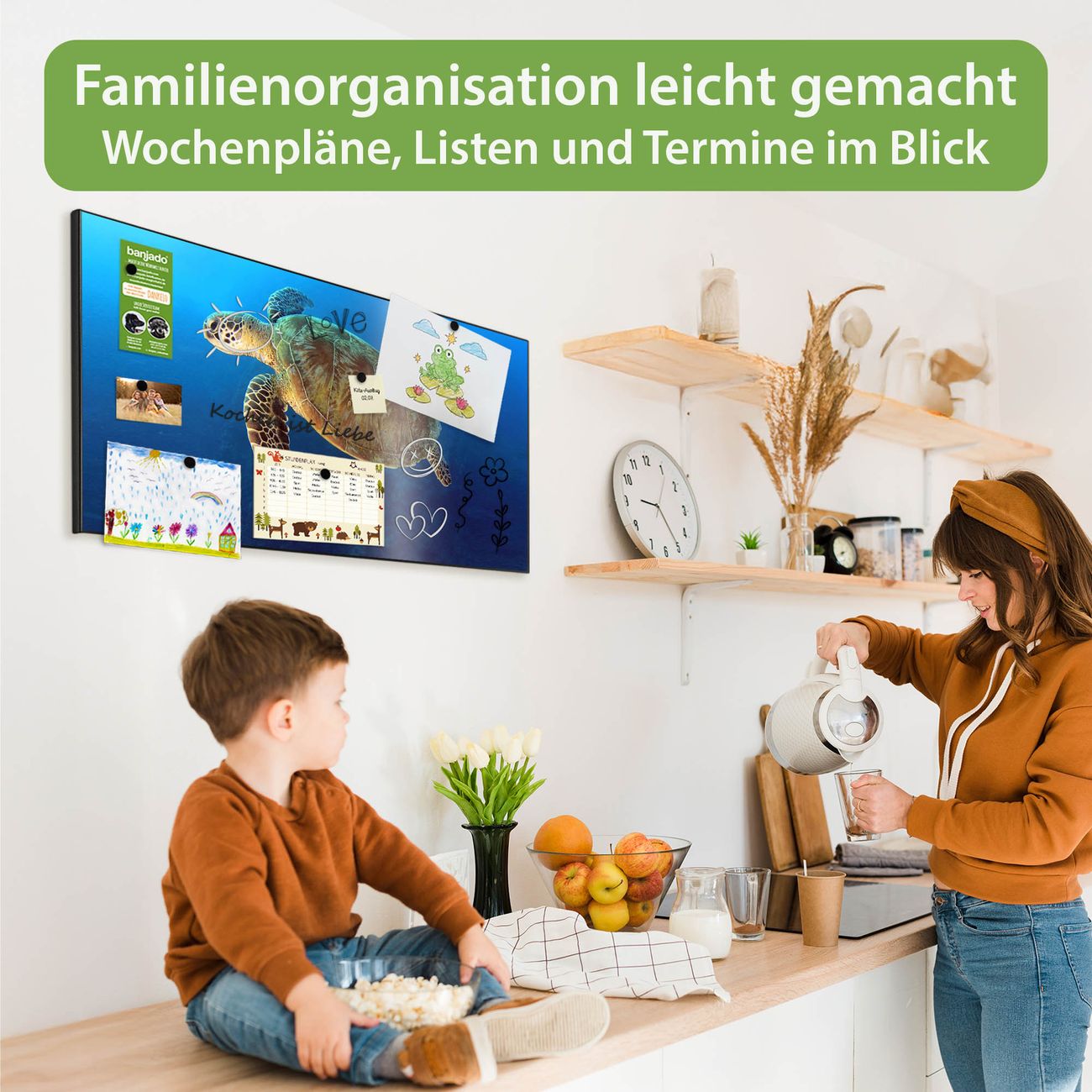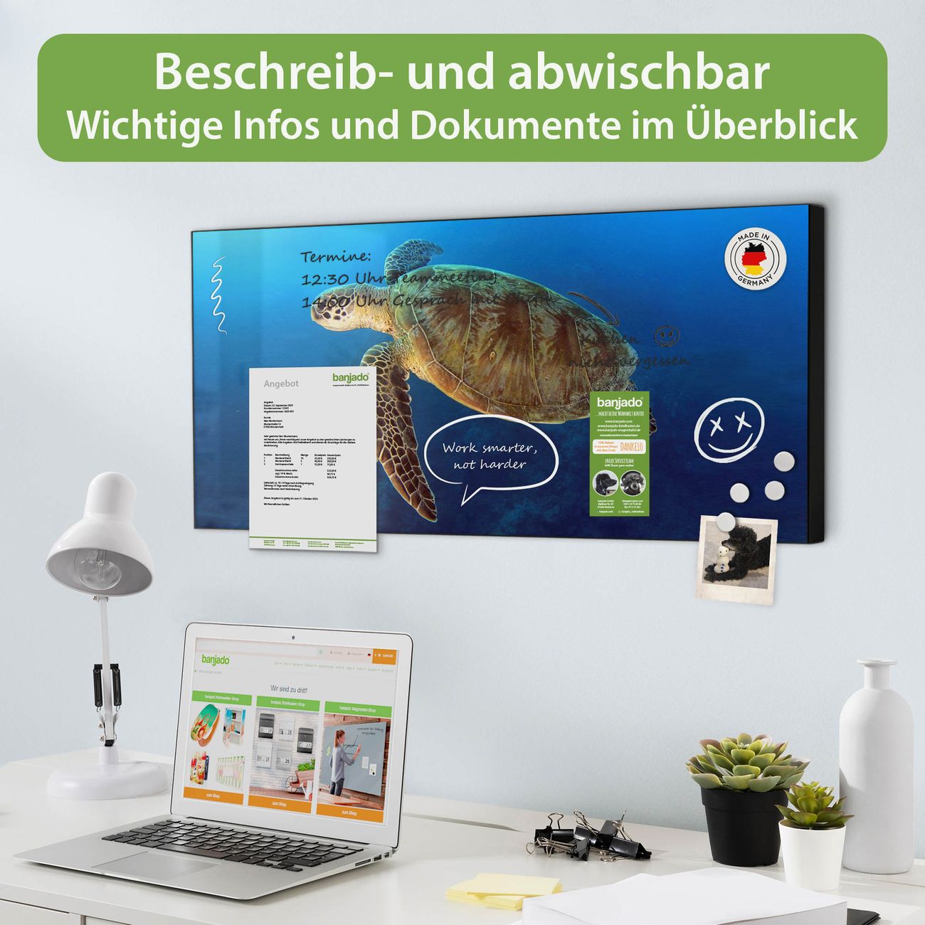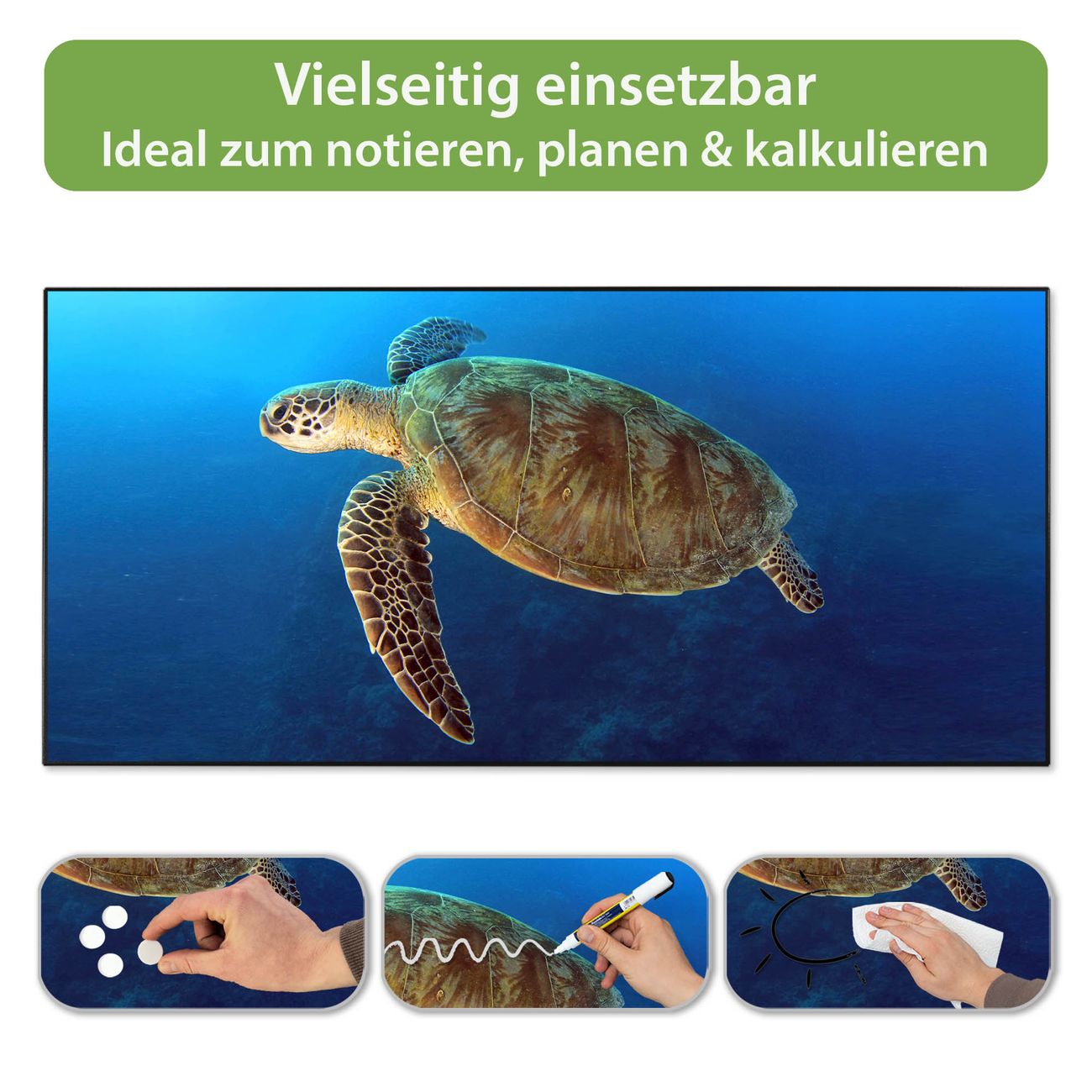 FUNKTION: Die banjado Magnettafel 78x37 cm im Design Motiv Wasserschildkröte vereint Funktionalität und modernes Wohndesign auf stilvolle Weise. Diese hochwertige Magnetwand aus Metall hilft Ihnen dabei, Notizen, Fotos, Termine, Einkaufslisten oder Rezepte übersichtlich zu organisieren. Als praktisches Memoboard sorgt sie für Struktur im Alltag und setzt gleichzeitig einen dekorativen Akzent an Ihrer Wand. DESIGN: Die Metalltafel besteht aus robustem, lackiertem Stahl und ist mit allen handelsüblichen Magneten nutzbar. Besonders praktisch ist die beschreibbare Oberfläche. Sie können die Magnettafel ganz einfach mit Kreidestiften beschriften und die Inhalte bei Bedarf mit einem feuchten Tuch wieder entfernen. So eignet sich das Memoboard ideal für Wochenpläne, Menüpläne, To Do Listen oder kreative Botschaften. DETAILS: Mit ihrem großzügigen Querformat von 78x37 cm bietet die Magnettafel ausreichend Platz für Ihre Organisation. Das Motiv Motiv Wasserschildkröte bringt eine warme, natürliche Optik in Küche, Flur, Büro oder Homeoffice und wirkt auch ohne Magnete oder Beschriftung wie ein modernes Wandbild. NUTZEN: Auf der Rückseite befinden sich vorgefertigte Löcher für eine schnelle und unkomplizierte Wandmontage. Jede banjado Magnettafel wird in Deutschland gefertigt und steht für Qualität, Langlebigkeit und liebevolle Verarbeitung. Dieses beschreibbare Memoboard ist die perfekte Kombination aus Metalltafel, Designobjekt und praktischer Magnetwand für Ihren Alltag. BANJADO: Wir sind ein kleines Team aus dem Herzen von Sachsen. Wir fertigen alle Artikel von Hand für Sie an, Sie erhalten keine preiswerte Importware. Auf Wunsch können Sie auch Ihr eigenes Foto auf die Magnettafel aufbringen, schreiben Sie uns an. Herzlichst, Ihr banjado-Team