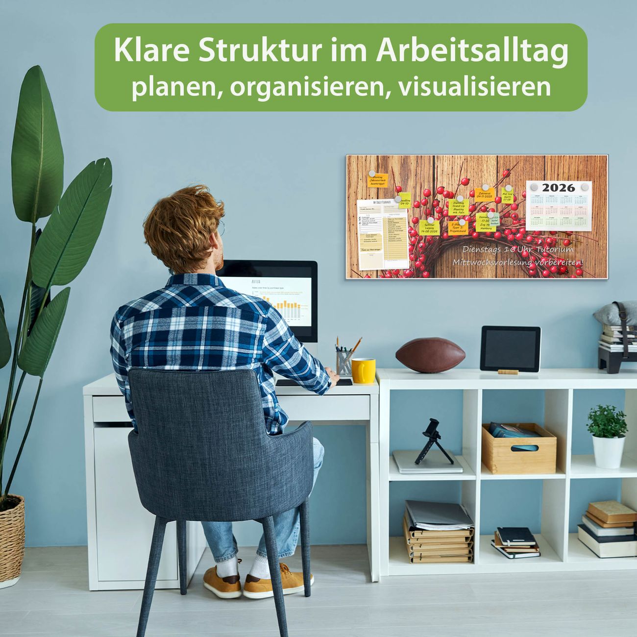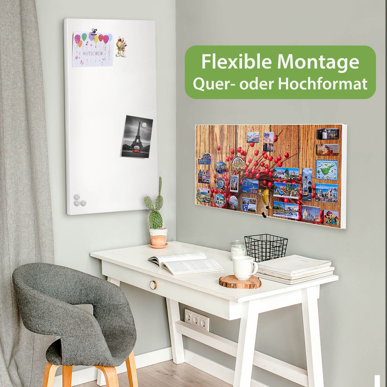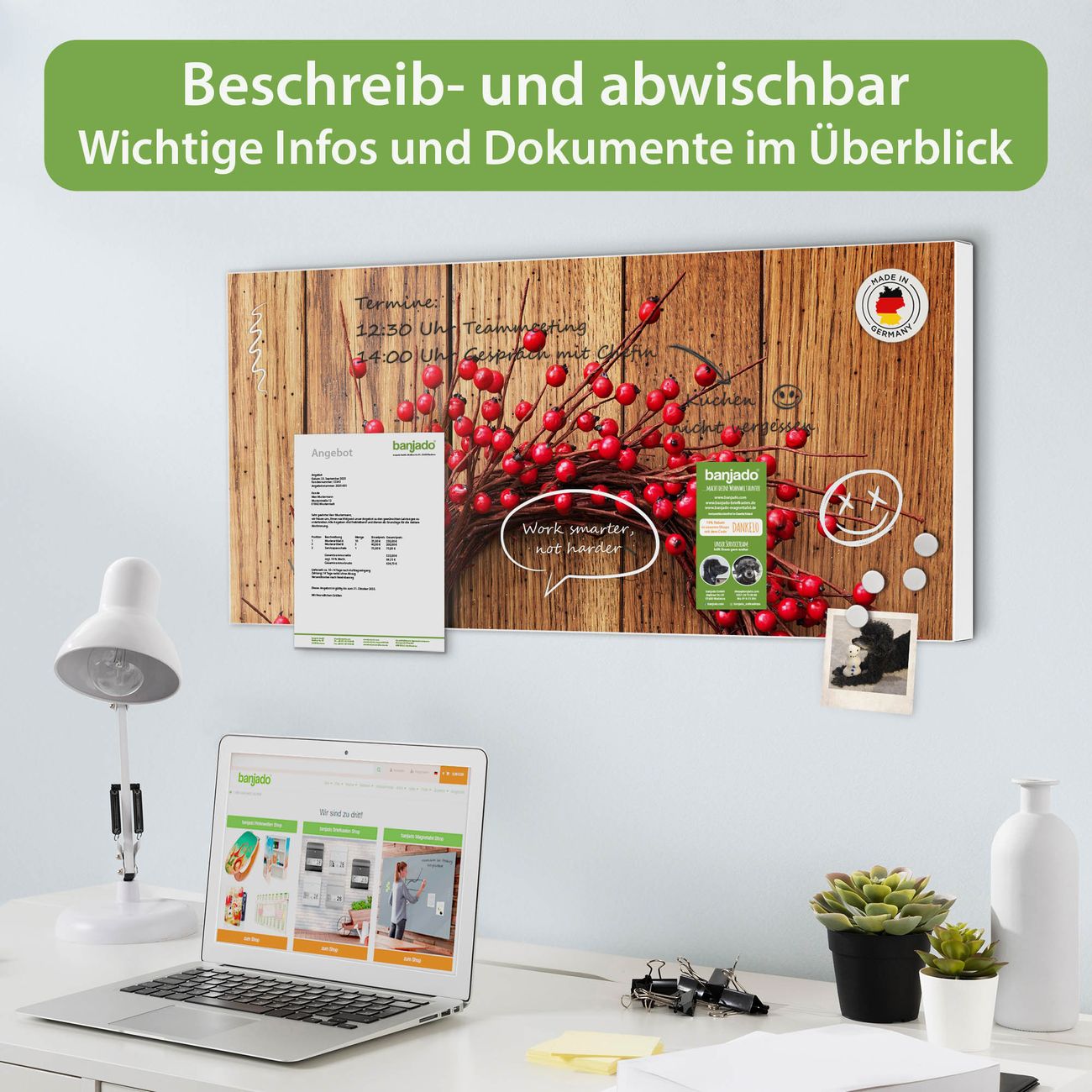 FUNKTION: Die banjado Magnettafel 78x37 cm im Design Motiv Weihnachtskranz vereint Funktionalität und modernes Wohndesign auf stilvolle Weise. Diese hochwertige Magnetwand aus Metall hilft Ihnen dabei, Notizen, Fotos, Termine, Einkaufslisten oder Rezepte übersichtlich zu organisieren. Als praktisches Memoboard sorgt sie für Struktur im Alltag und setzt gleichzeitig einen dekorativen Akzent an Ihrer Wand. DESIGN: Die Metalltafel besteht aus robustem, lackiertem Stahl und ist mit allen handelsüblichen Magneten nutzbar. Besonders praktisch ist die beschreibbare Oberfläche. Sie können die Magnettafel ganz einfach mit Kreidestiften beschriften und die Inhalte bei Bedarf mit einem feuchten Tuch wieder entfernen. So eignet sich das Memoboard ideal für Wochenpläne, Menüpläne, To Do Listen oder kreative Botschaften. DETAILS: Mit ihrem großzügigen Querformat von 78x37 cm bietet die Magnettafel ausreichend Platz für Ihre Organisation. Das Motiv Motiv Weihnachtskranz bringt eine warme, natürliche Optik in Küche, Flur, Büro oder Homeoffice und wirkt auch ohne Magnete oder Beschriftung wie ein modernes Wandbild. NUTZEN: Auf der Rückseite befinden sich vorgefertigte Löcher für eine schnelle und unkomplizierte Wandmontage. Jede banjado Magnettafel wird in Deutschland gefertigt und steht für Qualität, Langlebigkeit und liebevolle Verarbeitung. Dieses beschreibbare Memoboard ist die perfekte Kombination aus Metalltafel, Designobjekt und praktischer Magnetwand für Ihren Alltag. BANJADO: Wir sind ein kleines Team aus dem Herzen von Sachsen. Wir fertigen alle Artikel von Hand für Sie an, Sie erhalten keine preiswerte Importware. Auf Wunsch können Sie auch Ihr eigenes Foto auf die Magnettafel aufbringen, schreiben Sie uns an. Herzlichst, Ihr banjado-Team