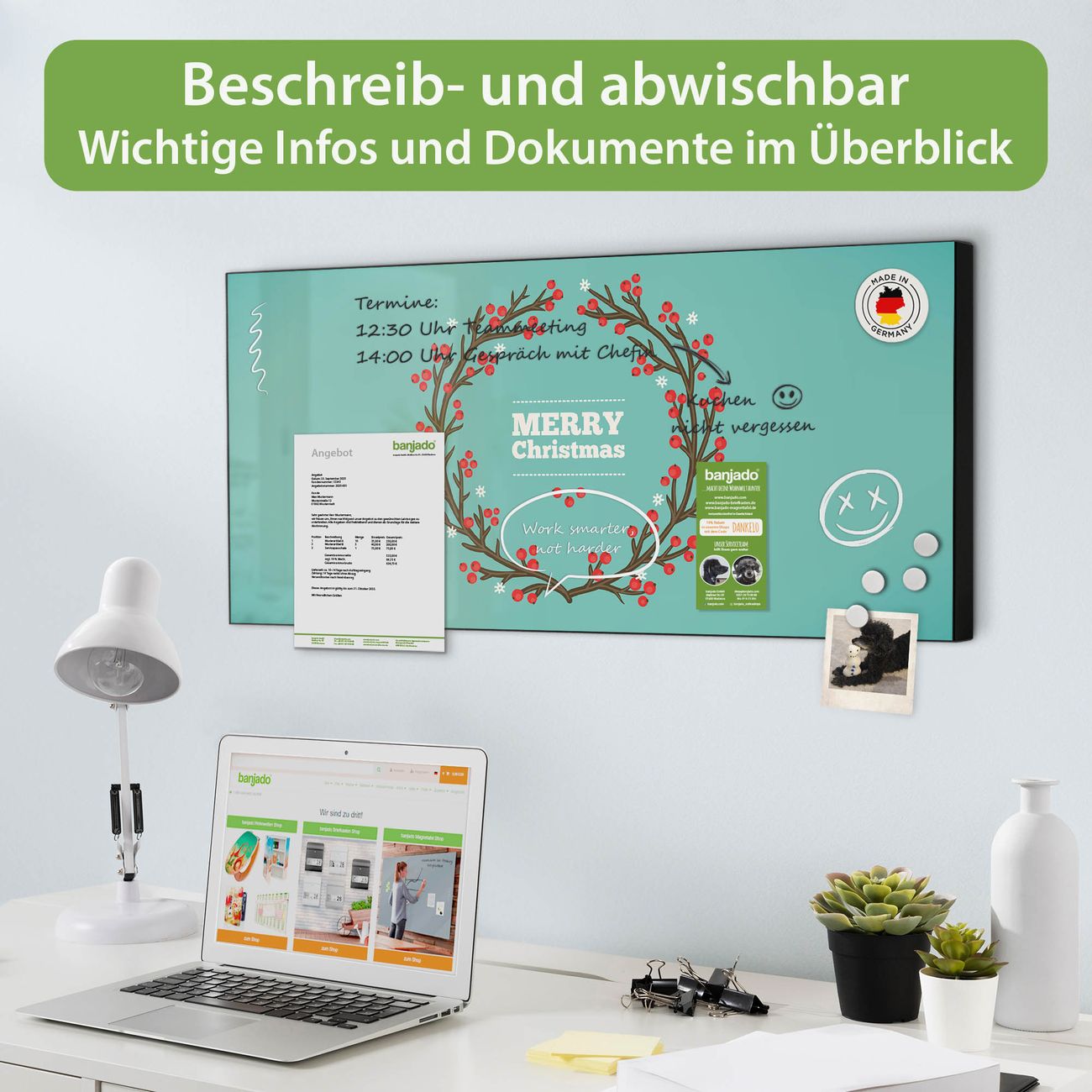 FUNKTION: Die banjado Magnettafel 78x37 cm im Design Motiv Weihnachtsranke vereint Funktionalität und modernes Wohndesign auf stilvolle Weise. Diese hochwertige Magnetwand aus Metall hilft Ihnen dabei, Notizen, Fotos, Termine, Einkaufslisten oder Rezepte übersichtlich zu organisieren. Als praktisches Memoboard sorgt sie für Struktur im Alltag und setzt gleichzeitig einen dekorativen Akzent an Ihrer Wand. DESIGN: Die Metalltafel besteht aus robustem, lackiertem Stahl und ist mit allen handelsüblichen Magneten nutzbar. Besonders praktisch ist die beschreibbare Oberfläche. Sie können die Magnettafel ganz einfach mit Kreidestiften beschriften und die Inhalte bei Bedarf mit einem feuchten Tuch wieder entfernen. So eignet sich das Memoboard ideal für Wochenpläne, Menüpläne, To Do Listen oder kreative Botschaften. DETAILS: Mit ihrem großzügigen Querformat von 78x37 cm bietet die Magnettafel ausreichend Platz für Ihre Organisation. Das Motiv Motiv Weihnachtsranke bringt eine warme, natürliche Optik in Küche, Flur, Büro oder Homeoffice und wirkt auch ohne Magnete oder Beschriftung wie ein modernes Wandbild. NUTZEN: Auf der Rückseite befinden sich vorgefertigte Löcher für eine schnelle und unkomplizierte Wandmontage. Jede banjado Magnettafel wird in Deutschland gefertigt und steht für Qualität, Langlebigkeit und liebevolle Verarbeitung. Dieses beschreibbare Memoboard ist die perfekte Kombination aus Metalltafel, Designobjekt und praktischer Magnetwand für Ihren Alltag. BANJADO: Wir sind ein kleines Team aus dem Herzen von Sachsen. Wir fertigen alle Artikel von Hand für Sie an, Sie erhalten keine preiswerte Importware. Auf Wunsch können Sie auch Ihr eigenes Foto auf die Magnettafel aufbringen, schreiben Sie uns an. Herzlichst, Ihr banjado-Team