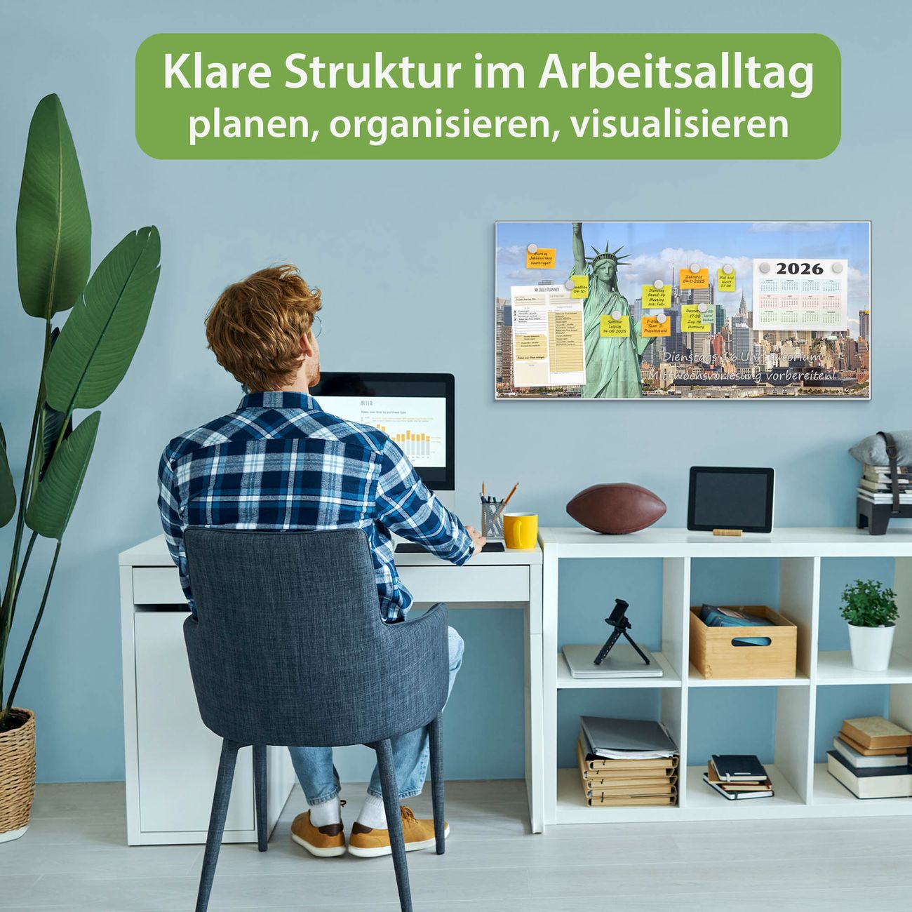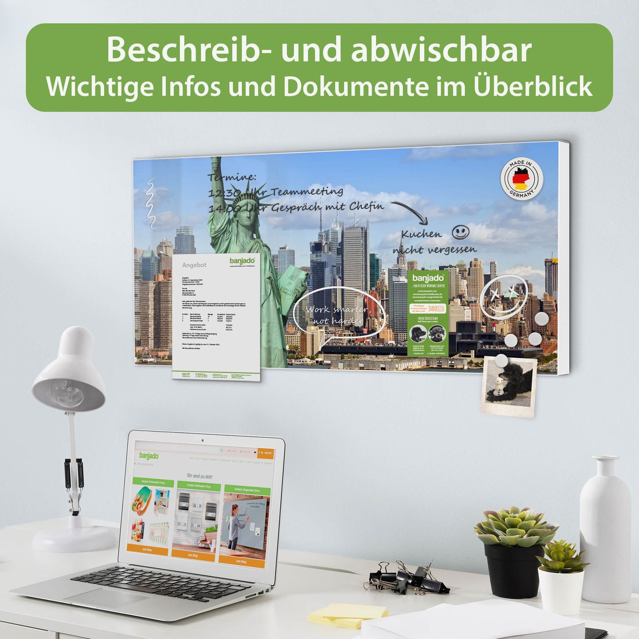 FUNKTION: Die banjado Magnettafel 78x37 cm im Design Motiv Welcome To NY vereint Funktionalität und modernes Wohndesign auf stilvolle Weise. Diese hochwertige Magnetwand aus Metall hilft Ihnen dabei, Notizen, Fotos, Termine, Einkaufslisten oder Rezepte übersichtlich zu organisieren. Als praktisches Memoboard sorgt sie für Struktur im Alltag und setzt gleichzeitig einen dekorativen Akzent an Ihrer Wand. DESIGN: Die Metalltafel besteht aus robustem, lackiertem Stahl und ist mit allen handelsüblichen Magneten nutzbar. Besonders praktisch ist die beschreibbare Oberfläche. Sie können die Magnettafel ganz einfach mit Kreidestiften beschriften und die Inhalte bei Bedarf mit einem feuchten Tuch wieder entfernen. So eignet sich das Memoboard ideal für Wochenpläne, Menüpläne, To Do Listen oder kreative Botschaften. DETAILS: Mit ihrem großzügigen Querformat von 78x37 cm bietet die Magnettafel ausreichend Platz für Ihre Organisation. Das Motiv Motiv Welcome To NY bringt eine warme, natürliche Optik in Küche, Flur, Büro oder Homeoffice und wirkt auch ohne Magnete oder Beschriftung wie ein modernes Wandbild. NUTZEN: Auf der Rückseite befinden sich vorgefertigte Löcher für eine schnelle und unkomplizierte Wandmontage. Jede banjado Magnettafel wird in Deutschland gefertigt und steht für Qualität, Langlebigkeit und liebevolle Verarbeitung. Dieses beschreibbare Memoboard ist die perfekte Kombination aus Metalltafel, Designobjekt und praktischer Magnetwand für Ihren Alltag. BANJADO: Wir sind ein kleines Team aus dem Herzen von Sachsen. Wir fertigen alle Artikel von Hand für Sie an, Sie erhalten keine preiswerte Importware. Auf Wunsch können Sie auch Ihr eigenes Foto auf die Magnettafel aufbringen, schreiben Sie uns an. Herzlichst, Ihr banjado-Team