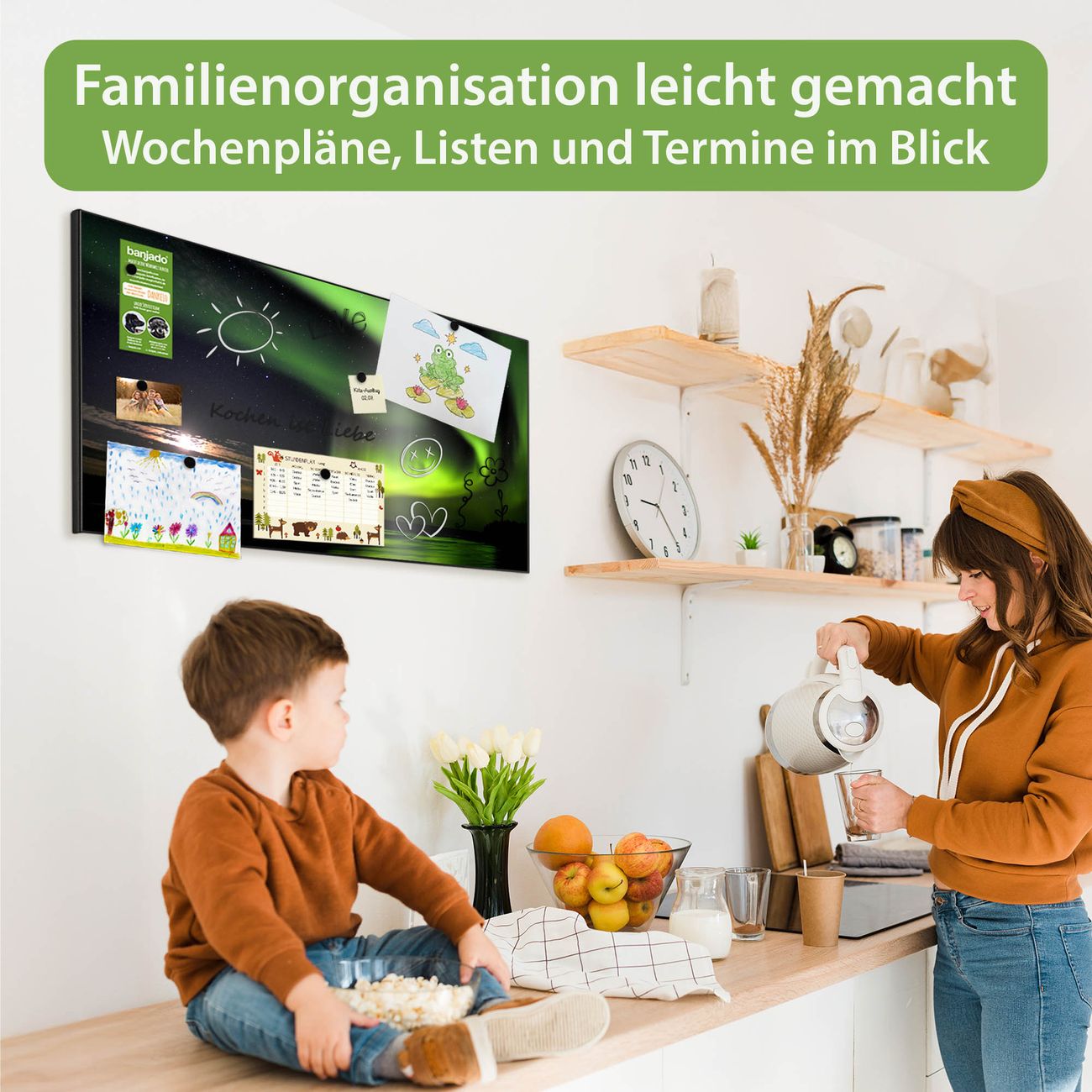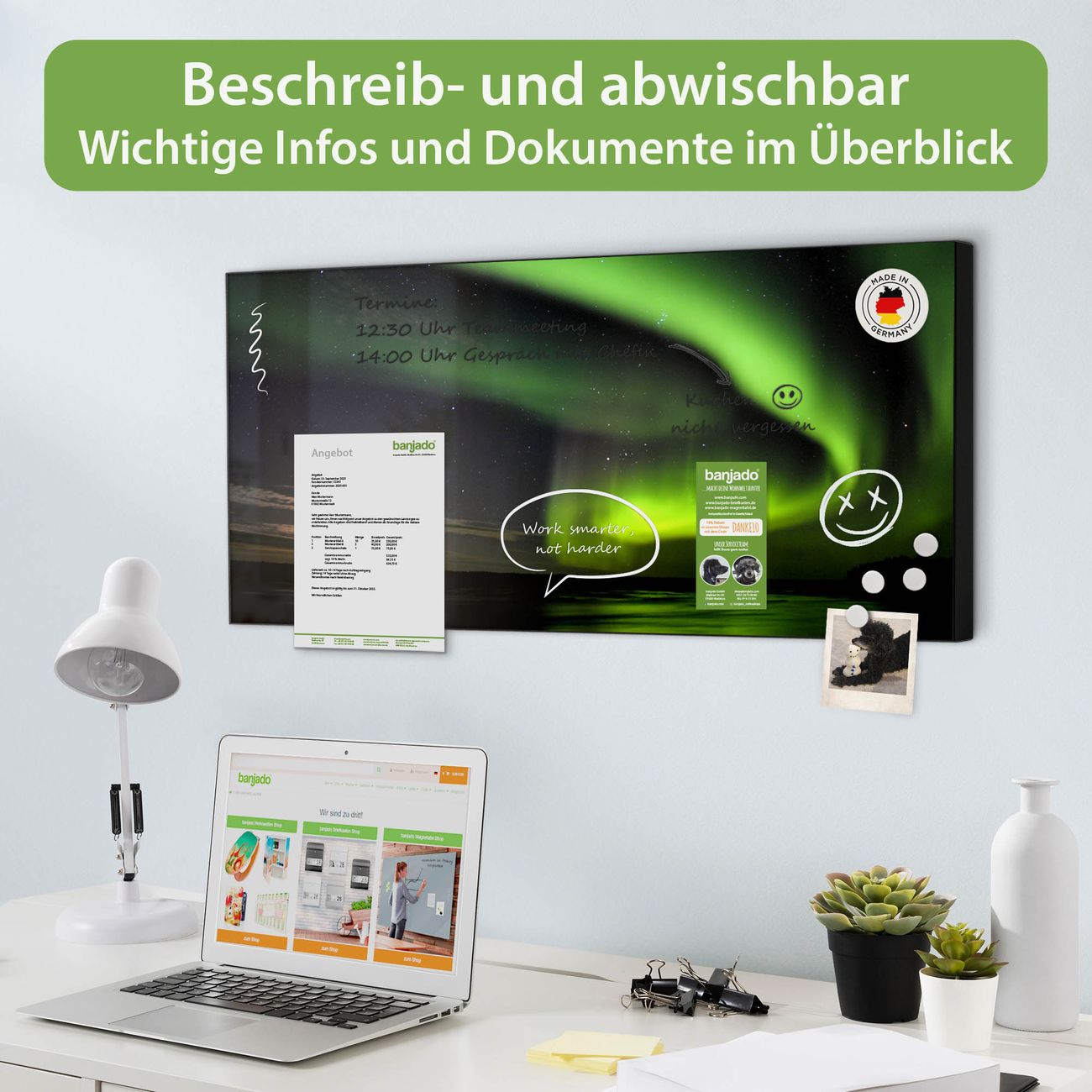 FUNKTION: Die banjado Magnettafel 78x37 cm im Design Motiv Wetterleuchten vereint Funktionalität und modernes Wohndesign auf stilvolle Weise. Diese hochwertige Magnetwand aus Metall hilft Ihnen dabei, Notizen, Fotos, Termine, Einkaufslisten oder Rezepte übersichtlich zu organisieren. Als praktisches Memoboard sorgt sie für Struktur im Alltag und setzt gleichzeitig einen dekorativen Akzent an Ihrer Wand. DESIGN: Die Metalltafel besteht aus robustem, lackiertem Stahl und ist mit allen handelsüblichen Magneten nutzbar. Besonders praktisch ist die beschreibbare Oberfläche. Sie können die Magnettafel ganz einfach mit Kreidestiften beschriften und die Inhalte bei Bedarf mit einem feuchten Tuch wieder entfernen. So eignet sich das Memoboard ideal für Wochenpläne, Menüpläne, To Do Listen oder kreative Botschaften. DETAILS: Mit ihrem großzügigen Querformat von 78x37 cm bietet die Magnettafel ausreichend Platz für Ihre Organisation. Das Motiv Motiv Wetterleuchten bringt eine warme, natürliche Optik in Küche, Flur, Büro oder Homeoffice und wirkt auch ohne Magnete oder Beschriftung wie ein modernes Wandbild. NUTZEN: Auf der Rückseite befinden sich vorgefertigte Löcher für eine schnelle und unkomplizierte Wandmontage. Jede banjado Magnettafel wird in Deutschland gefertigt und steht für Qualität, Langlebigkeit und liebevolle Verarbeitung. Dieses beschreibbare Memoboard ist die perfekte Kombination aus Metalltafel, Designobjekt und praktischer Magnetwand für Ihren Alltag. BANJADO: Wir sind ein kleines Team aus dem Herzen von Sachsen. Wir fertigen alle Artikel von Hand für Sie an, Sie erhalten keine preiswerte Importware. Auf Wunsch können Sie auch Ihr eigenes Foto auf die Magnettafel aufbringen, schreiben Sie uns an. Herzlichst, Ihr banjado-Team