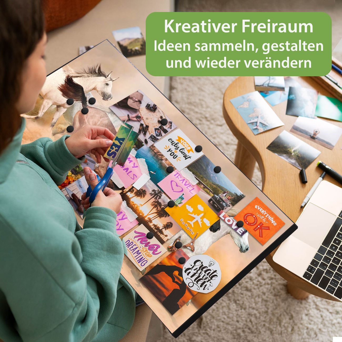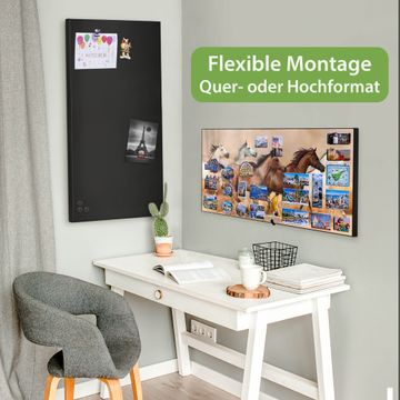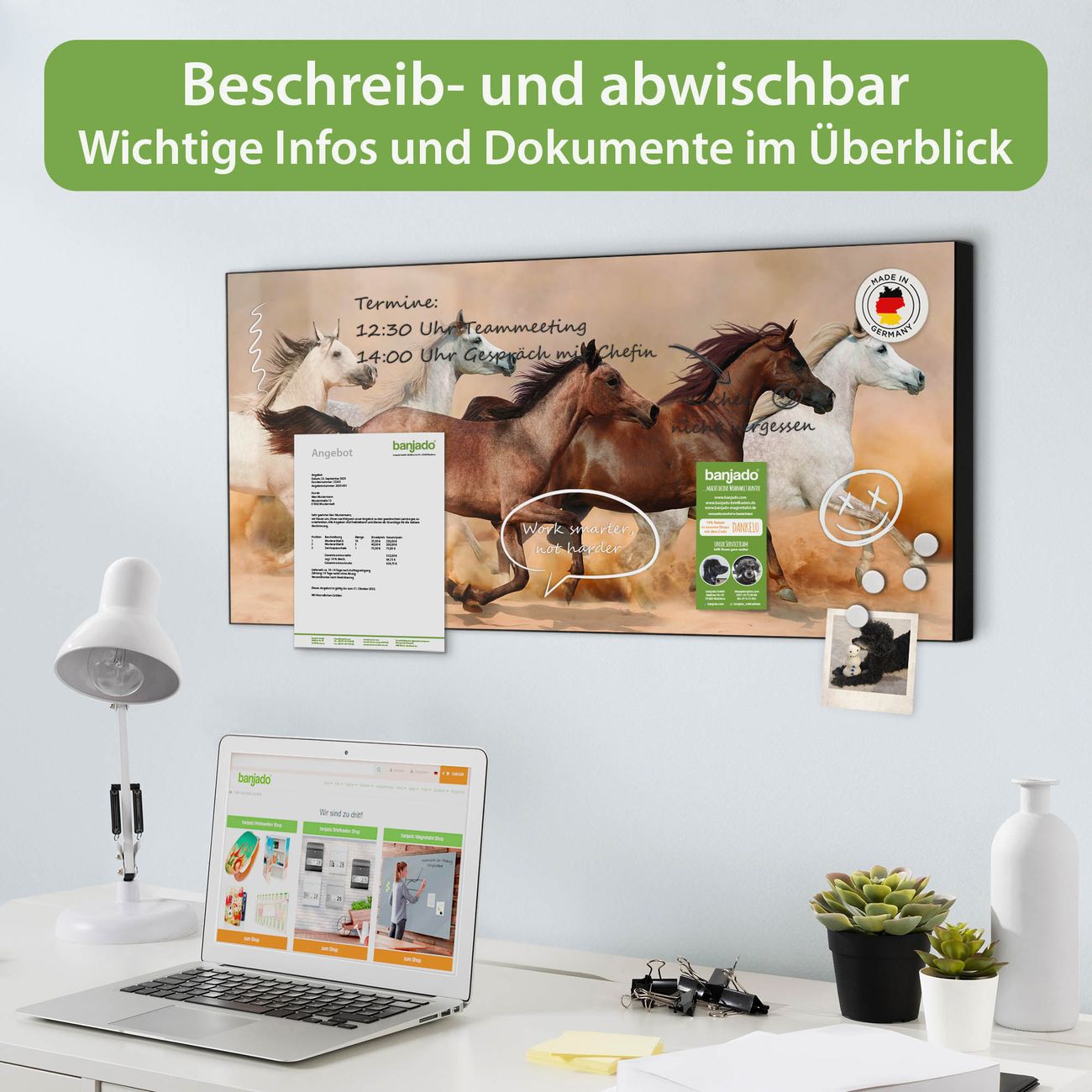 FUNKTION: Die banjado Magnettafel 78x37 cm im Design Motiv Wilde Pferde vereint Funktionalität und modernes Wohndesign auf stilvolle Weise. Diese hochwertige Magnetwand aus Metall hilft Ihnen dabei, Notizen, Fotos, Termine, Einkaufslisten oder Rezepte übersichtlich zu organisieren. Als praktisches Memoboard sorgt sie für Struktur im Alltag und setzt gleichzeitig einen dekorativen Akzent an Ihrer Wand. DESIGN: Die Metalltafel besteht aus robustem, lackiertem Stahl und ist mit allen handelsüblichen Magneten nutzbar. Besonders praktisch ist die beschreibbare Oberfläche. Sie können die Magnettafel ganz einfach mit Kreidestiften beschriften und die Inhalte bei Bedarf mit einem feuchten Tuch wieder entfernen. So eignet sich das Memoboard ideal für Wochenpläne, Menüpläne, To Do Listen oder kreative Botschaften. DETAILS: Mit ihrem großzügigen Querformat von 78x37 cm bietet die Magnettafel ausreichend Platz für Ihre Organisation. Das Motiv Motiv Wilde Pferde bringt eine warme, natürliche Optik in Küche, Flur, Büro oder Homeoffice und wirkt auch ohne Magnete oder Beschriftung wie ein modernes Wandbild. NUTZEN: Auf der Rückseite befinden sich vorgefertigte Löcher für eine schnelle und unkomplizierte Wandmontage. Jede banjado Magnettafel wird in Deutschland gefertigt und steht für Qualität, Langlebigkeit und liebevolle Verarbeitung. Dieses beschreibbare Memoboard ist die perfekte Kombination aus Metalltafel, Designobjekt und praktischer Magnetwand für Ihren Alltag. BANJADO: Wir sind ein kleines Team aus dem Herzen von Sachsen. Wir fertigen alle Artikel von Hand für Sie an, Sie erhalten keine preiswerte Importware. Auf Wunsch können Sie auch Ihr eigenes Foto auf die Magnettafel aufbringen, schreiben Sie uns an. Herzlichst, Ihr banjado-Team