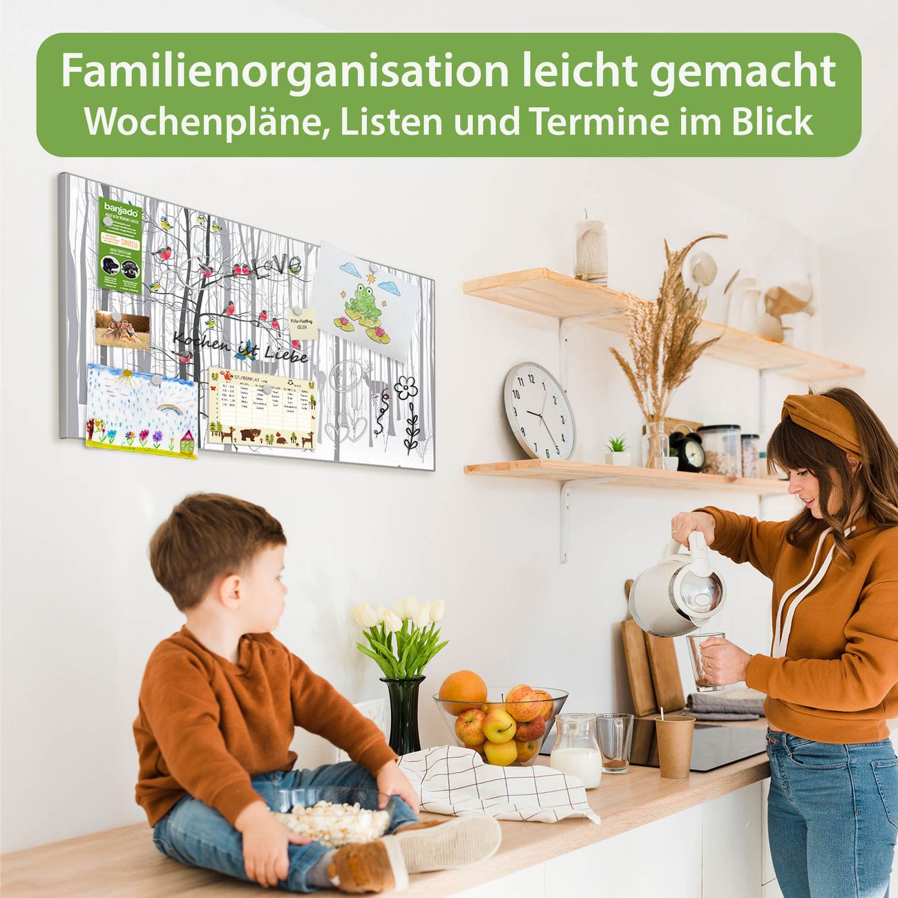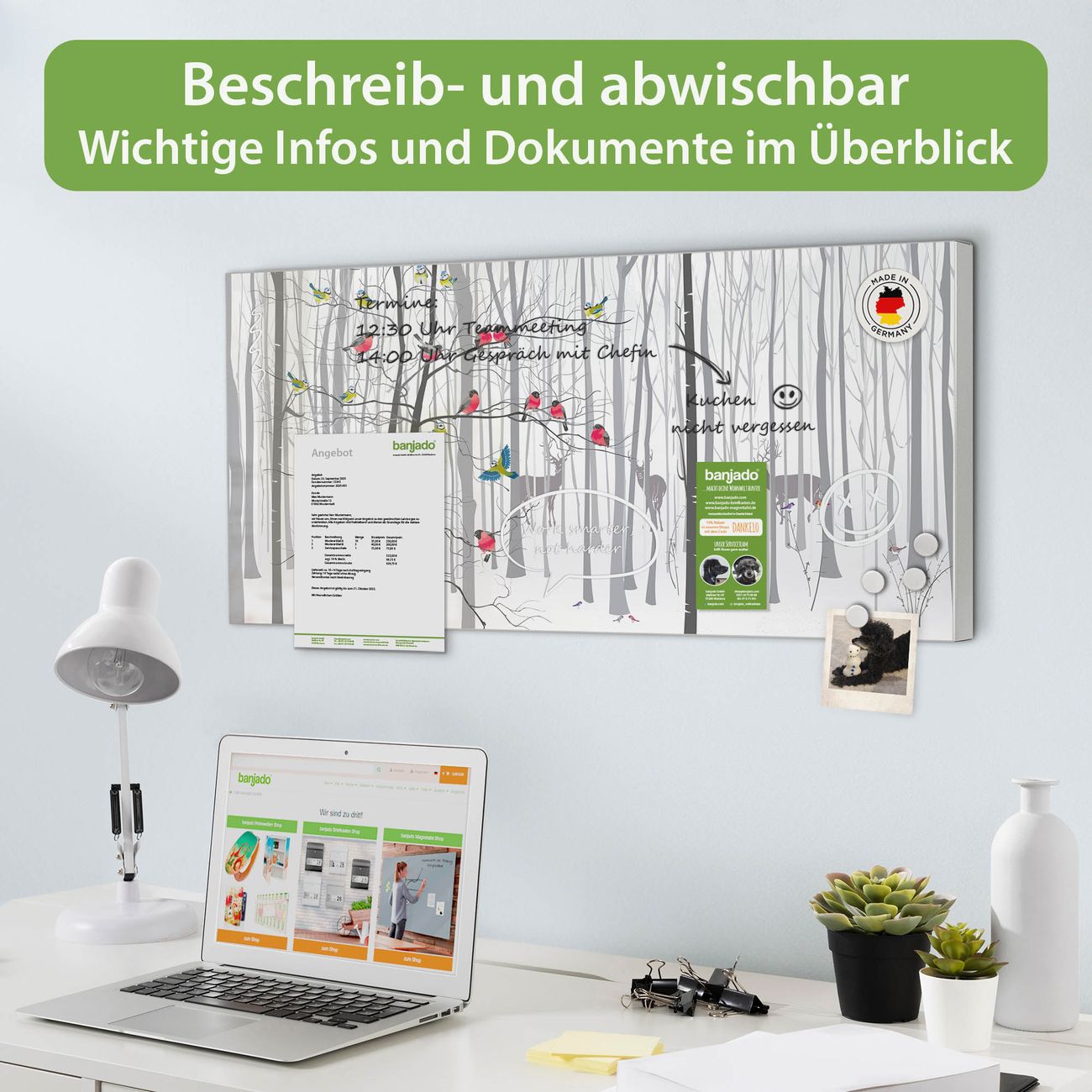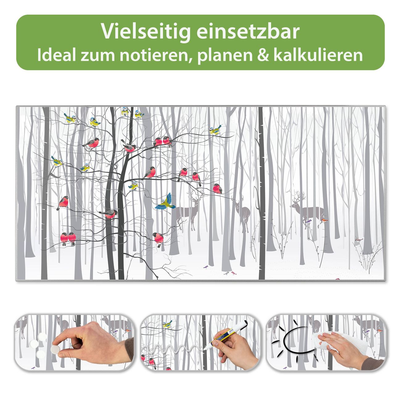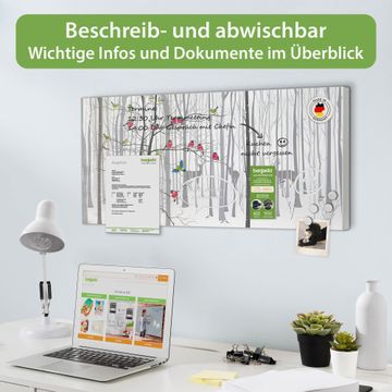 FUNKTION: Die banjado Magnettafel 78x37 cm im Design Motiv Winterwald vereint Funktionalität und modernes Wohndesign auf stilvolle Weise. Diese hochwertige Magnetwand aus Metall hilft Ihnen dabei, Notizen, Fotos, Termine, Einkaufslisten oder Rezepte übersichtlich zu organisieren. Als praktisches Memoboard sorgt sie für Struktur im Alltag und setzt gleichzeitig einen dekorativen Akzent an Ihrer Wand. DESIGN: Die Metalltafel besteht aus robustem, lackiertem Stahl und ist mit allen handelsüblichen Magneten nutzbar. Besonders praktisch ist die beschreibbare Oberfläche. Sie können die Magnettafel ganz einfach mit Kreidestiften beschriften und die Inhalte bei Bedarf mit einem feuchten Tuch wieder entfernen. So eignet sich das Memoboard ideal für Wochenpläne, Menüpläne, To Do Listen oder kreative Botschaften. DETAILS: Mit ihrem großzügigen Querformat von 78x37 cm bietet die Magnettafel ausreichend Platz für Ihre Organisation. Das Motiv Motiv Winterwald bringt eine warme, natürliche Optik in Küche, Flur, Büro oder Homeoffice und wirkt auch ohne Magnete oder Beschriftung wie ein modernes Wandbild. NUTZEN: Auf der Rückseite befinden sich vorgefertigte Löcher für eine schnelle und unkomplizierte Wandmontage. Jede banjado Magnettafel wird in Deutschland gefertigt und steht für Qualität, Langlebigkeit und liebevolle Verarbeitung. Dieses beschreibbare Memoboard ist die perfekte Kombination aus Metalltafel, Designobjekt und praktischer Magnetwand für Ihren Alltag. BANJADO: Wir sind ein kleines Team aus dem Herzen von Sachsen. Wir fertigen alle Artikel von Hand für Sie an, Sie erhalten keine preiswerte Importware. Auf Wunsch können Sie auch Ihr eigenes Foto auf die Magnettafel aufbringen, schreiben Sie uns an. Herzlichst, Ihr banjado-Team