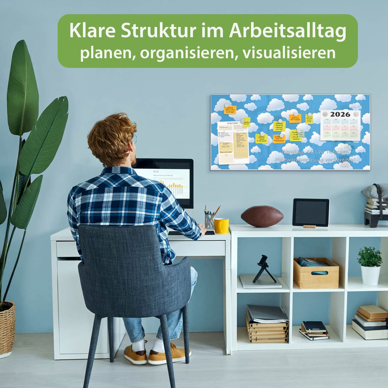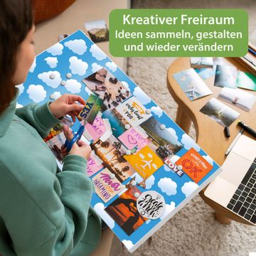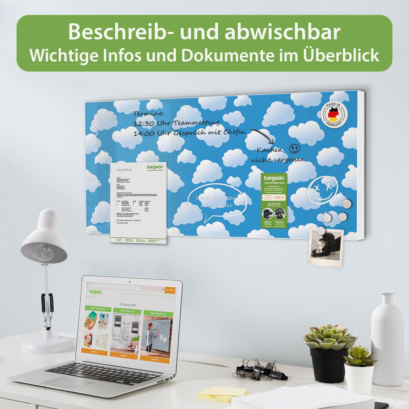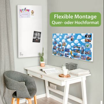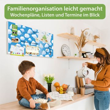 FUNKTION: Die banjado Magnettafel 78x37 cm im Design Motiv Wölkchen vereint Funktionalität und modernes Wohndesign auf stilvolle Weise. Diese hochwertige Magnetwand aus Metall hilft Ihnen dabei, Notizen, Fotos, Termine, Einkaufslisten oder Rezepte übersichtlich zu organisieren. Als praktisches Memoboard sorgt sie für Struktur im Alltag und setzt gleichzeitig einen dekorativen Akzent an Ihrer Wand. DESIGN: Die Metalltafel besteht aus robustem, lackiertem Stahl und ist mit allen handelsüblichen Magneten nutzbar. Besonders praktisch ist die beschreibbare Oberfläche. Sie können die Magnettafel ganz einfach mit Kreidestiften beschriften und die Inhalte bei Bedarf mit einem feuchten Tuch wieder entfernen. So eignet sich das Memoboard ideal für Wochenpläne, Menüpläne, To Do Listen oder kreative Botschaften. DETAILS: Mit ihrem großzügigen Querformat von 78x37 cm bietet die Magnettafel ausreichend Platz für Ihre Organisation. Das Motiv Motiv Wölkchen bringt eine warme, natürliche Optik in Küche, Flur, Büro oder Homeoffice und wirkt auch ohne Magnete oder Beschriftung wie ein modernes Wandbild. NUTZEN: Auf der Rückseite befinden sich vorgefertigte Löcher für eine schnelle und unkomplizierte Wandmontage. Jede banjado Magnettafel wird in Deutschland gefertigt und steht für Qualität, Langlebigkeit und liebevolle Verarbeitung. Dieses beschreibbare Memoboard ist die perfekte Kombination aus Metalltafel, Designobjekt und praktischer Magnetwand für Ihren Alltag. BANJADO: Wir sind ein kleines Team aus dem Herzen von Sachsen. Wir fertigen alle Artikel von Hand für Sie an, Sie erhalten keine preiswerte Importware. Auf Wunsch können Sie auch Ihr eigenes Foto auf die Magnettafel aufbringen, schreiben Sie uns an. Herzlichst, Ihr banjado-Team